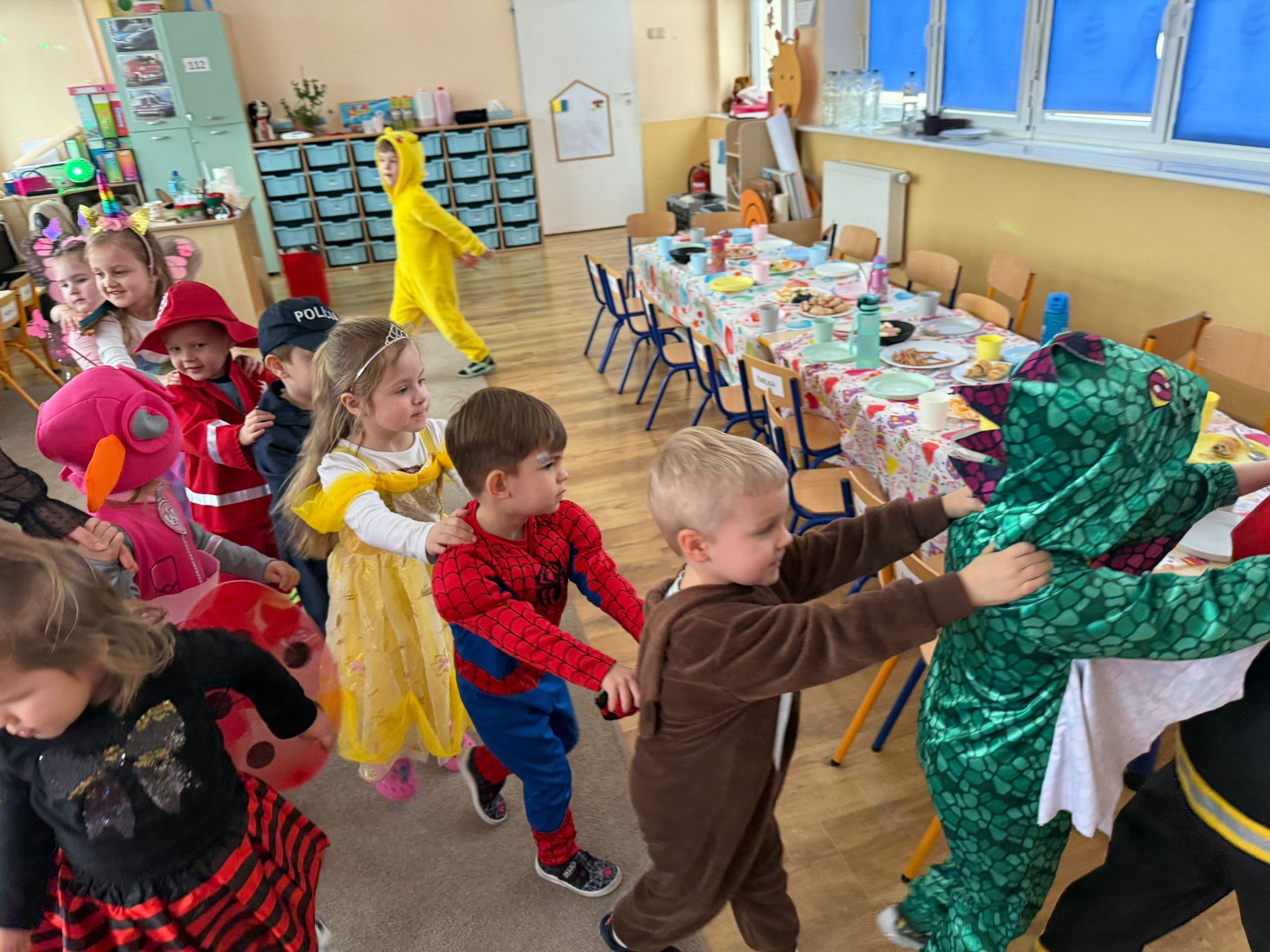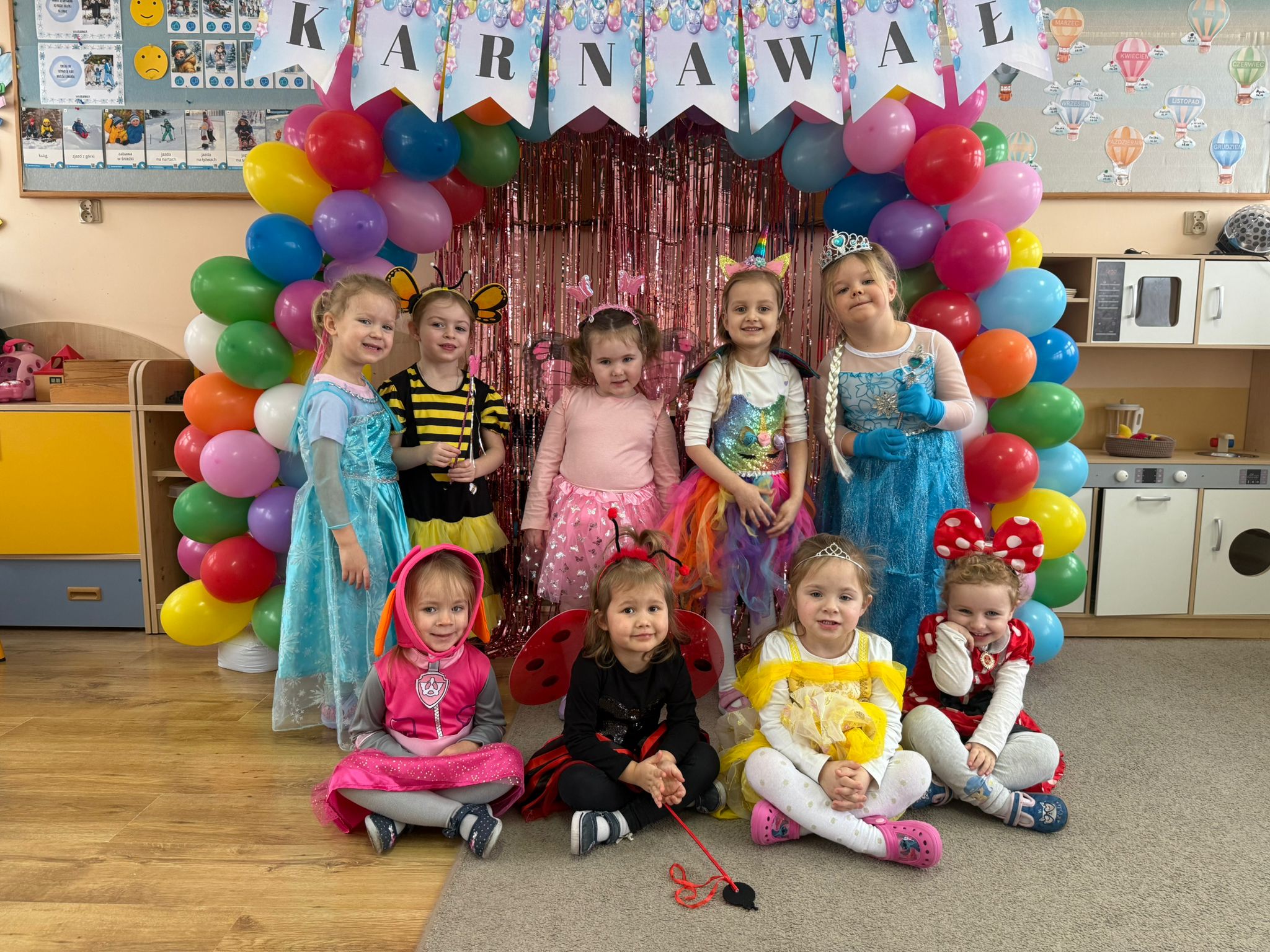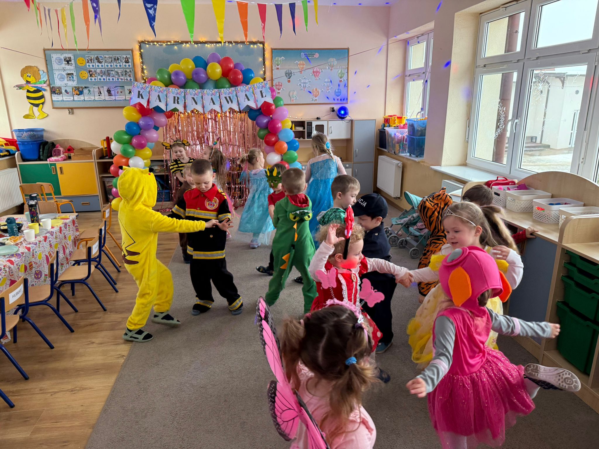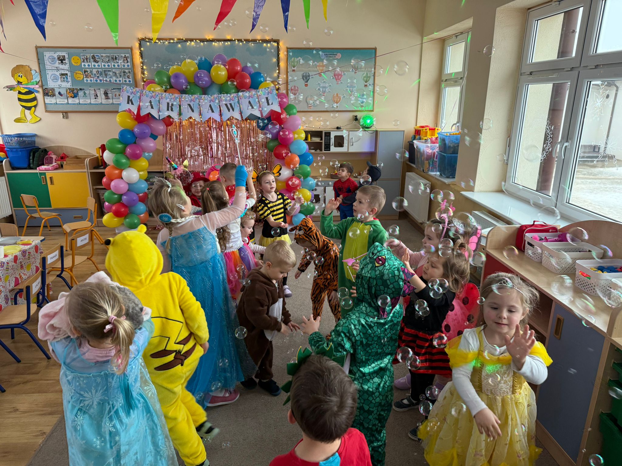 15 stycznia sala maluchów zamieniła się w prawdziwą, bajkową krainę, ponieważ odbył się wyjątkowy bal karnawałowy pełen światła, muzyki i radości. Od samego rana w sali panowała niezwykła atmosfera, a maluchy pojawiły się w barwnych i pomysłowych przebraniach- spotkać można było superbohaterów, księżniczki, smoki, dinozaury, a także wiele innych fantastycznych postaci. Dzieci z ogromnym entuzjazmem bawiły się i tańczyły w rytm skocznej muzyki, a wirujące wokół bańki mydlane oraz świetlne efekty dodawały zabawie prawdziwie karnawałowego charakteru. Na twarzach przedszkolaków nieustannie gościły uśmiechy, a radosny śmiech rozbrzmiewał w całej sali. Po tanecznych szaleństwach przyszedł czas na chwilę odpoczynku i pyszny poczęstunek przygotowany przez rodziców, za który serdecznie dziękujemy. Dzisiejszy bal dostarczył dzieciom wielu niezapomnianych wrażeń i na długo pozostanie w naszej pamięci jako dzień pełen kolorów, muzyki i wspólnej zabawy.