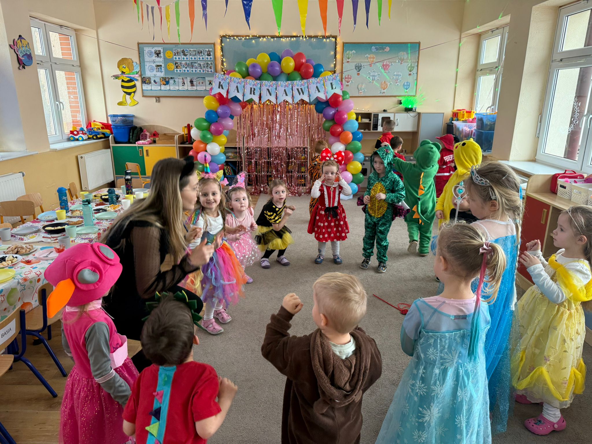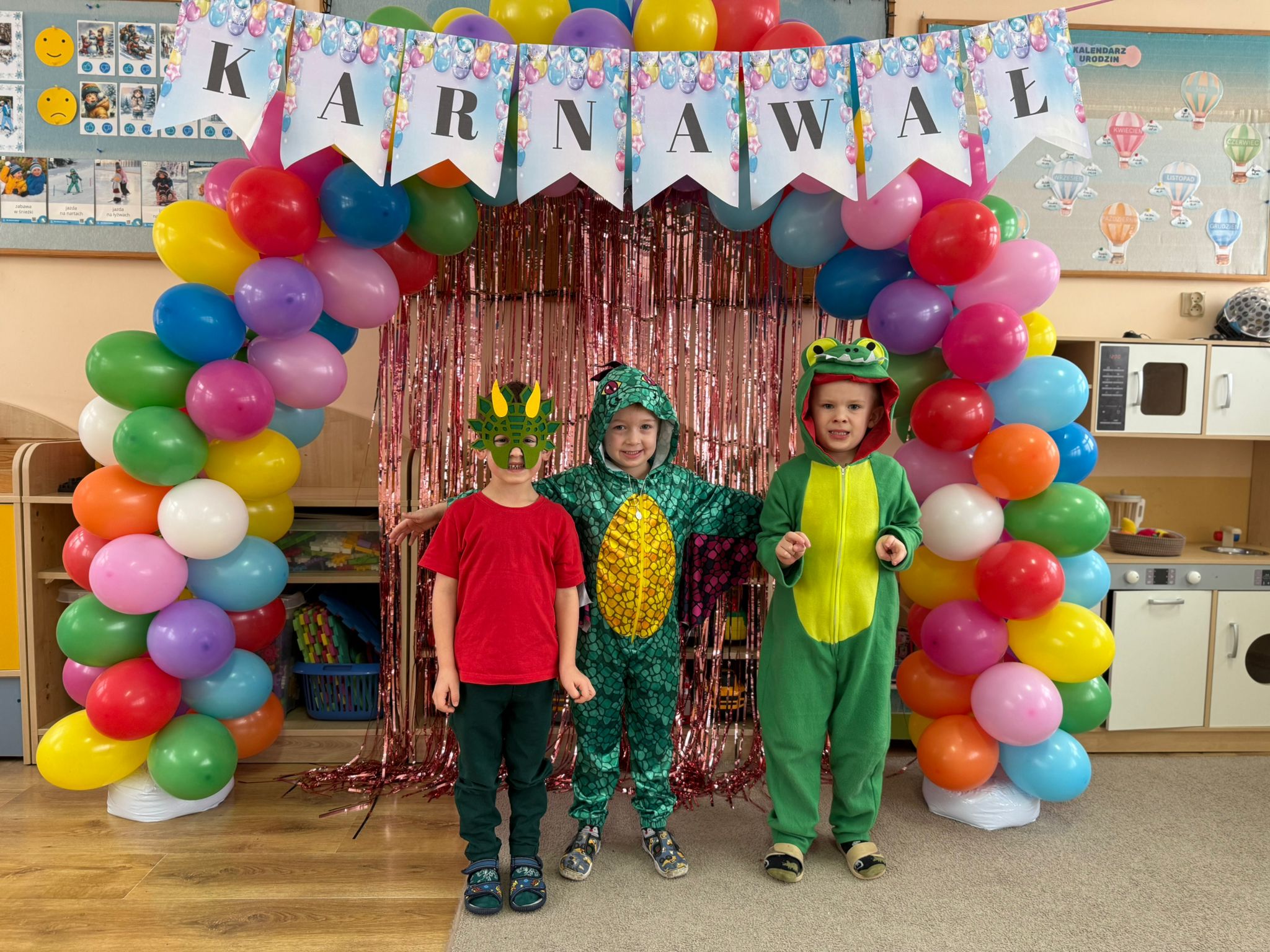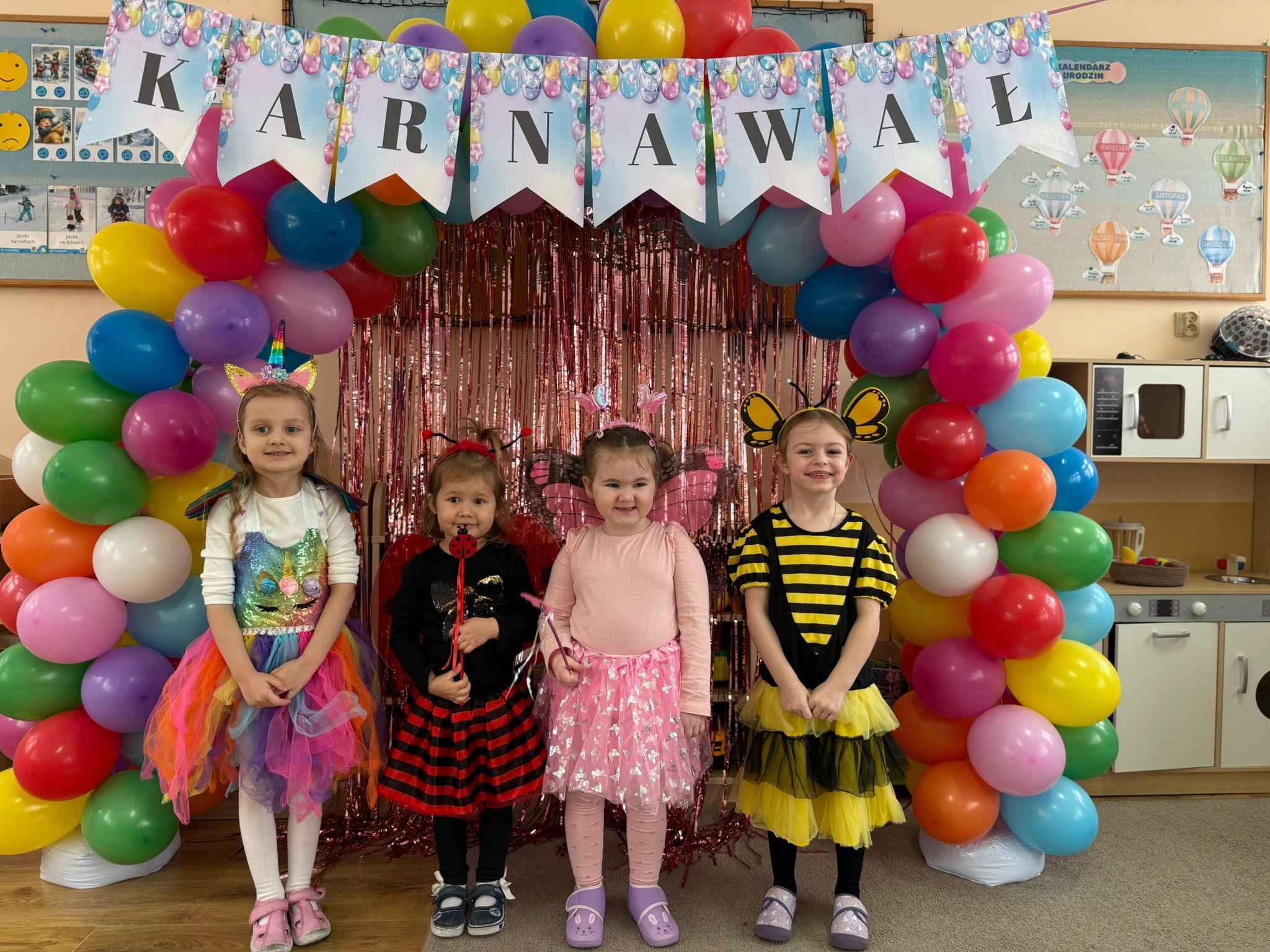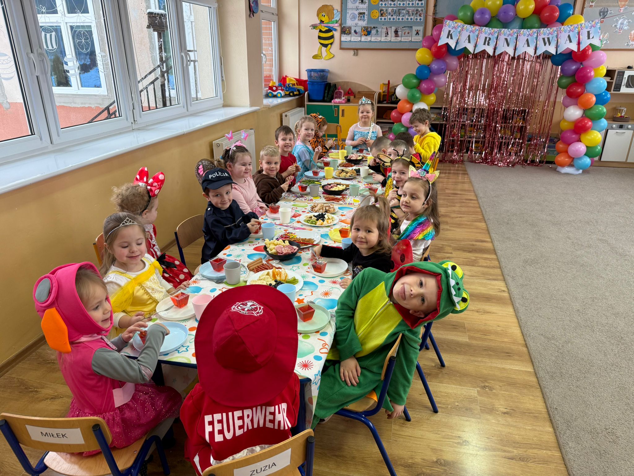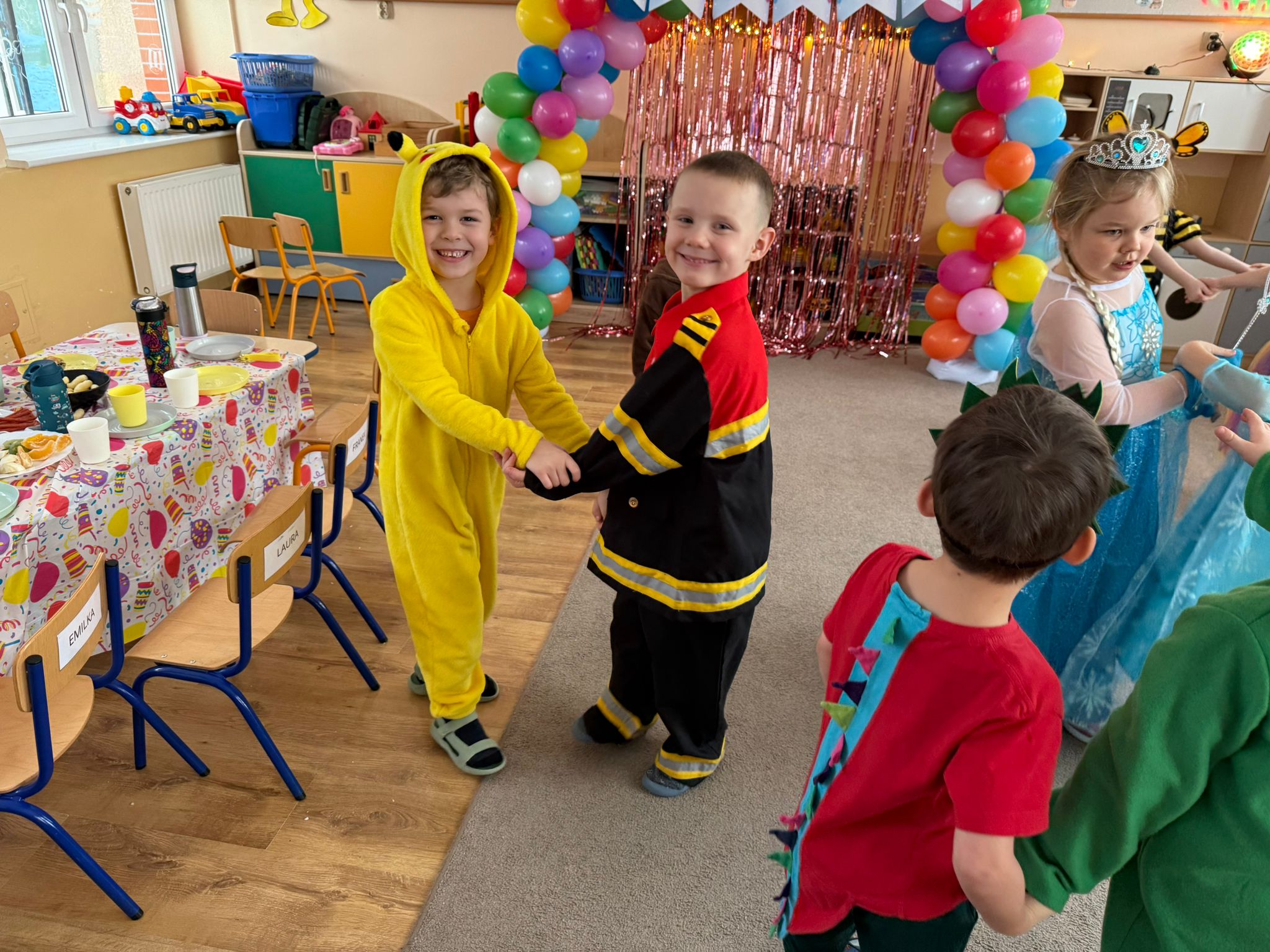 15 stycznia sala maluchów zamieniła się w prawdziwą, bajkową krainę, ponieważ odbył się wyjątkowy bal karnawałowy pełen światła, muzyki i radości. Od samego rana w sali panowała niezwykła atmosfera, a maluchy pojawiły się w barwnych i pomysłowych przebraniach- spotkać można było superbohaterów, księżniczki, smoki, dinozaury, a także wiele innych fantastycznych postaci. Dzieci z ogromnym entuzjazmem bawiły się i tańczyły w rytm skocznej muzyki, a wirujące wokół bańki mydlane oraz świetlne efekty dodawały zabawie prawdziwie karnawałowego charakteru. Na twarzach przedszkolaków nieustannie gościły uśmiechy, a radosny śmiech rozbrzmiewał w całej sali. Po tanecznych szaleństwach przyszedł czas na chwilę odpoczynku i pyszny poczęstunek przygotowany przez rodziców, za który serdecznie dziękujemy. Dzisiejszy bal dostarczył dzieciom wielu niezapomnianych wrażeń i na długo pozostanie w naszej pamięci jako dzień pełen kolorów, muzyki i wspólnej zabawy.
