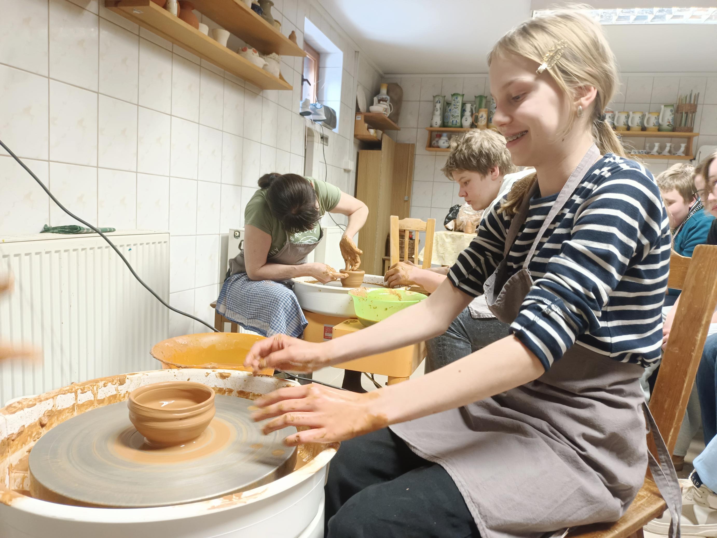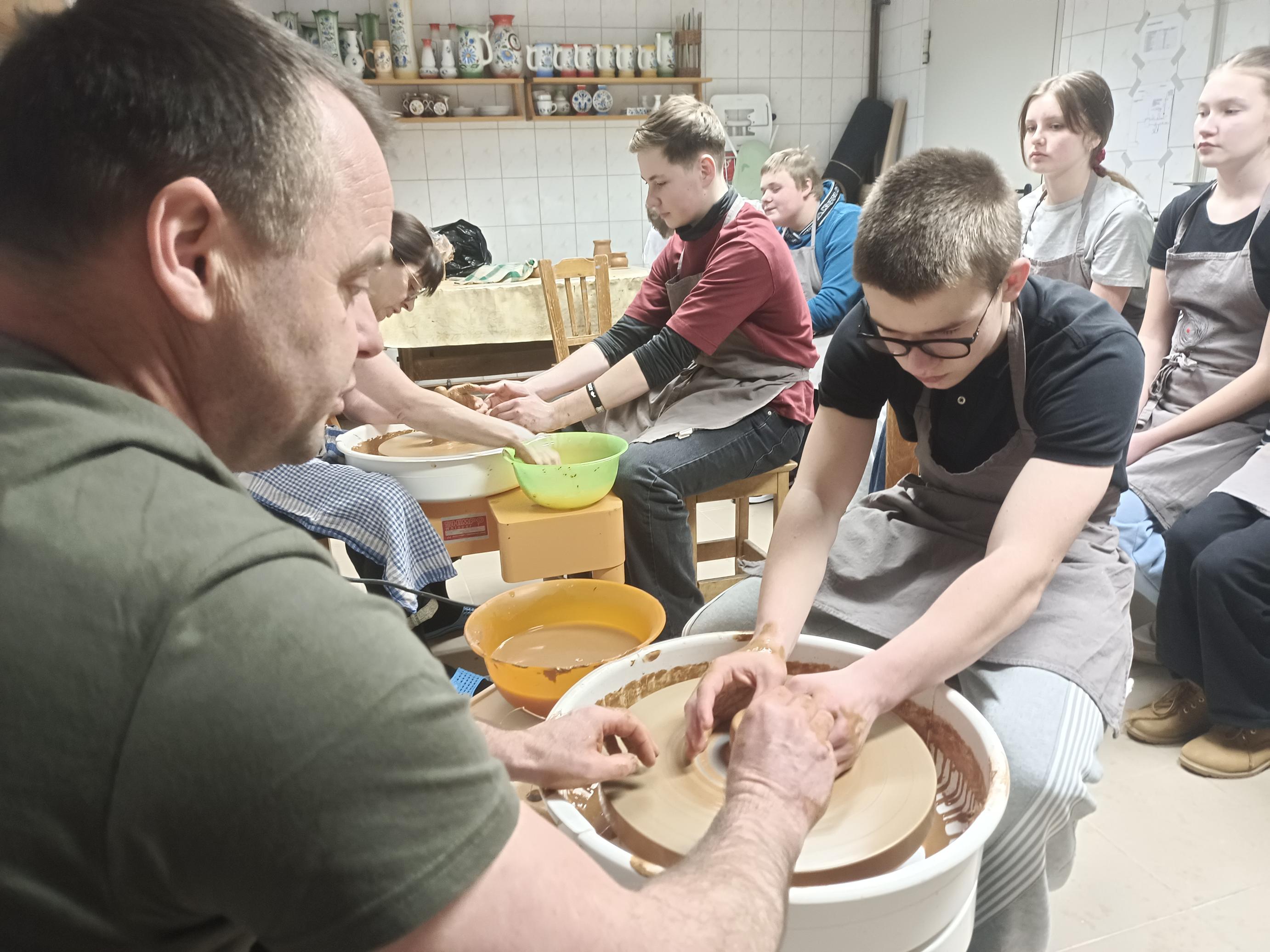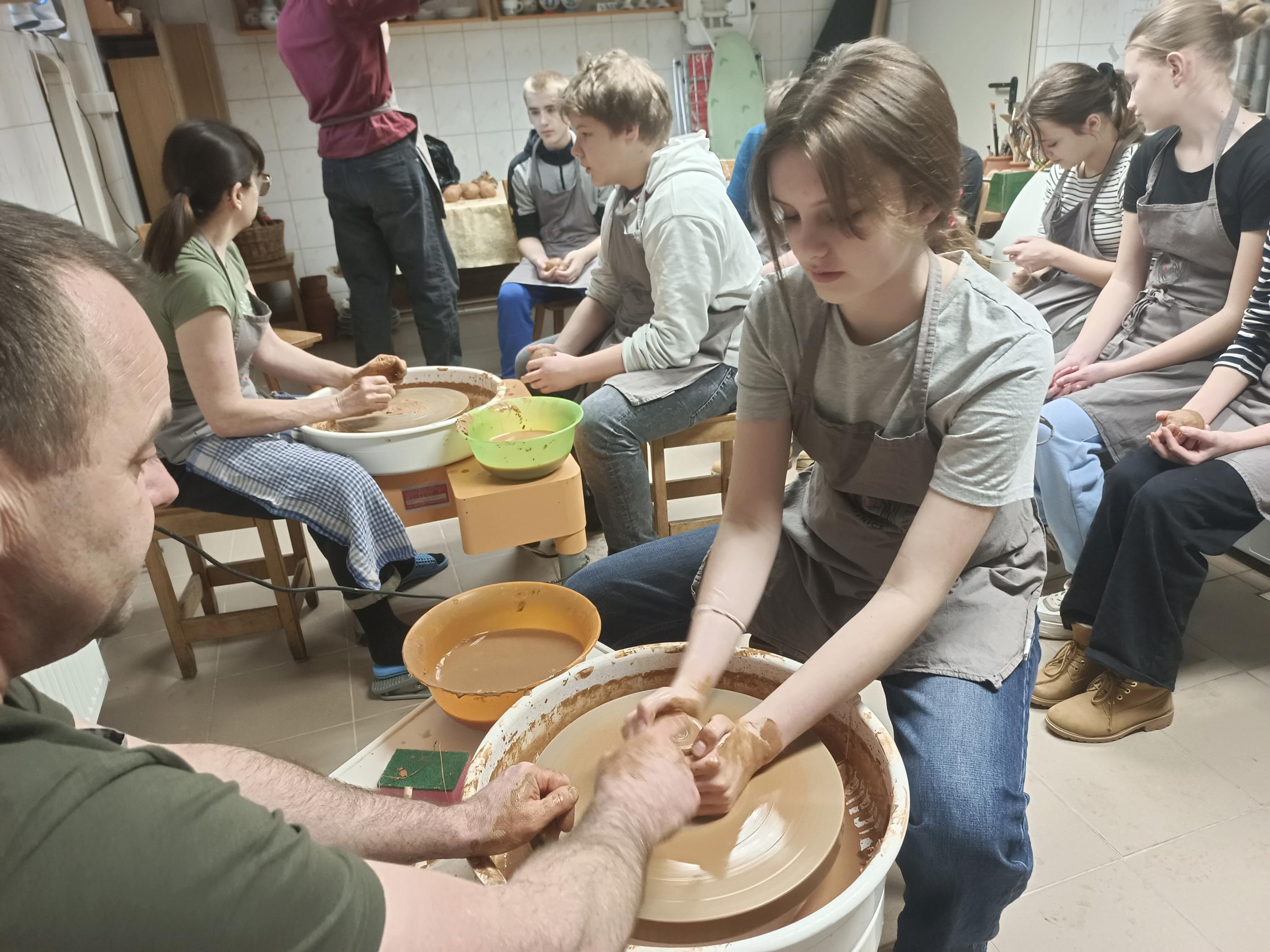 Najpierw uczniowie poznali historię garncarstwa na Pomorzu i tajniki lokalnego rękodzieła, a potem… sami zabrali się do działania! Pod okiem prowadzących warsztaty lepili miseczki, kubki i wazoniki, eksperymentując z kształtami i zdobieniami. Każde naczynie stawało się małym dziełem sztuki, a radość i śmiech towarzyszyły im przy każdym obrocie koła garncarskiego.