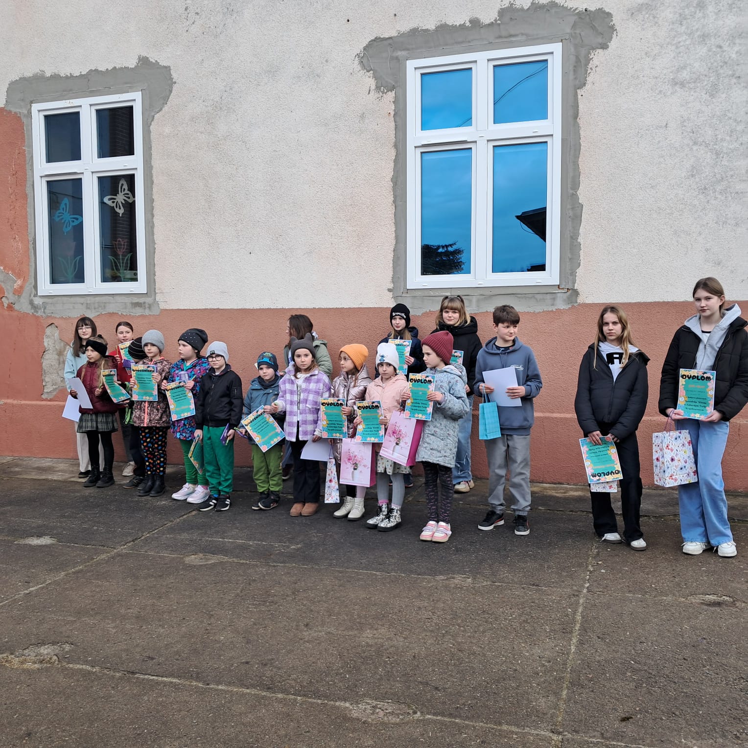 Podczas apelu dzieci z przedszkola i uczniowie klas I-VIII zaprezentowali wykonane przez siebie plakaty, które składały się z kilku części. Każda z nich była przygotowywana przez inne osoby, a następnie wszystkie elementy zostały połączone w jedną całość. Dzięki temu powstały ciekawe i kolorowe prace, które przyciągały uwagę i dobrze przedstawiały omawiany temat. Wspólne tworzenie plakatów sprzyjało współpracy oraz rozwijało kreatywność uczniów.