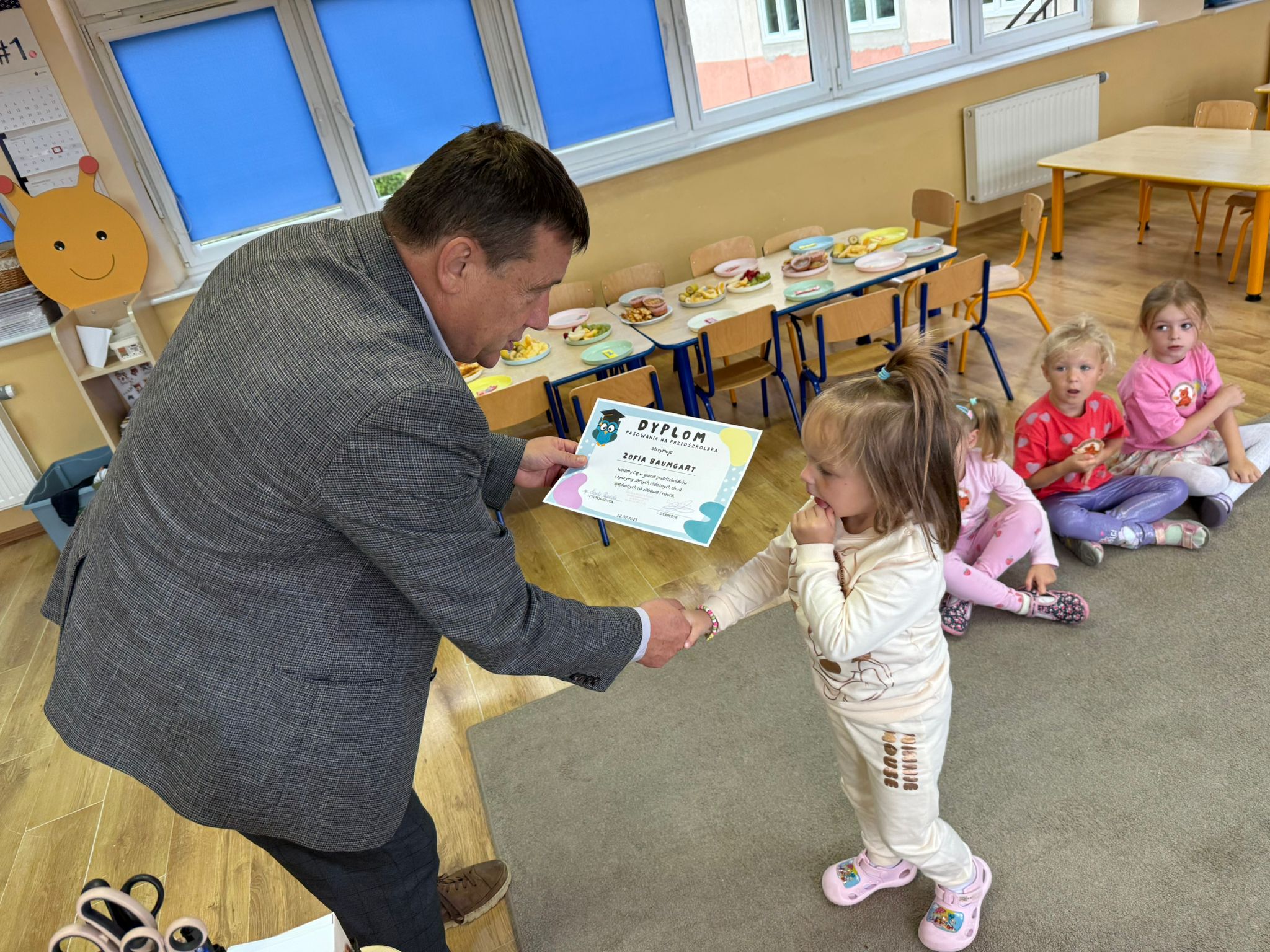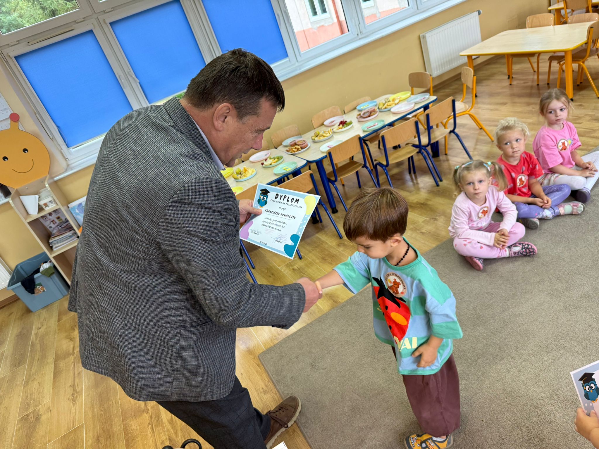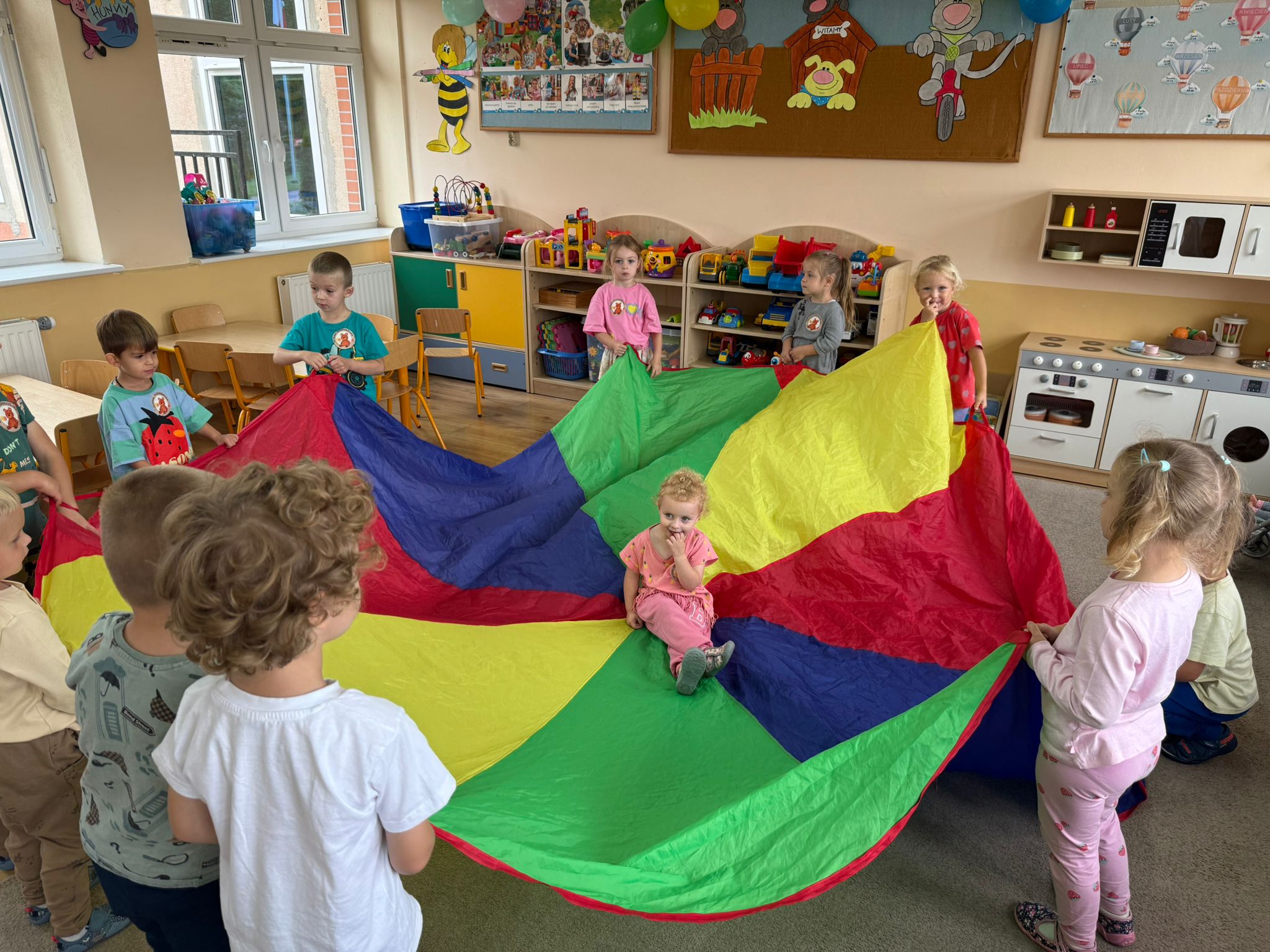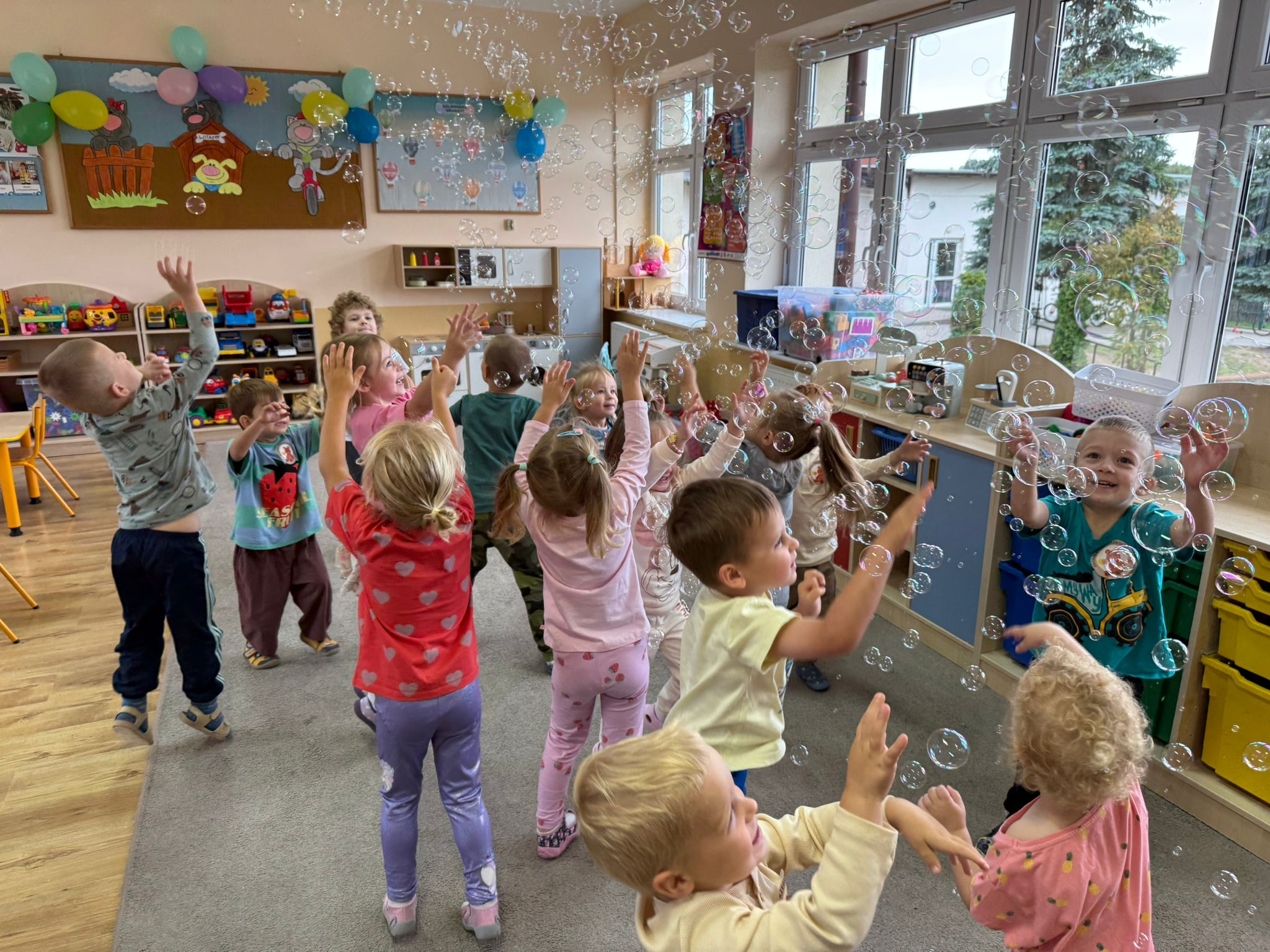 Dziś w naszej sali zapanowała prawdziwa kraina radości! Maluchy świętowały Dzień Przedszkolaka, a cały dzień wypełniony był śmiechem, tańcem i wesołą muzyką. W powietrzu unosiły się zaczarowane bańki mydlane, które dzieci goniły z radością, a kolorowa chusta animacyjna zamieniła się w tęczowy dywan do wspólnych zabaw. Po harcach czekał na dzieci mały, pyszny poczęstunek, który dodał im nowych sił do dalszej zabawy. Ten dzień miał także szczególny charakter – Pan Dyrektor dokonał uroczystego pasowania nowych dzieci na przedszkolaków. To wydarzenie sprawiło, że każdy poczuł się wyjątkowo i od tej chwili należy już do wielkiej przedszkolnej rodziny. Wszystkim naszym przedszkolakom życzymy samych radosnych chwil, uśmiechu i wspaniałych zabaw każdego dnia!
