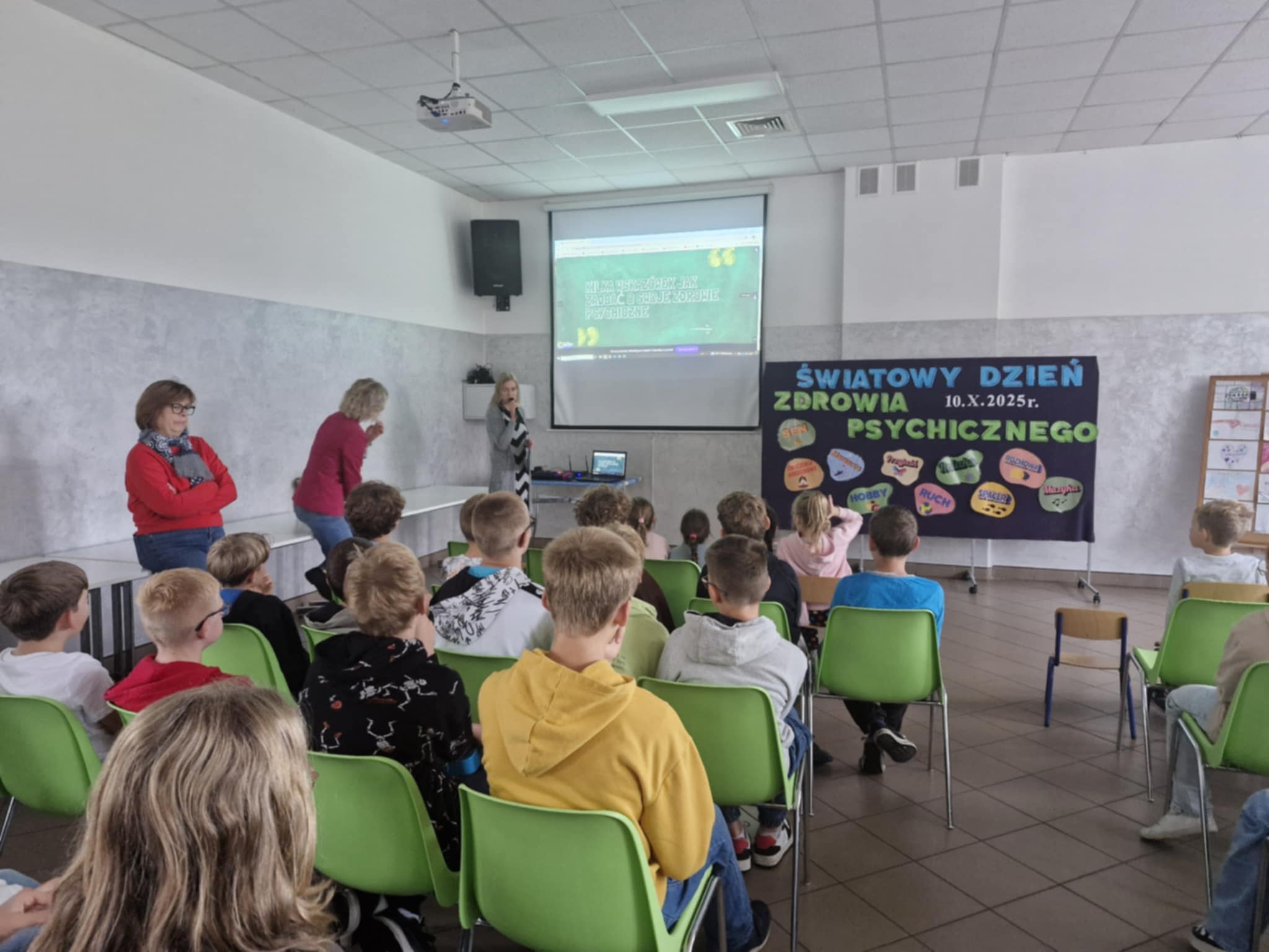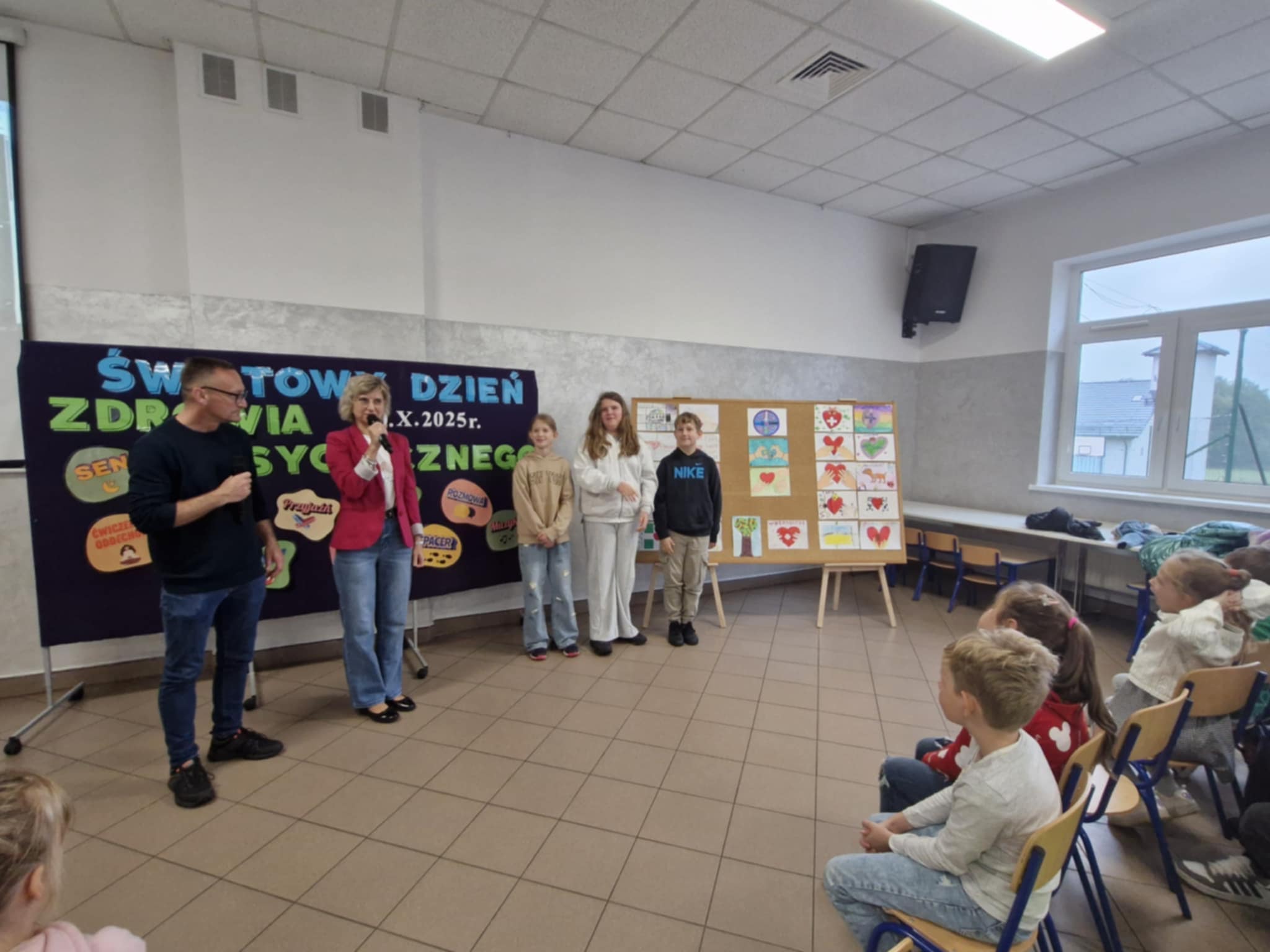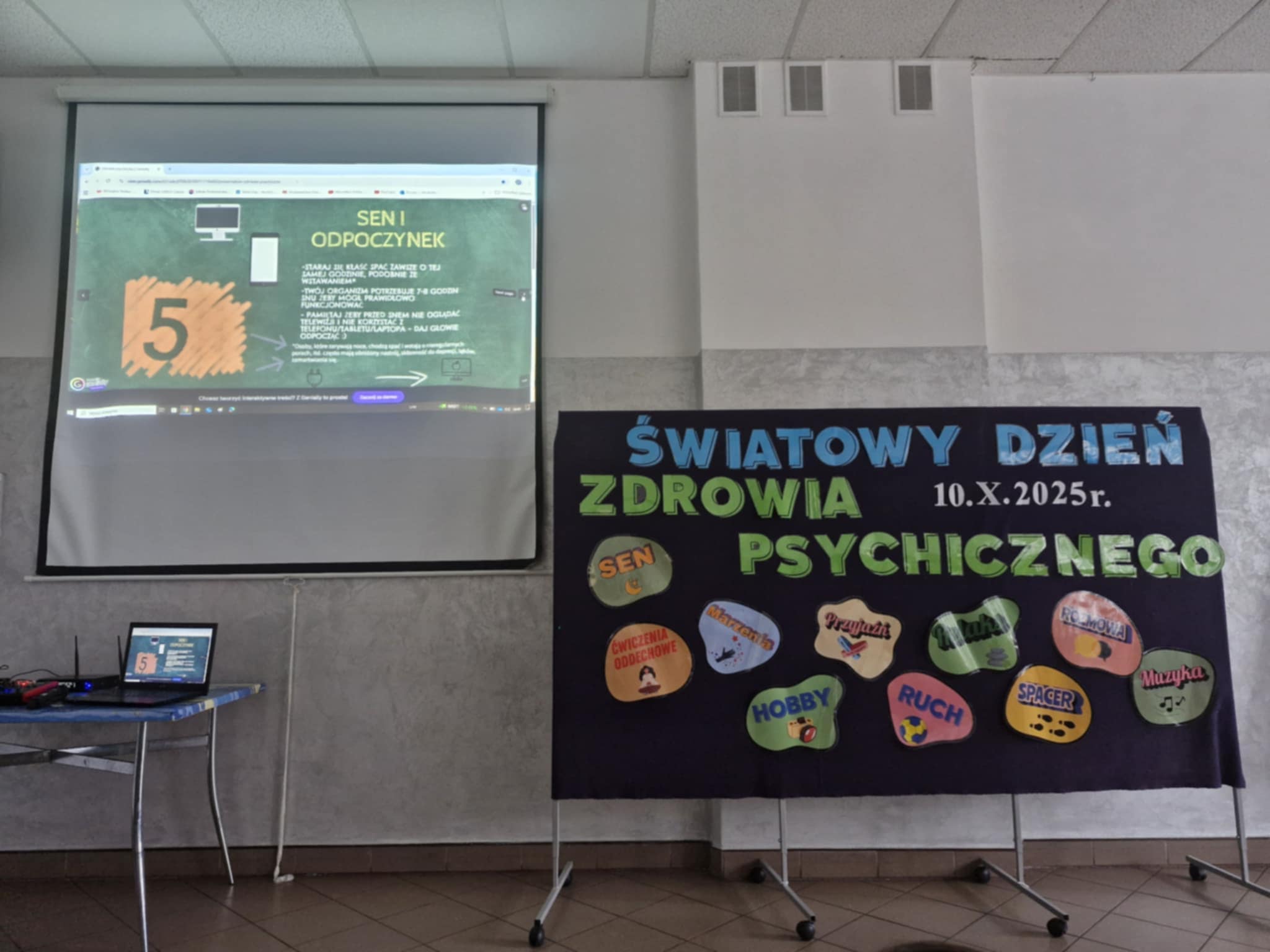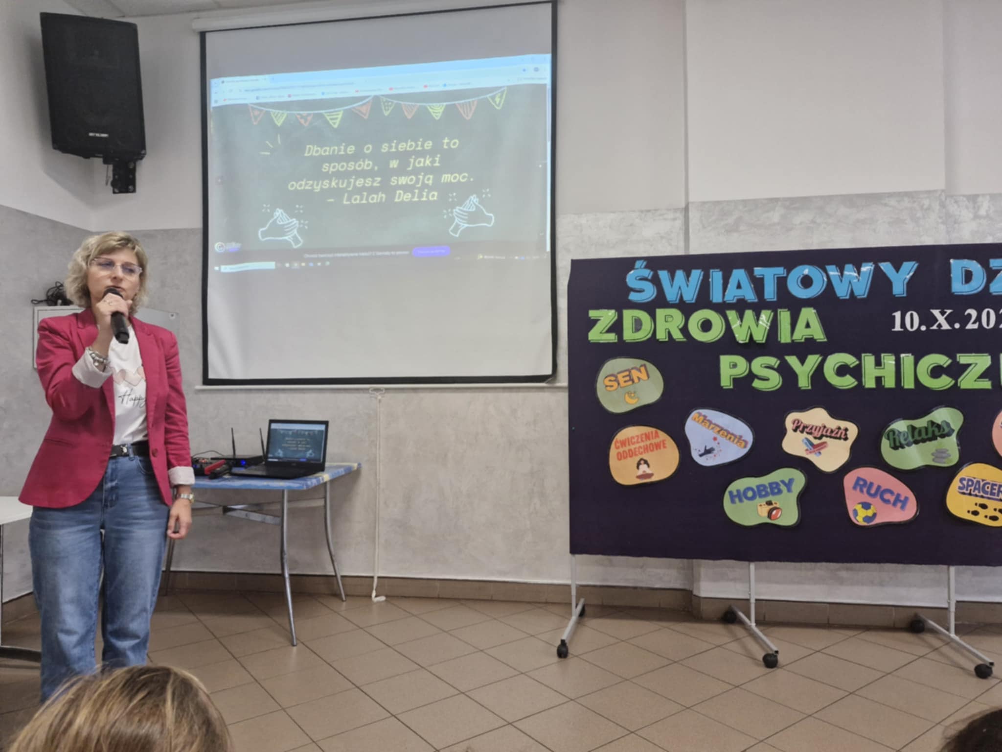 Z tej okazji w środę 08 października w naszej szkole odbył się apel, podczas którego Pani psycholog Monika Stobiecka przedstawiła prezentacje i omówiła najważniejsze czynniki wpływające na nasze samopoczucie. Podkreśliła, że zdrowie psychiczne jest tak samo ważne jak zdrowie fizyczne. Wpływa na to, jak myślimy, czujemy i radzimy sobie z codziennymi problemami, jak ważne jest rozmawianie o swoich emocjach, szukanie pomocy, gdy czujemy się źle oraz wspieranie innych. Pamiętajmy, że każdy z nas ma prawo czuć się dobrze psychicznie, a rozmowa i wsparcie mogą naprawdę pomóc.