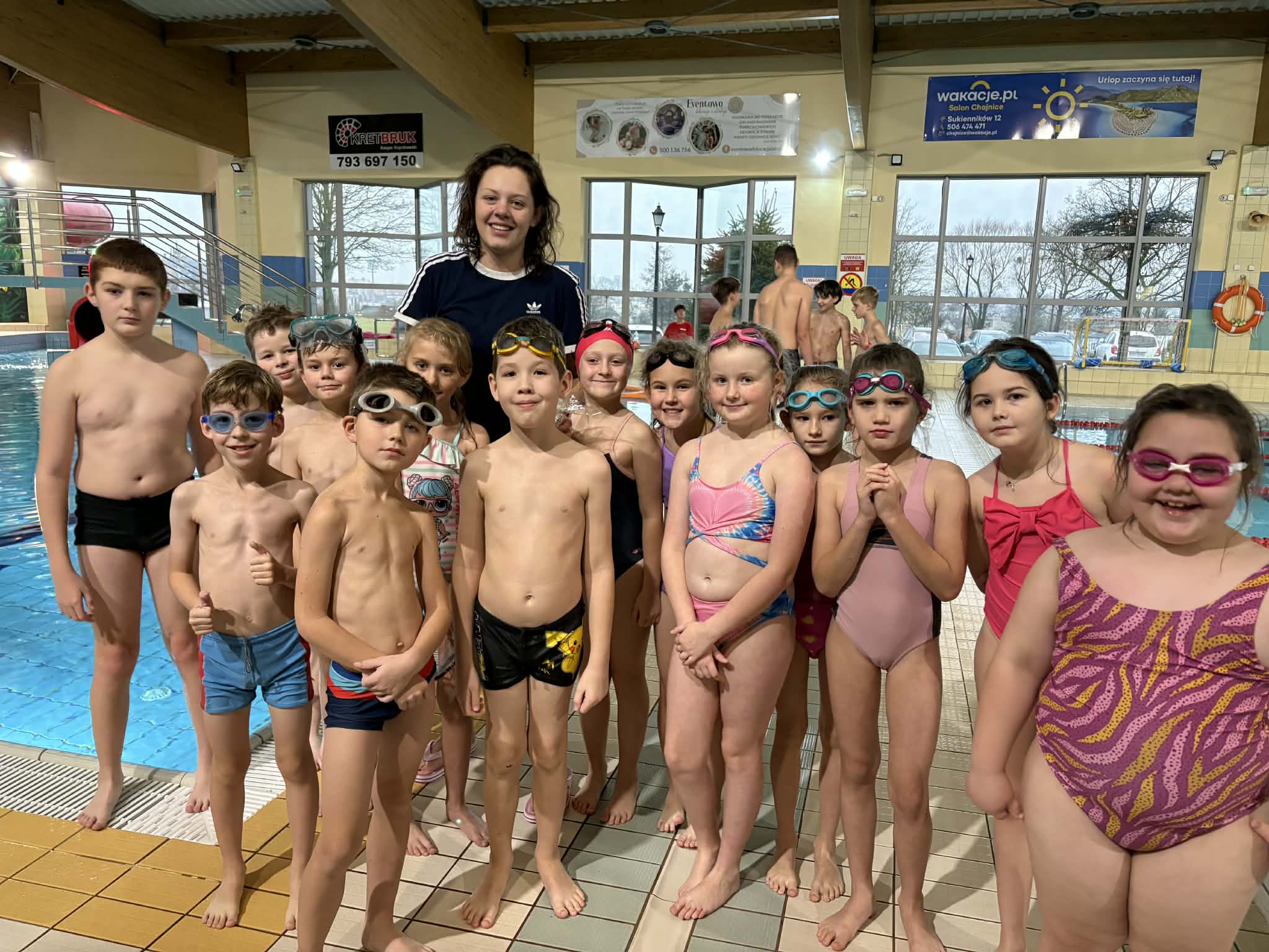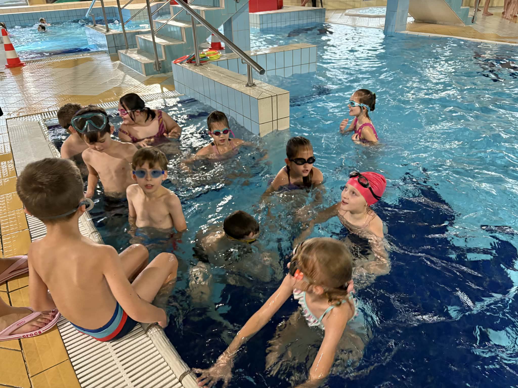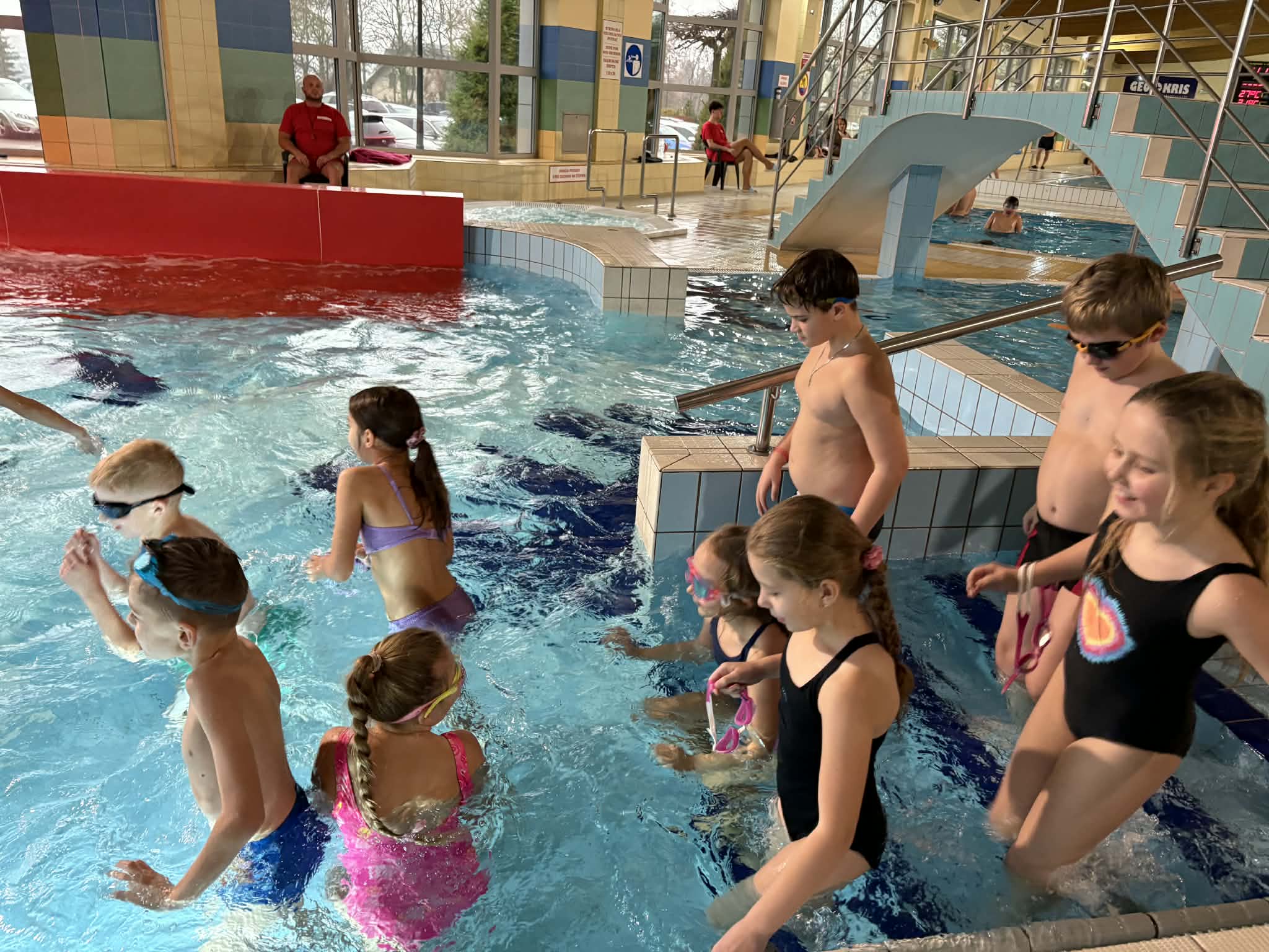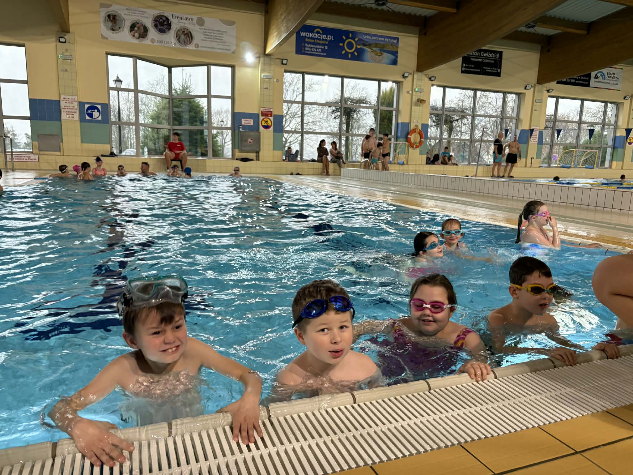 Zakończyliśmy cykl dziesięciu wyjazdów na lekcje nauki pływania i zabaw w wodzie. W trakcie zajęć uczniowie stopniowo oswajali się z wodą, nabierali pewności siebie oraz poznawali podstawowe techniki pływackie. Na ostatnich zajęciach odbył się egzamin podsumowujący zdobyte umiejętności. Najlepszymi pływakami zostali Maksymilian Kołodziejski i Hubert Wojciechowski, uzyskali oni dyplom II stopnia podstawowego. Dyplom I stopnia otrzymali: Wiktoria Szczepanska i Aleksandra Stoltmann z klasy II oraz Pola Świerko, Julia Gostomczyk, Franciszek Borzyszkowski z klasy III. Należy podkreślić, że każde dziecko zrobiło znaczący postęp i z zaangażowaniem uczestniczyło w nauce. Najwięcej radości sprawiły uczniom zabawy w wodzie, a szczególnie wyjątkowa atrakcja przygotowana na zakończenie - pływanie w dmuchanej bańce. Była to dla dzieci ogromna frajda i niezapomniane przeżycie, które wywołało mnóstwo śmiechu i pozytywnych emocji. Wyjazdy okazały się nie tylko okazją do nauki, ale również do świetnej zabawy i integracji. Dzieci wróciły pełne entuzjazmu i nowych doświadczeń.