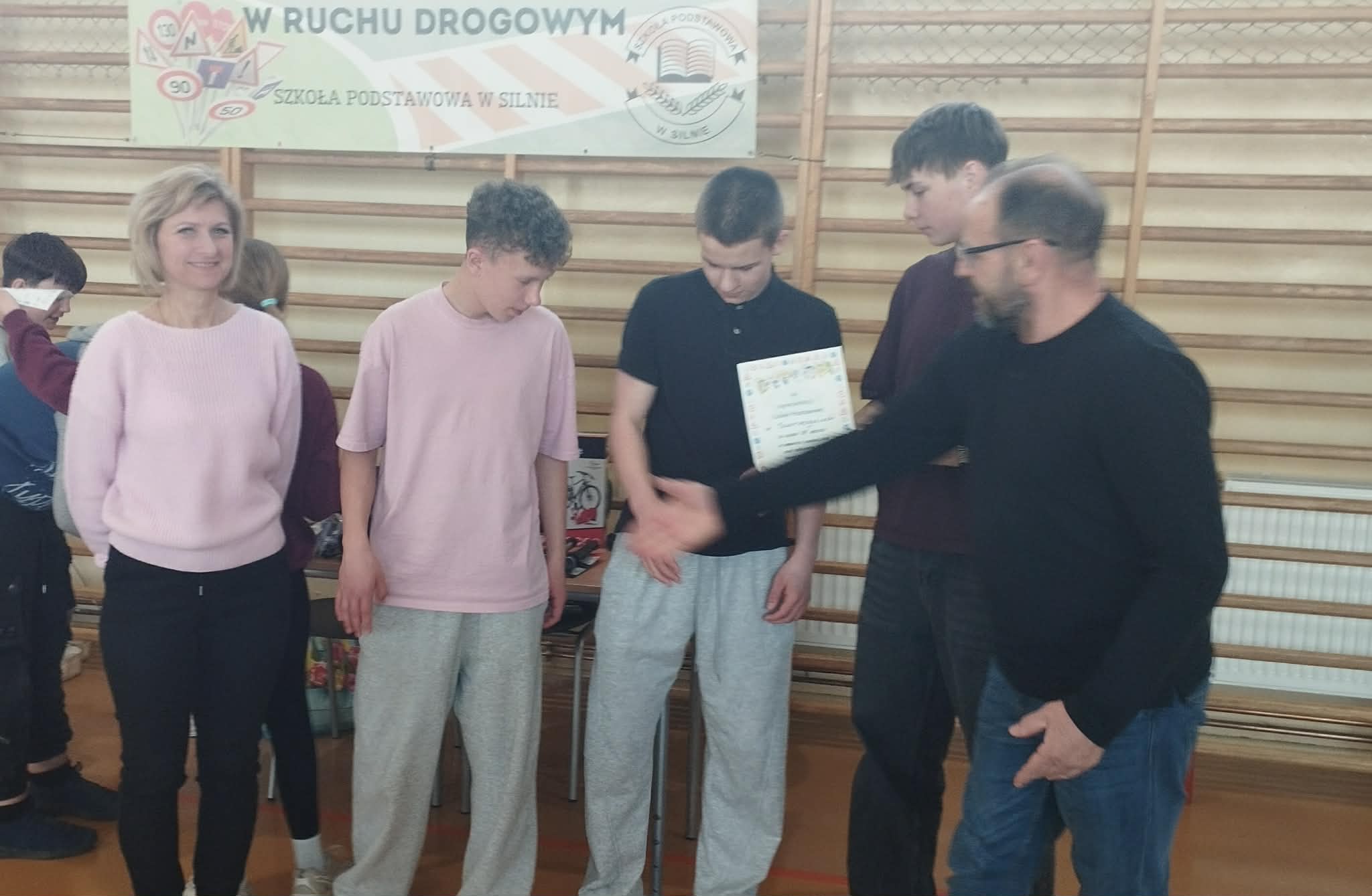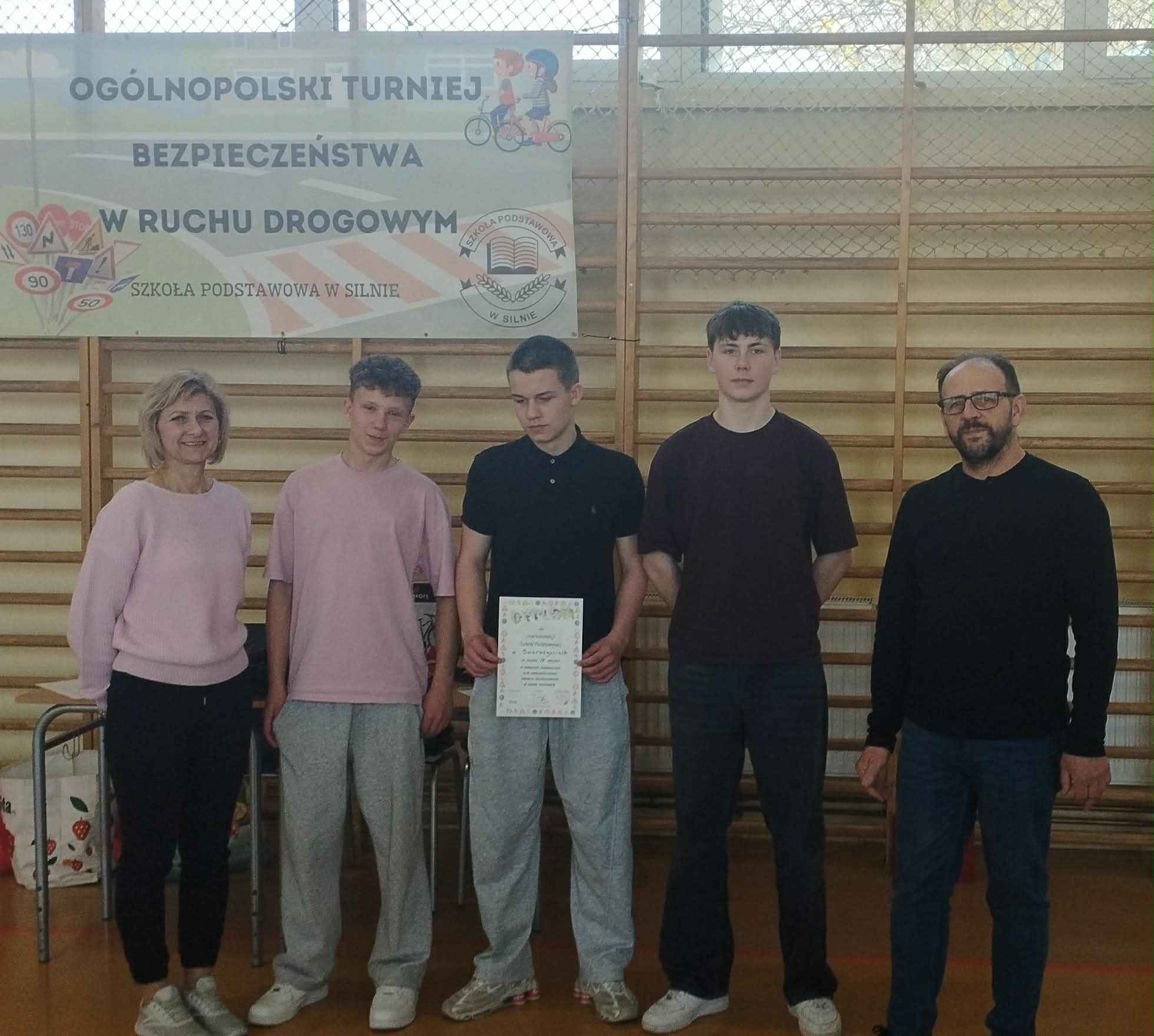 15 kwietnia 2026 r. w Szkole Podstawowej w Silnie odbył się Ogólnopolski Turniej Bezpieczeństwa w Ruchu Drogowym, w którym wzięli udział uczniowie szkół z terenu naszej gminy. Naszą szkołę w kategorii starszych uczestników (Grupa II) reprezentowali uczniowie z kl. VII i VIII. Drużyna w składzie: Jan Hapka, Filip Werachowski i Tymoteusz Hohn zajęli IV miejsce spośród 8 drużyn.
