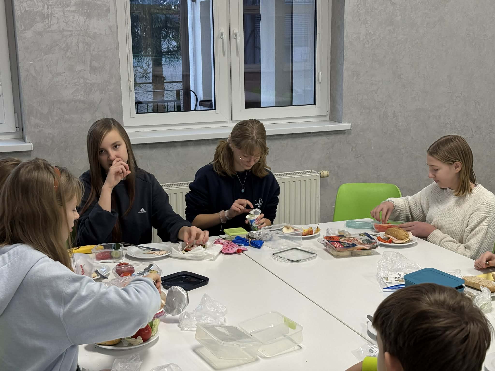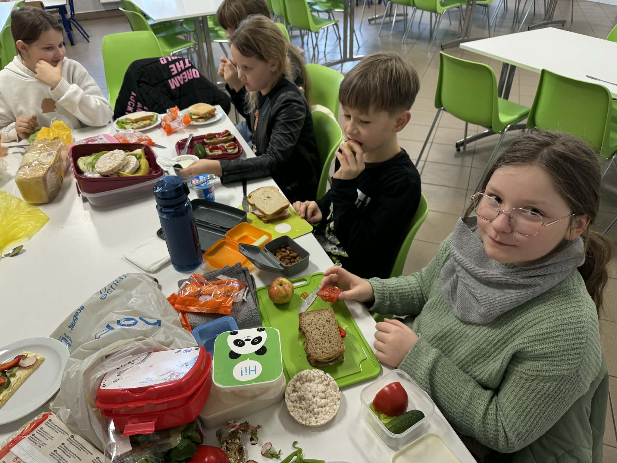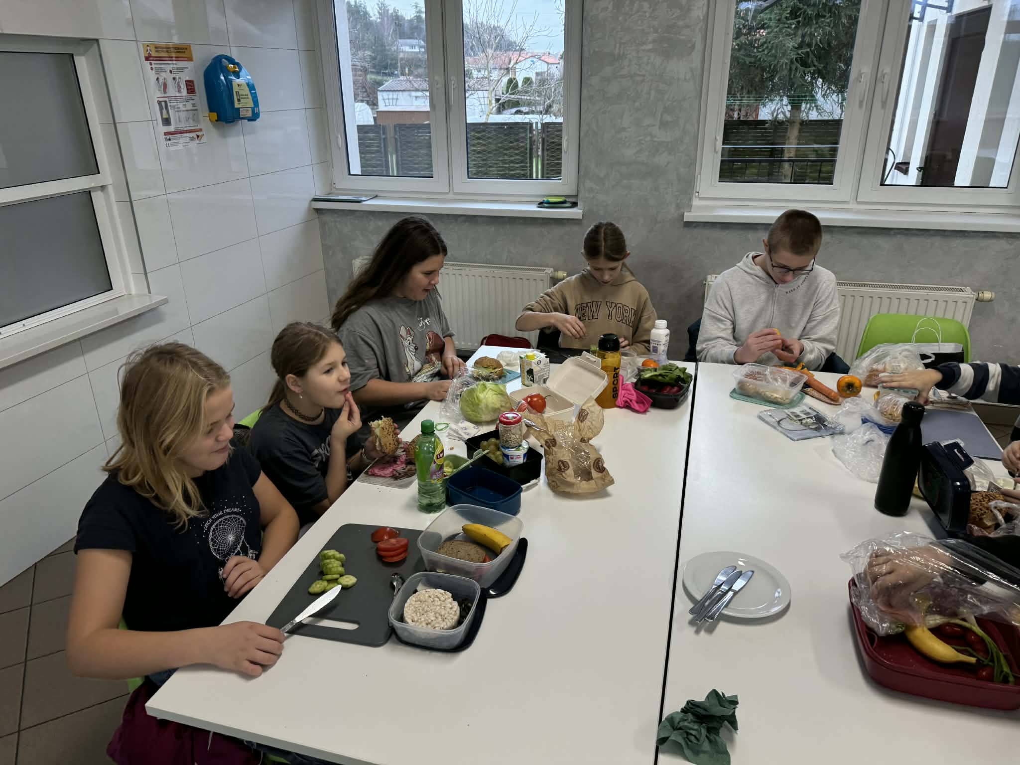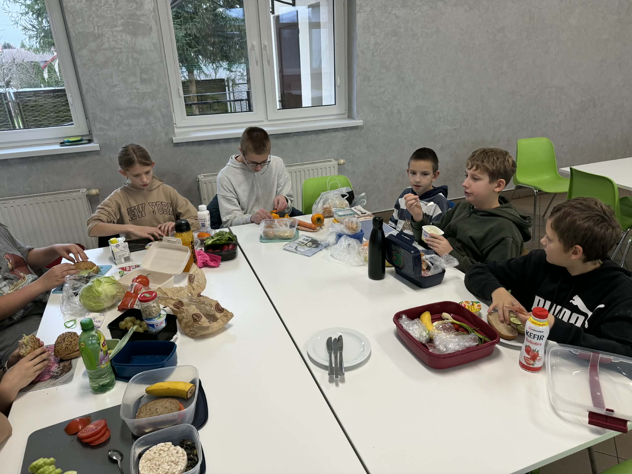W ramach zajęć edukacji zdrowotnej przeprowadzono praktyczne zajęcia kulinarne dotyczące planowania zdrowego drugiego śniadania do szkoły. Odbyły się one w szkolnej stołówce, gdzie uczniowie pracowali na przyniesiony przez siebie produktach. Uczniowie dowiedzieli się jak komponować zbilansowany posiłek oraz jakie znaczenie ma regularne jedzenie dla koncentracji i samopoczucia w ciągu dnia. Uczniowie łączyli produkty z różnych grup żywności, uczyli się praktycznych umiejętności kulinarnych i zwracali uwagę na estetykę podania posiłku. Wspólne przygotowywanie kanapek, sałatek, jogurtów z dodatkami i prostych przekąsek pozwoliło uczniom lepiej zrozumieć, jak w łatwy sposób stworzyć wartościowe drugie śniadanie. Zajęcia zakończyły się wspólną degustacją.