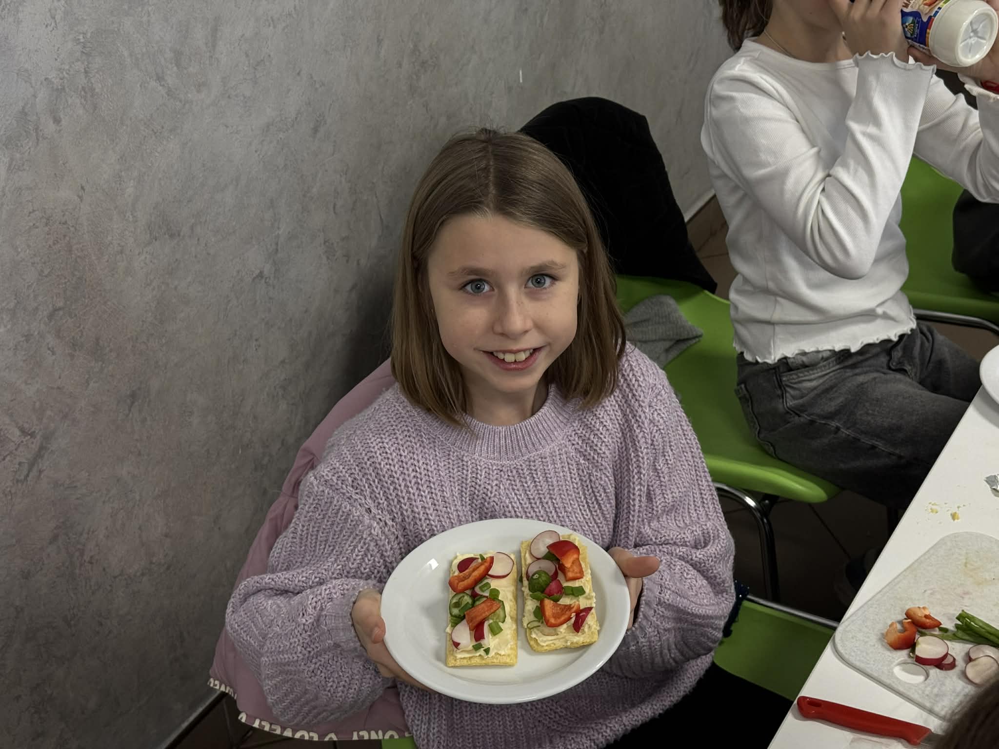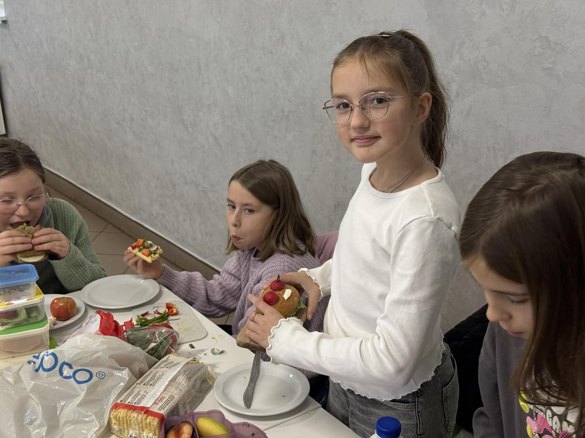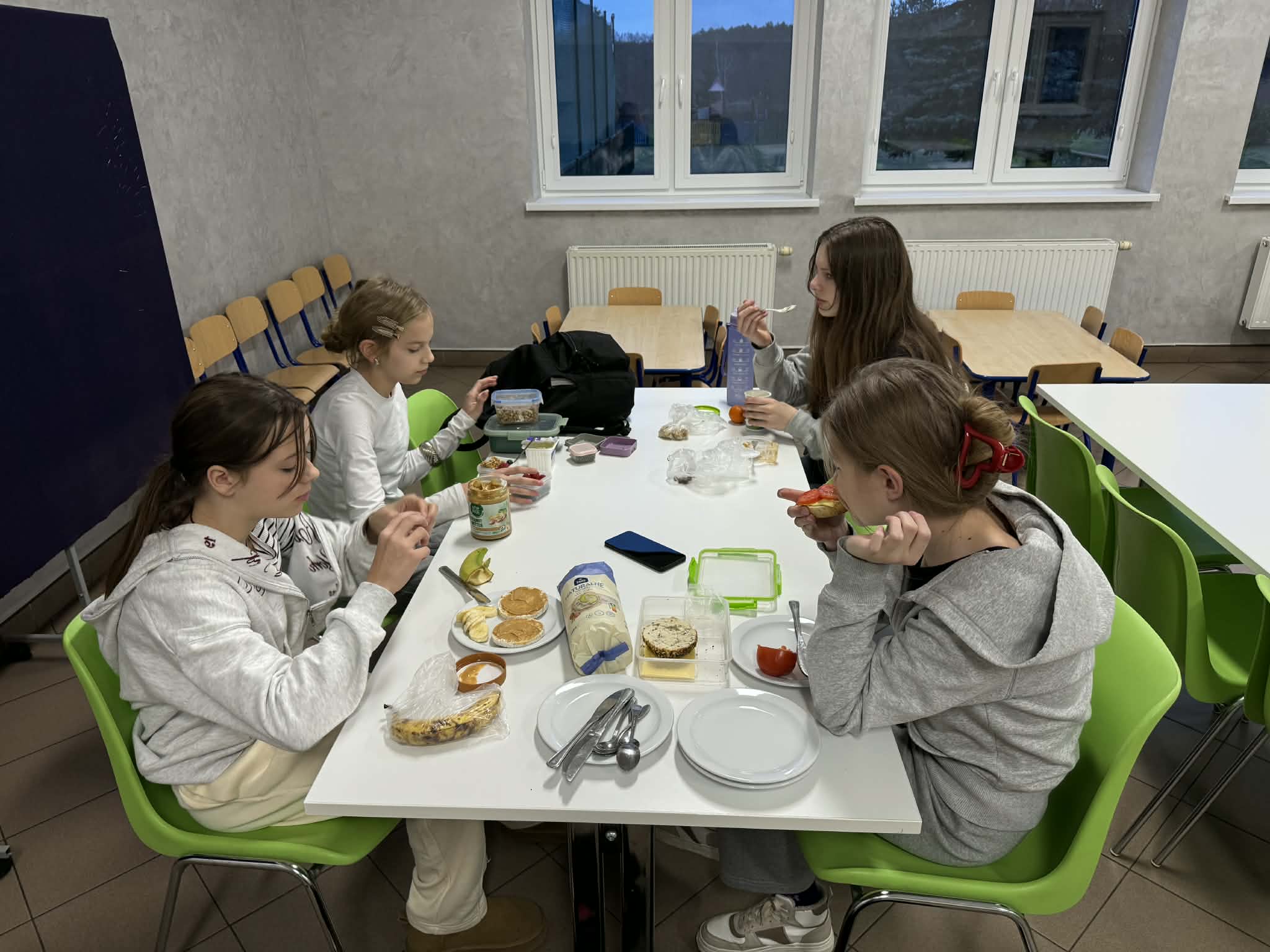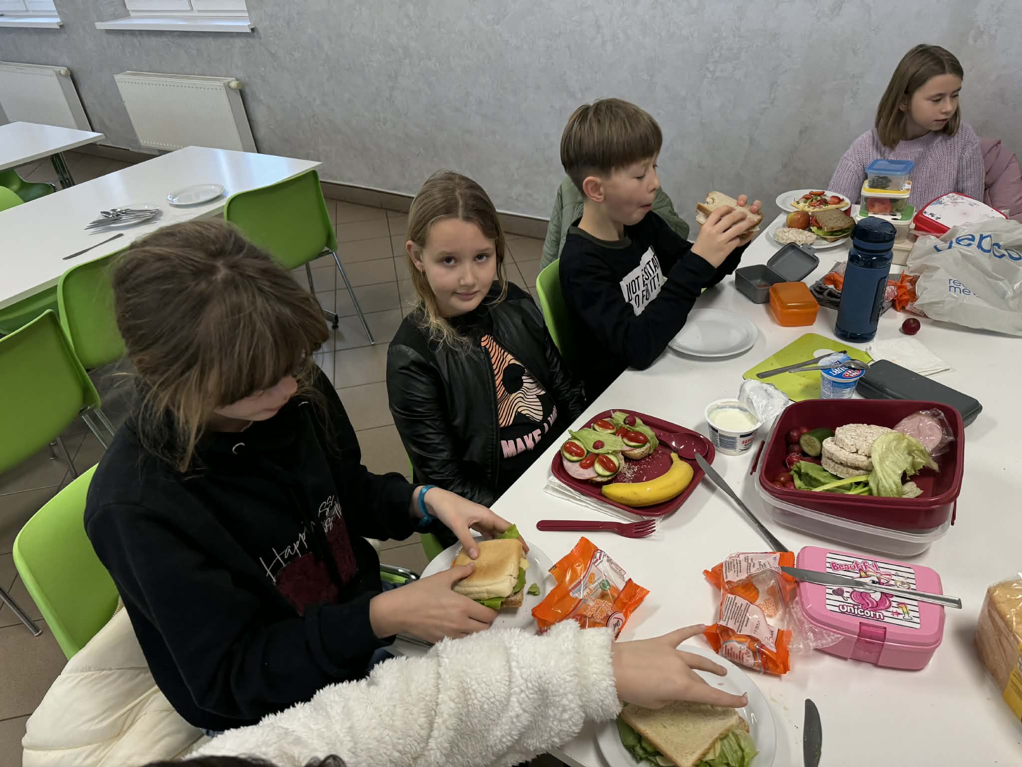 W ramach zajęć edukacji zdrowotnej przeprowadzono praktyczne zajęcia kulinarne dotyczące planowania zdrowego drugiego śniadania do szkoły. Odbyły się one w szkolnej stołówce, gdzie uczniowie pracowali na przyniesiony przez siebie produktach. Uczniowie dowiedzieli się jak komponować zbilansowany posiłek oraz jakie znaczenie ma regularne jedzenie dla koncentracji i samopoczucia w ciągu dnia. Uczniowie łączyli produkty z różnych grup żywności, uczyli się praktycznych umiejętności kulinarnych i zwracali uwagę na estetykę podania posiłku. Wspólne przygotowywanie kanapek, sałatek, jogurtów z dodatkami i prostych przekąsek pozwoliło uczniom lepiej zrozumieć, jak w łatwy sposób stworzyć wartościowe drugie śniadanie. Zajęcia zakończyły się wspólną degustacją.