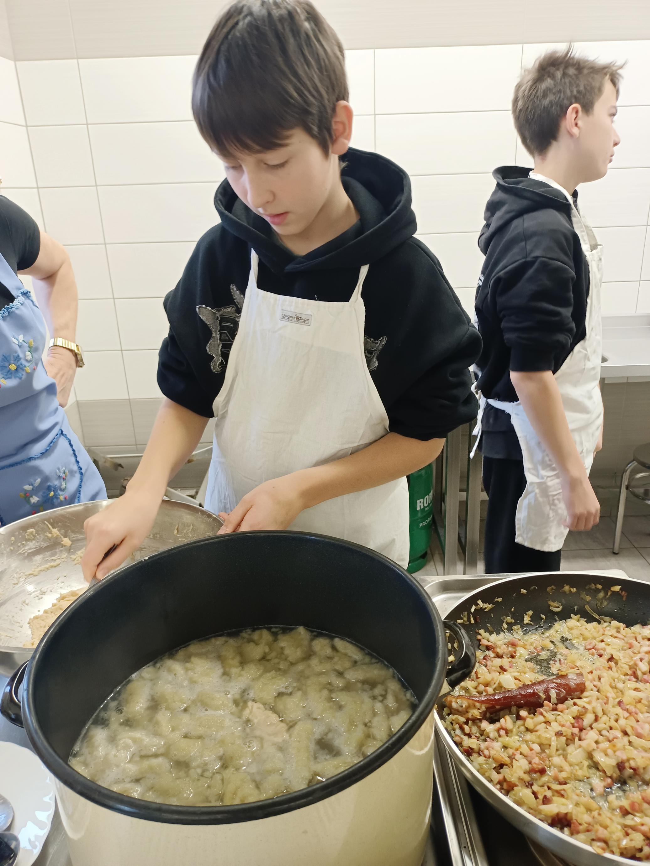 25 listopada uczniowie klas VI i VII wybrali się do Wiejskiego Domu Kultury w Swornegaciach, gdzie wzięli udział w wyjątkowych warsztatach kulinarnych, podczas których przygotowywali tradycyjne kaszubskie danie – szare kluski. Ta dawna potrawa, znana w wielu kaszubskich domach, powstaje z utartych surowych ziemniaków oraz mąki żytniej, a jej smak dopełniają podsmażony boczek i cebula.