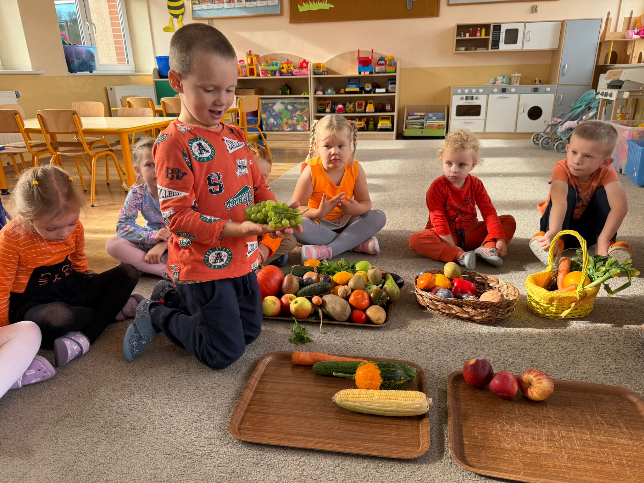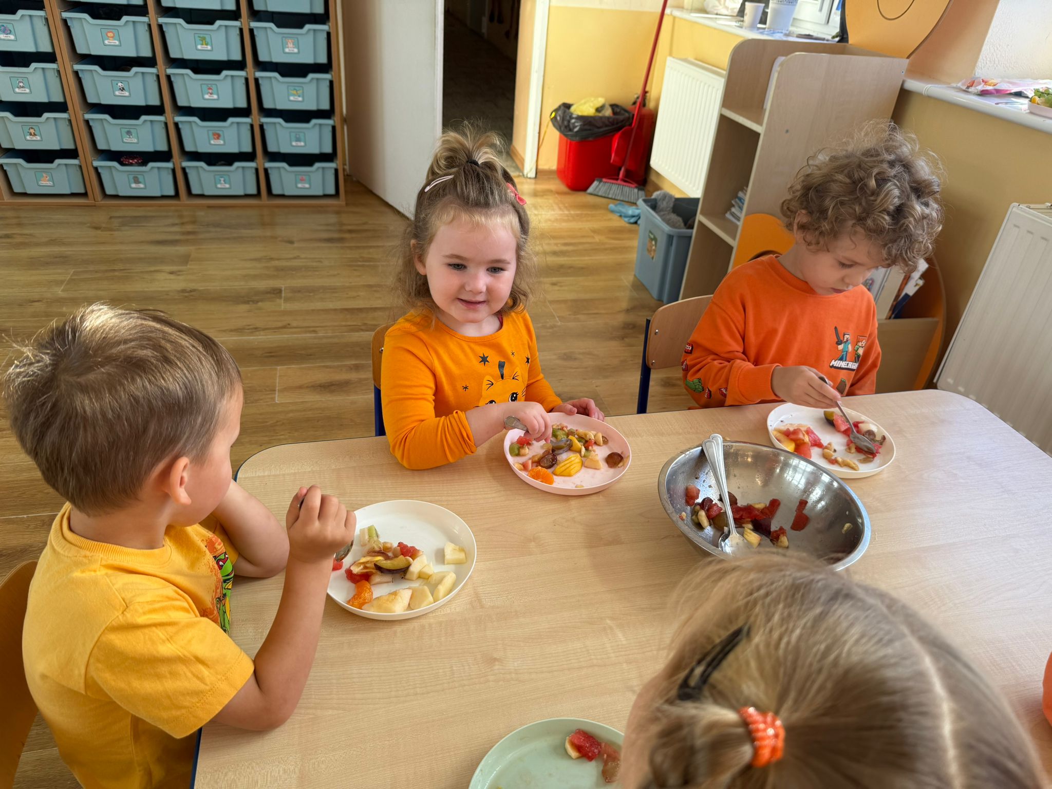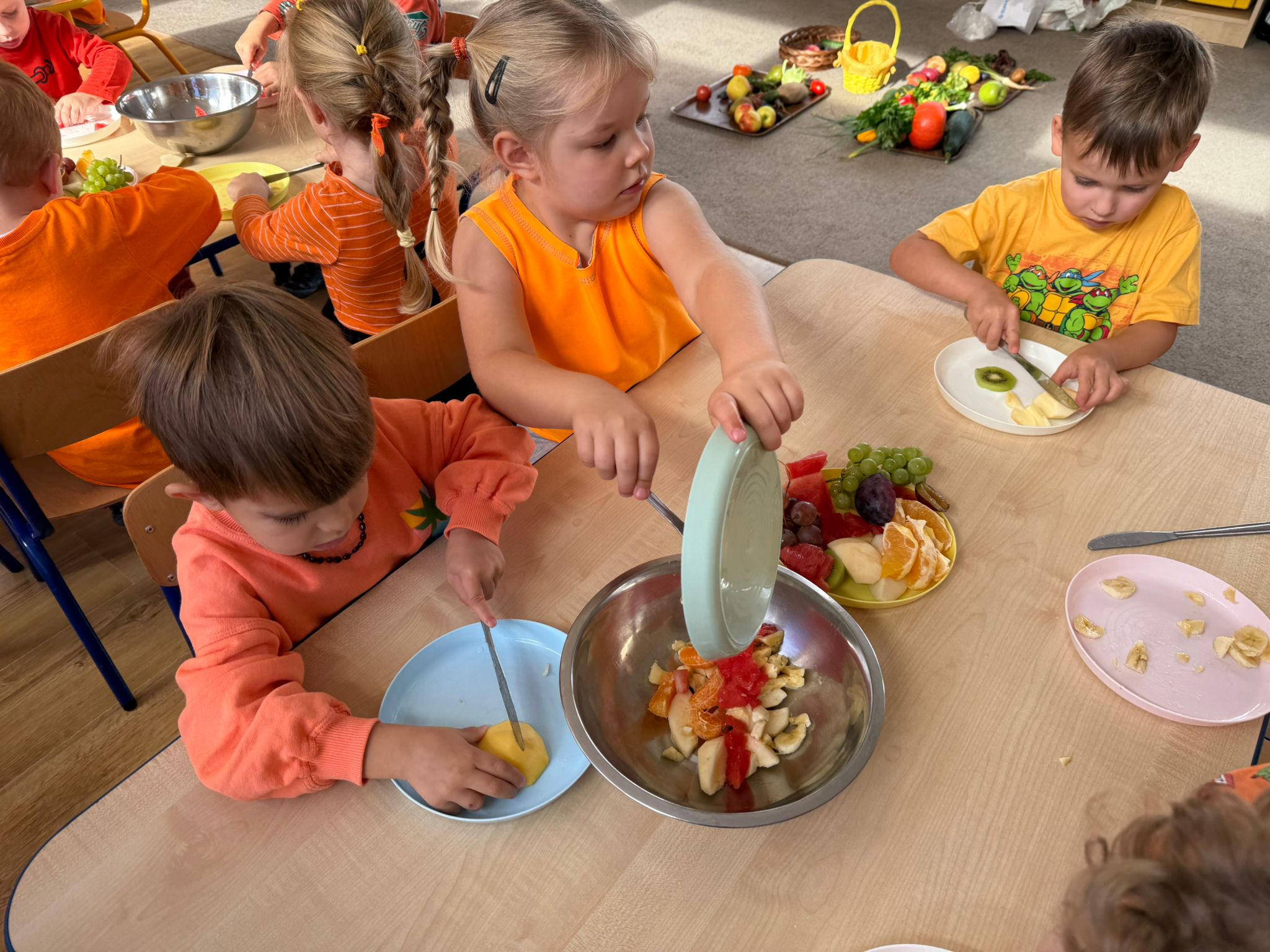 Na początku dzieci nazwały przez siebie przyniesione dary i wspólnie określany, które z nich to warzywa, a które to owoc. Później przyszedł czas na kulinarne wyzwanie – przedszkolaki samodzielnie przygotowały pyszną sałatkę owocową, którą z wielkim apetytem zajadały.