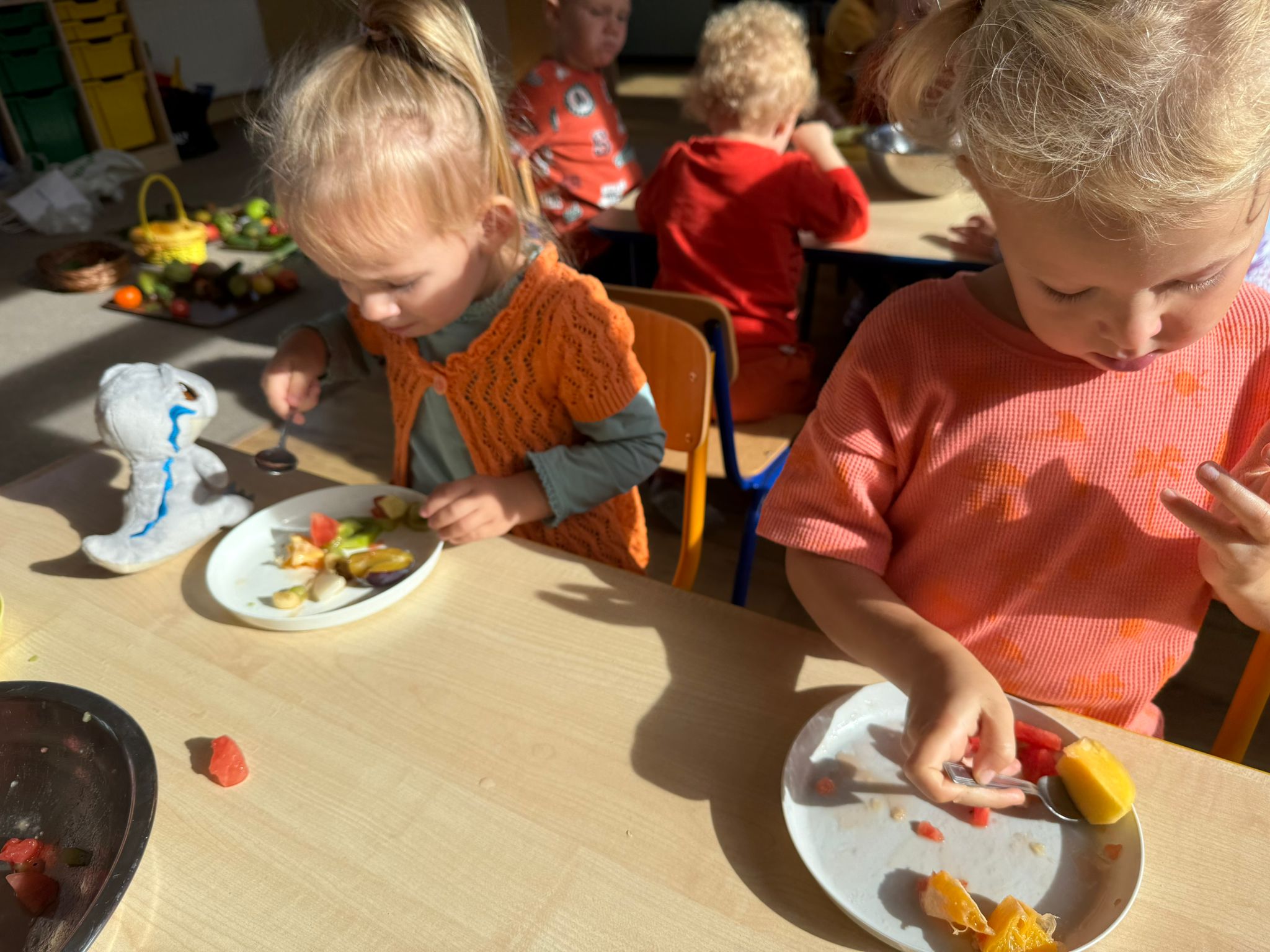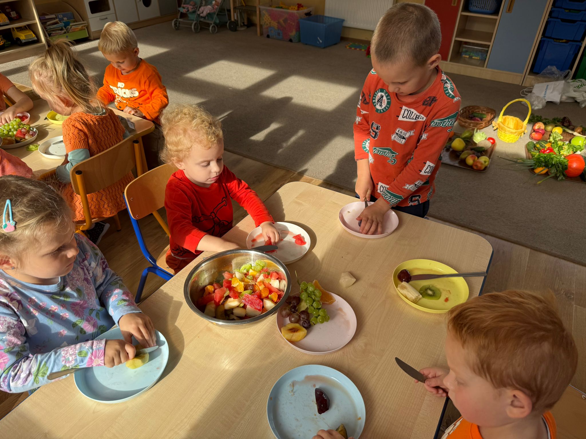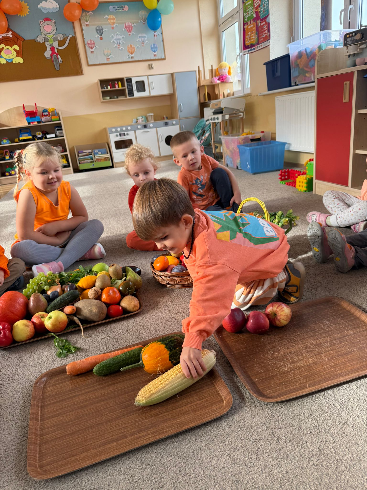 Na początku dzieci nazwały przez siebie przyniesione dary i wspólnie określany, które z nich to warzywa, a które to owoc. Później przyszedł czas na kulinarne wyzwanie – przedszkolaki samodzielnie przygotowały pyszną sałatkę owocową, którą z wielkim apetytem zajadały.
