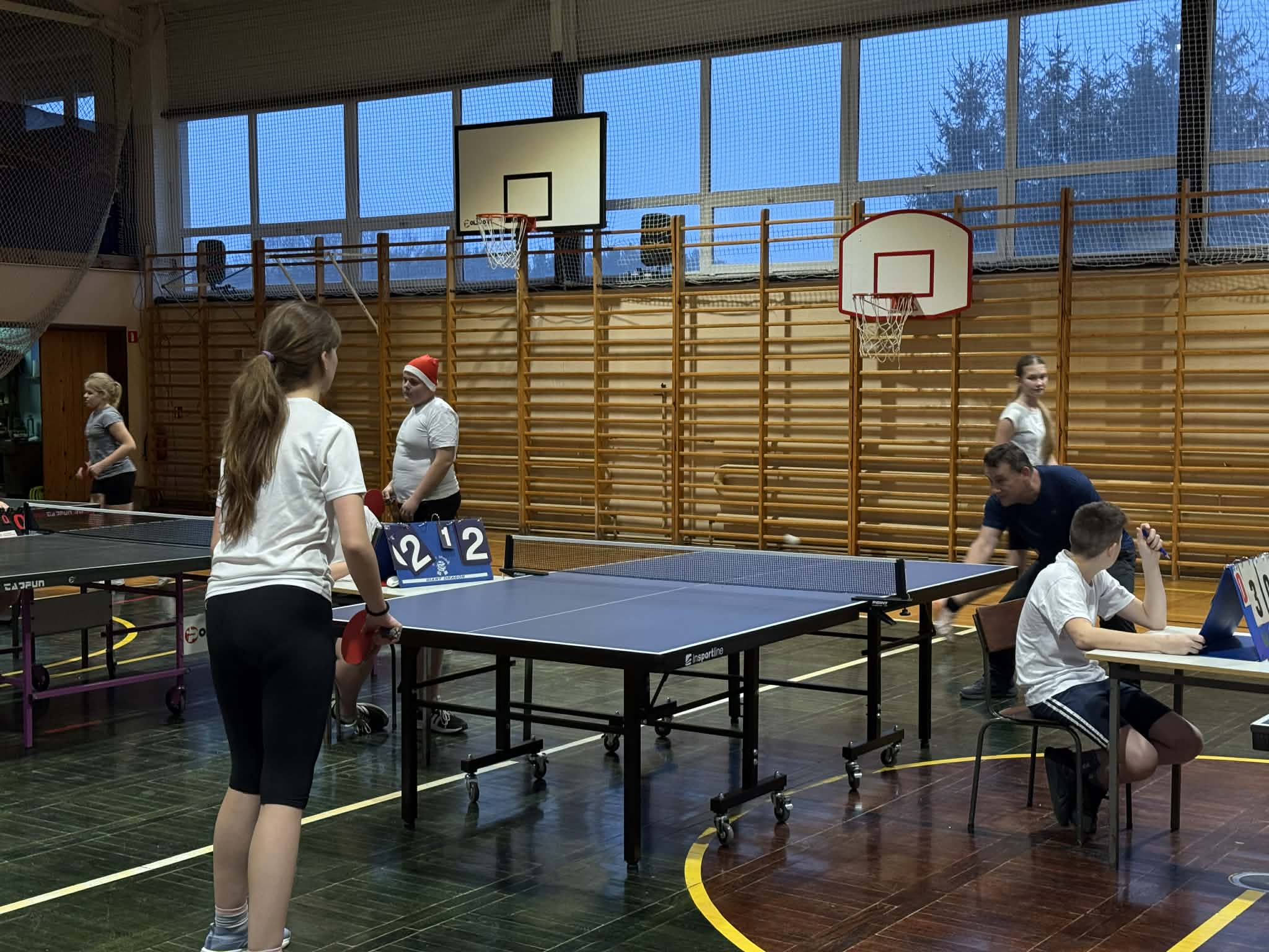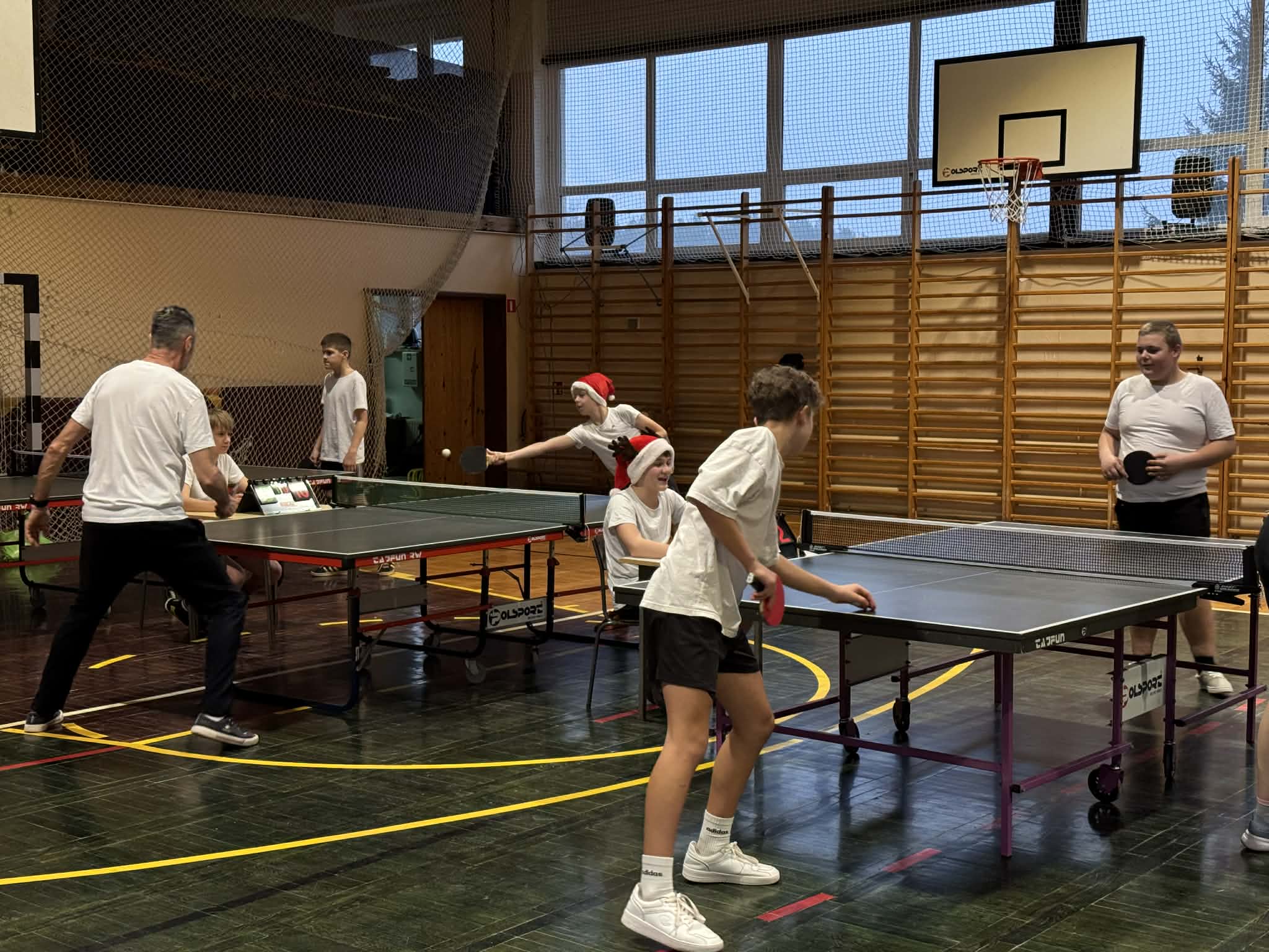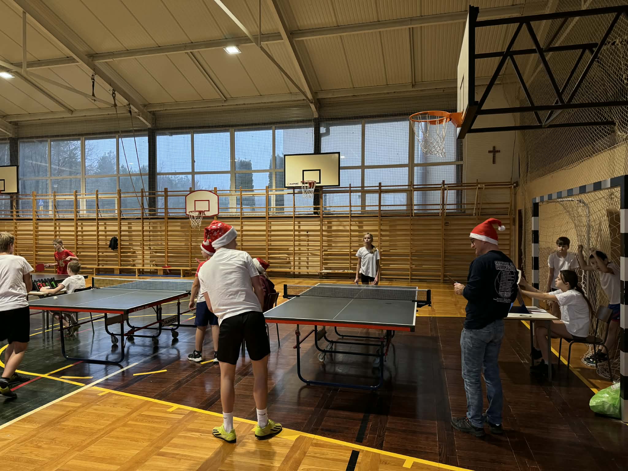 Dnia 4 grudnia 2025 roku w naszej szkole odbył się Mikołajkowy Turniej Tenisa Stołowego, w którym wzięli udział uczniowie klas IV-VIII oraz nauczyciele i pracownicy szkoły. Do turnieju zgłosiło się 24 uczniów oraz 5 przedstawicieli kadry pedagogicznej, którzy chętnie wzięli udział w rywalizacji. Podczas rozgrywek panowała radosna, świąteczna atmosfera, a w tle rozbrzmiewały znane wszystkim świąteczne melodie. Turniej stał się doskonałą okazją do integracji całej społeczności szkolnej i wspólnego spędzenia czasu w duchu fair play. Na zakończenie każdy uczestnik otrzymał słodki upominek ufundowany przez Radę Rodziców. Dziękujemy wszystkim za udział i gratulujemy zaangażowania!