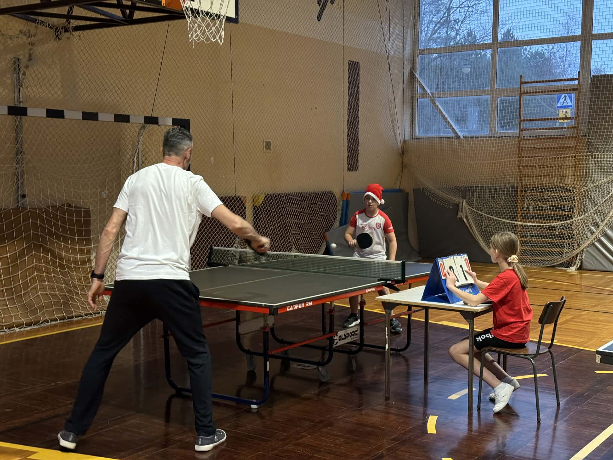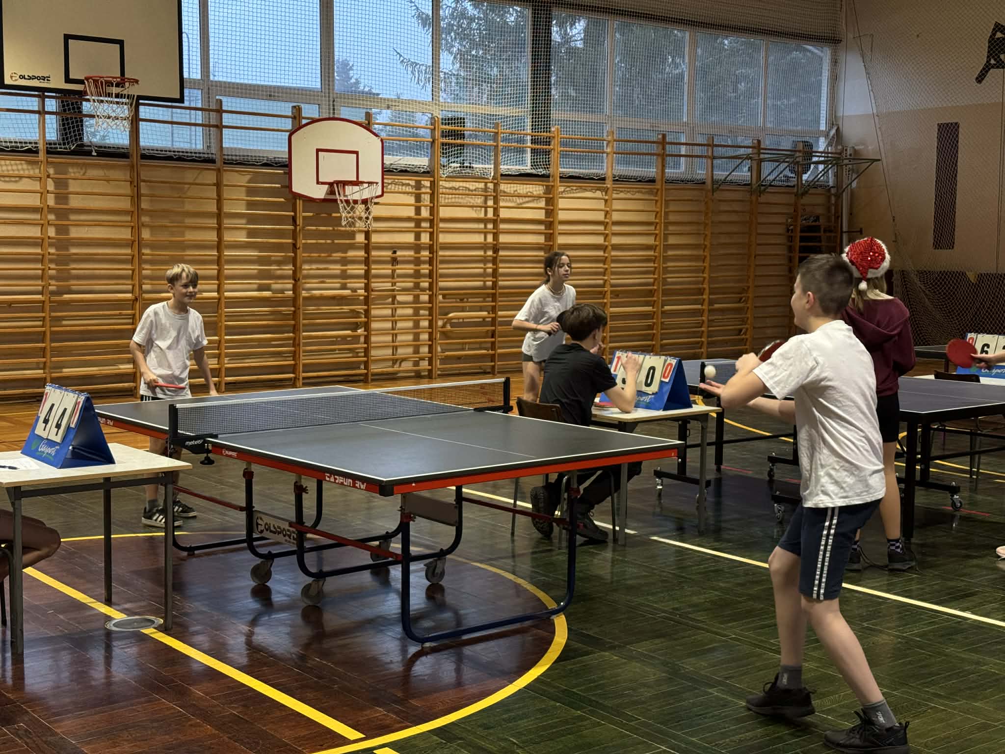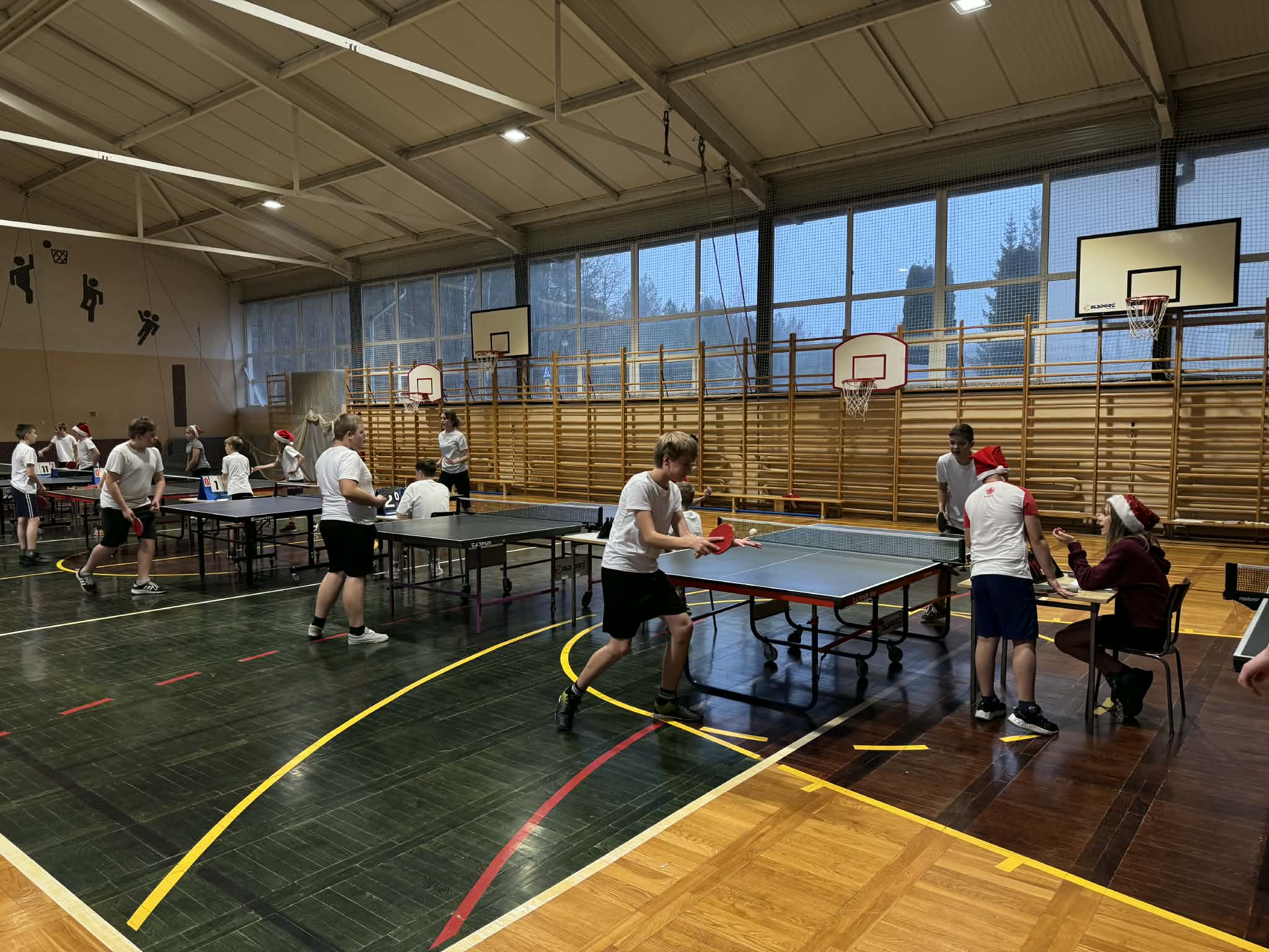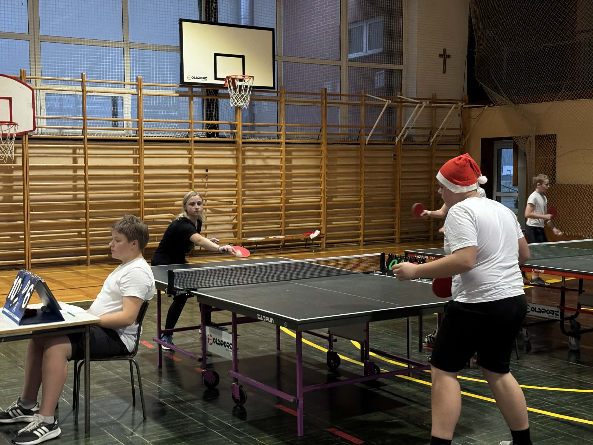 Dnia 4 grudnia 2025 roku w naszej szkole odbył się Mikołajkowy Turniej Tenisa Stołowego, w którym wzięli udział uczniowie klas IV-VIII oraz nauczyciele i pracownicy szkoły. Do turnieju zgłosiło się 24 uczniów oraz 5 przedstawicieli kadry pedagogicznej, którzy chętnie wzięli udział w rywalizacji. Podczas rozgrywek panowała radosna, świąteczna atmosfera, a w tle rozbrzmiewały znane wszystkim świąteczne melodie. Turniej stał się doskonałą okazją do integracji całej społeczności szkolnej i wspólnego spędzenia czasu w duchu fair play. Na zakończenie każdy uczestnik otrzymał słodki upominek ufundowany przez Radę Rodziców. Dziękujemy wszystkim za udział i gratulujemy zaangażowania!