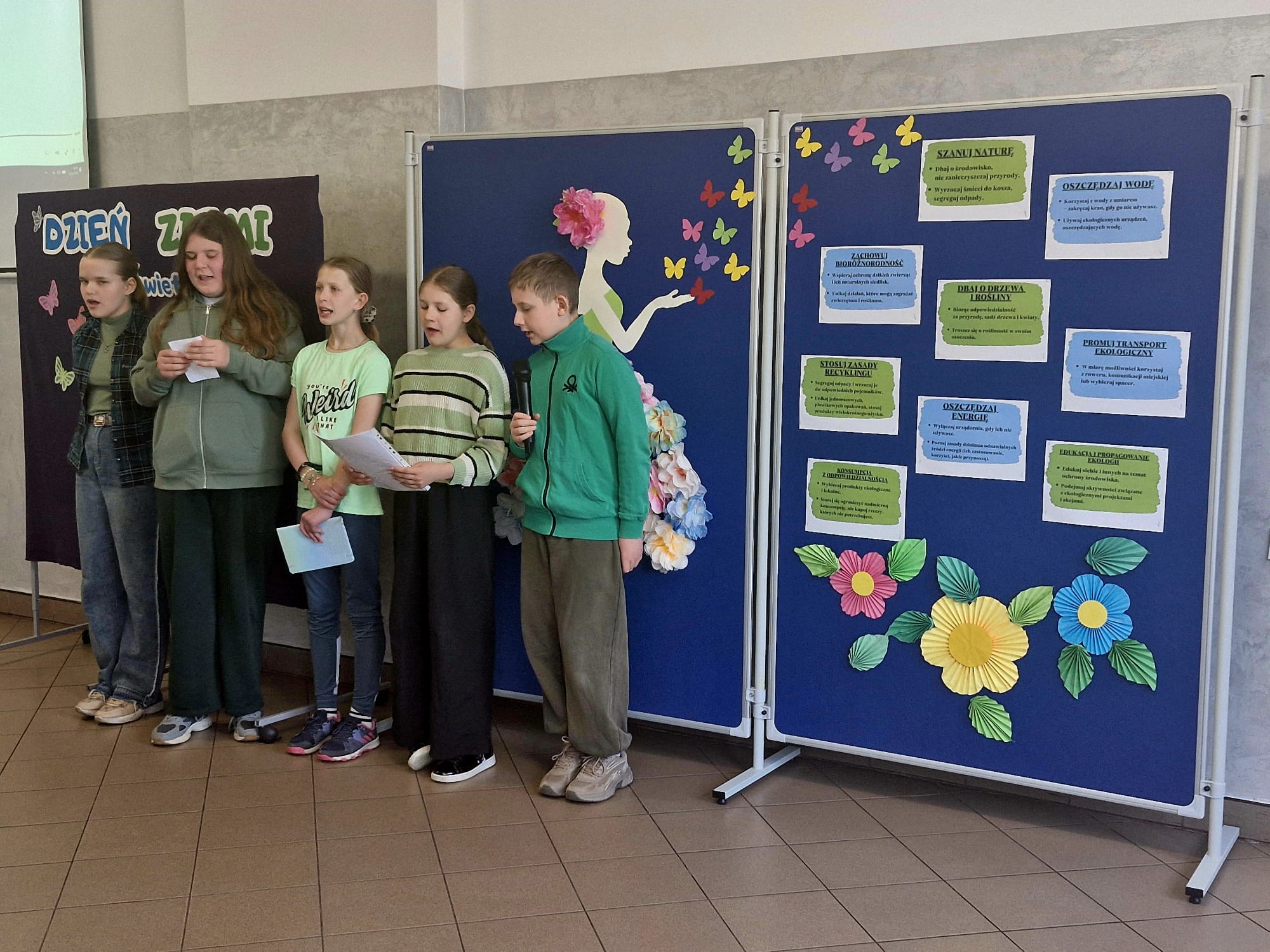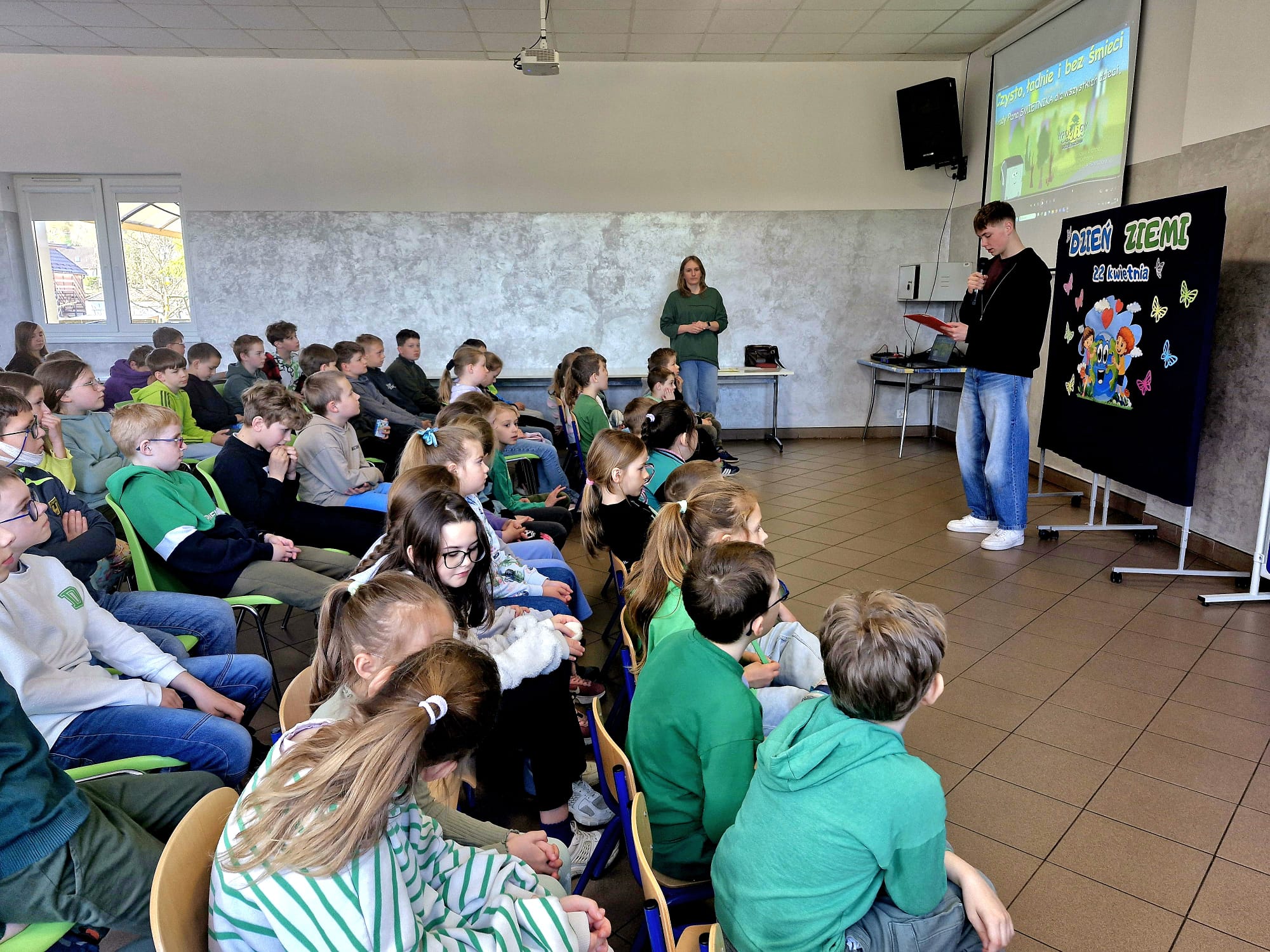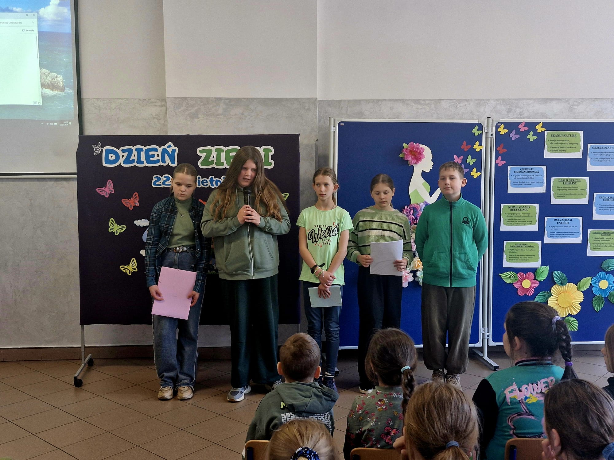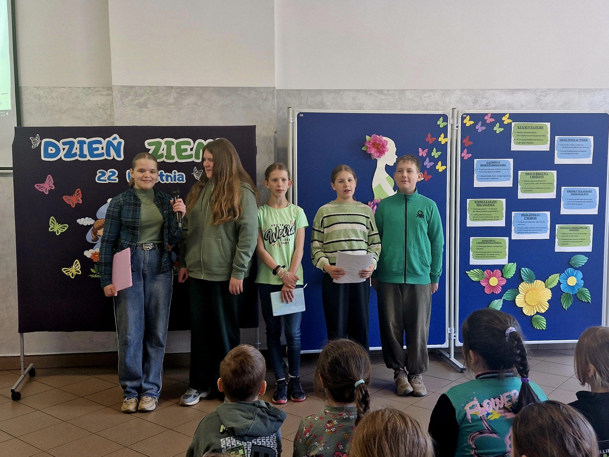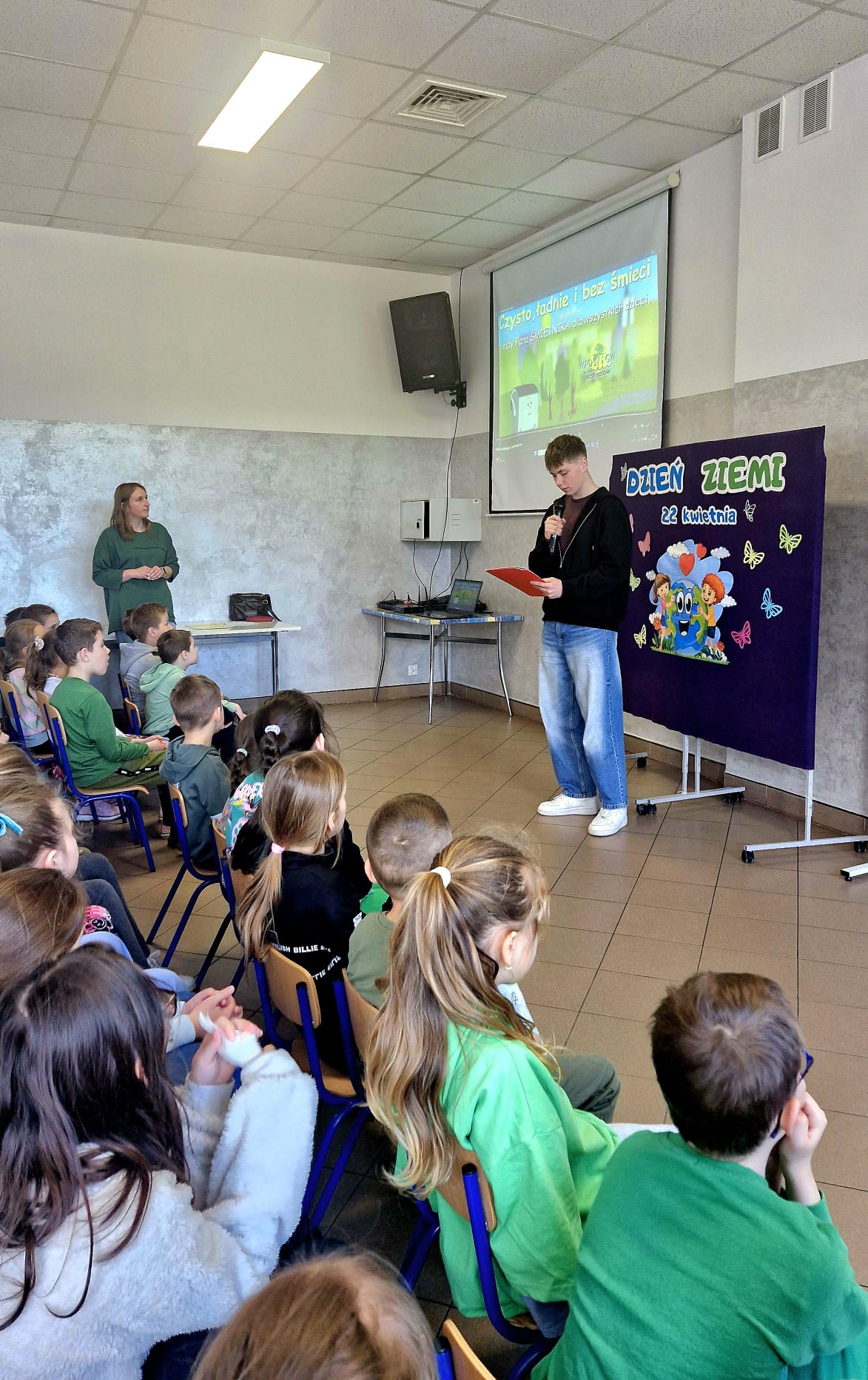 Apel został przygotowany przez uczniów klasy piątej, którzy z dużym zaangażowaniem przedstawili program artystyczny. Występ obejmował recytacje wierszy, ekologiczne piosenki oraz informacje na temat ochrony przyrody i zagrożeń dla naszej planety. Uczniowie obejrzeli bajkę edukacyjną- jak ważne jest oszczędzanie wody, segregowanie odpadów oraz troska o czystość najbliższego otoczenia.