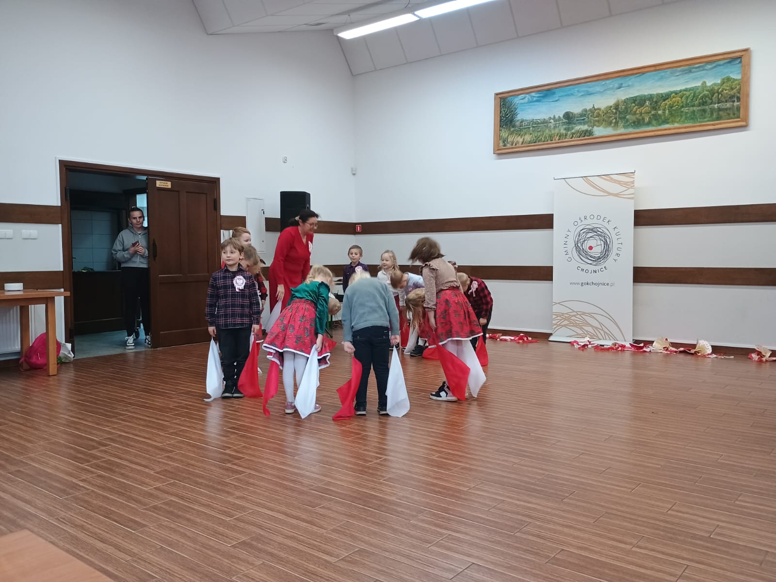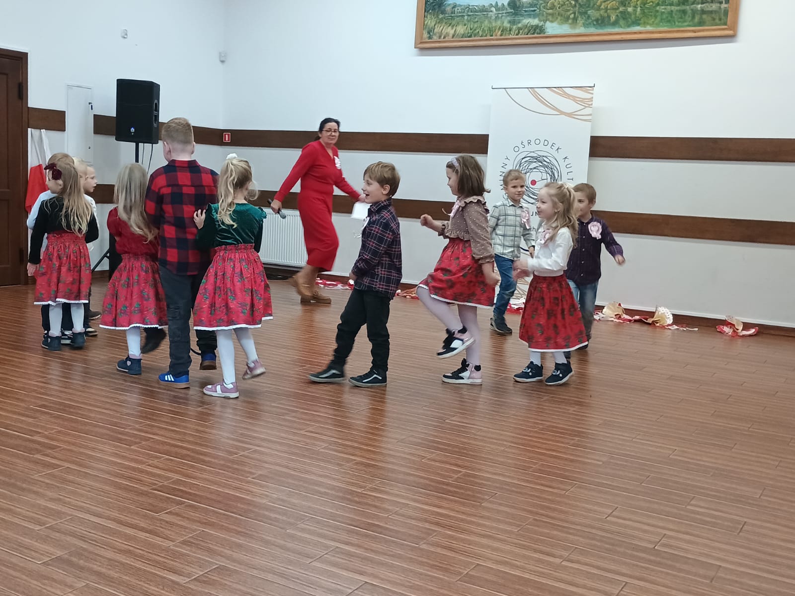 Po warsztatach zaprezentowaliśmy nasz występ przygotowany z okazji Święta Niepodległości. Na występ zaproszeni zostali goście specjalni-seniorzy z całego sołectwa. Występ został nagrodzony gromkimi brawami, a my w nagrodę zostaliśmy poczęstowani świeżo upieczonymi goframi z bitą śmietaną lub powidłami. BARDZO DZIĘKUJEMY PRACOWNIKOM DOMU KULTURY ZA ZORGANIZOWANIE DLA NAS TAK WSPANIAŁEGO DNIA.