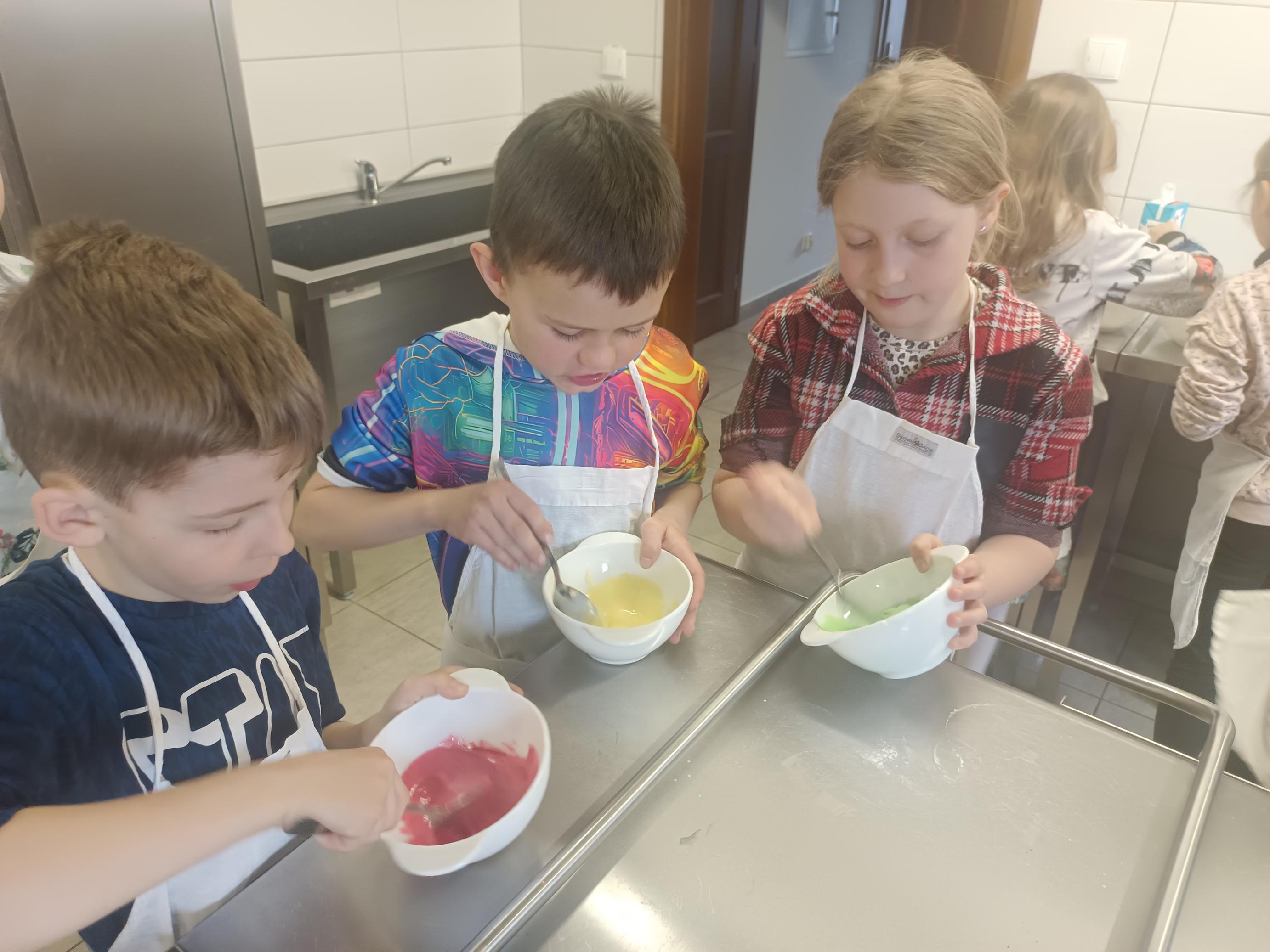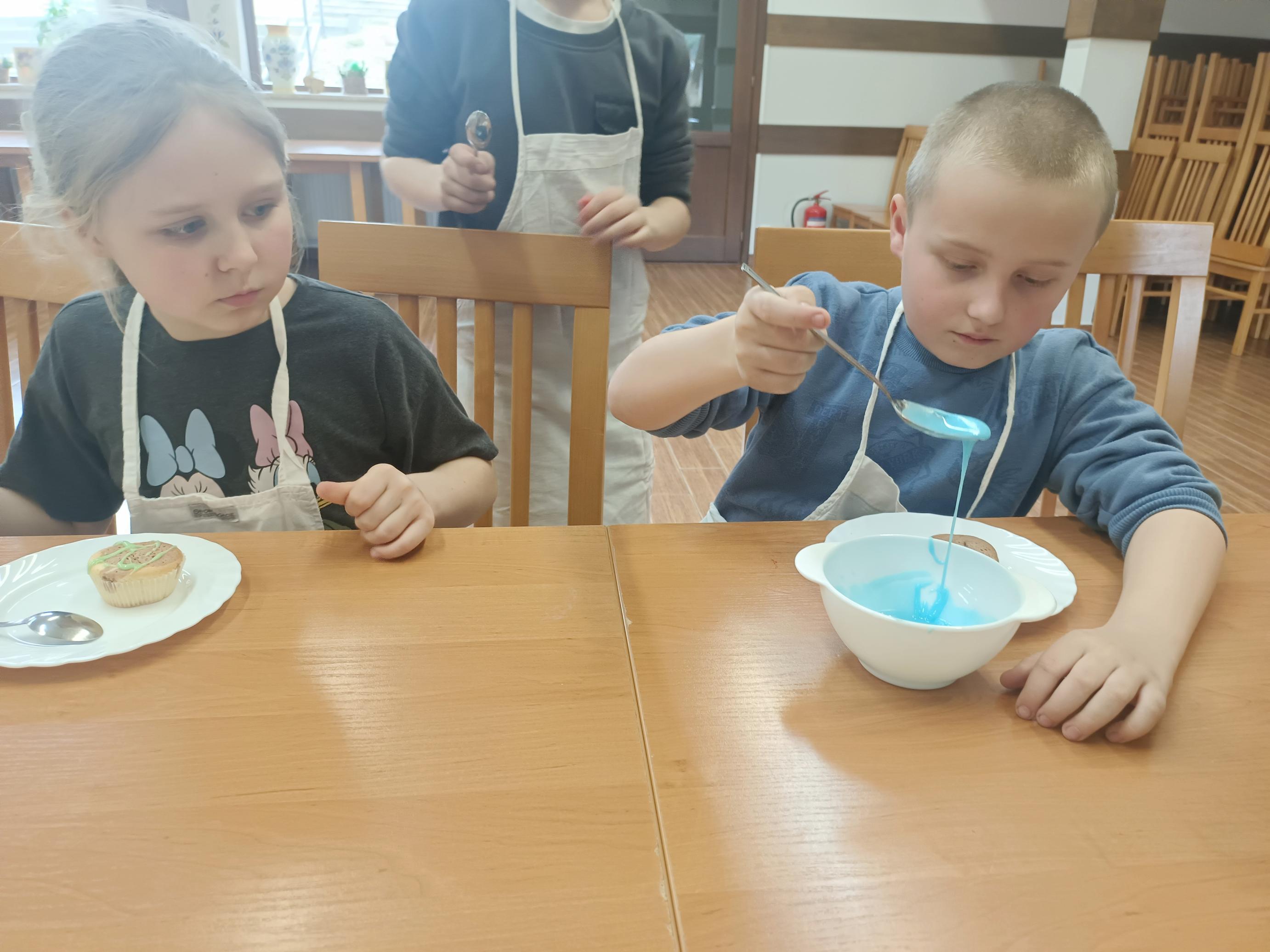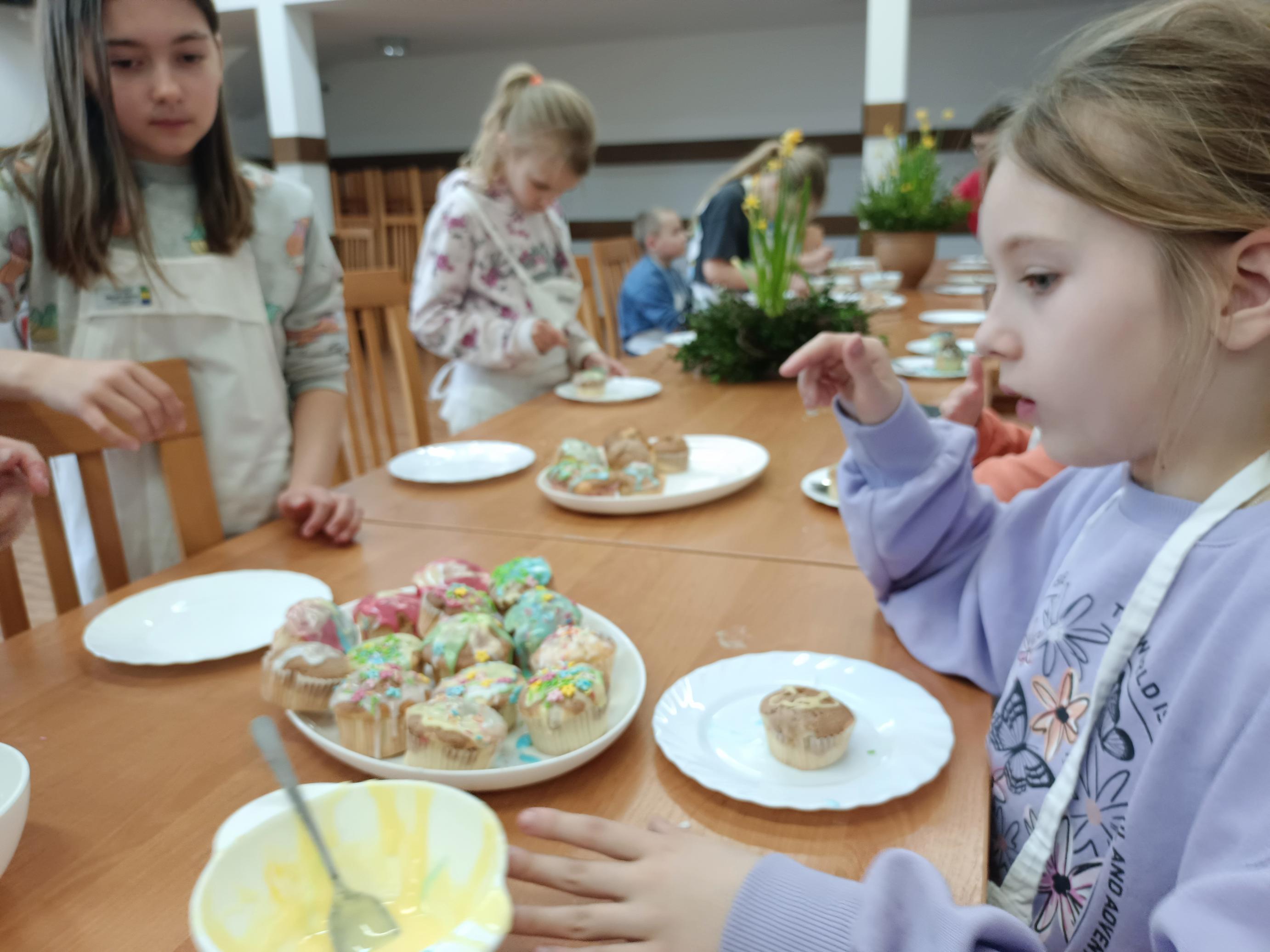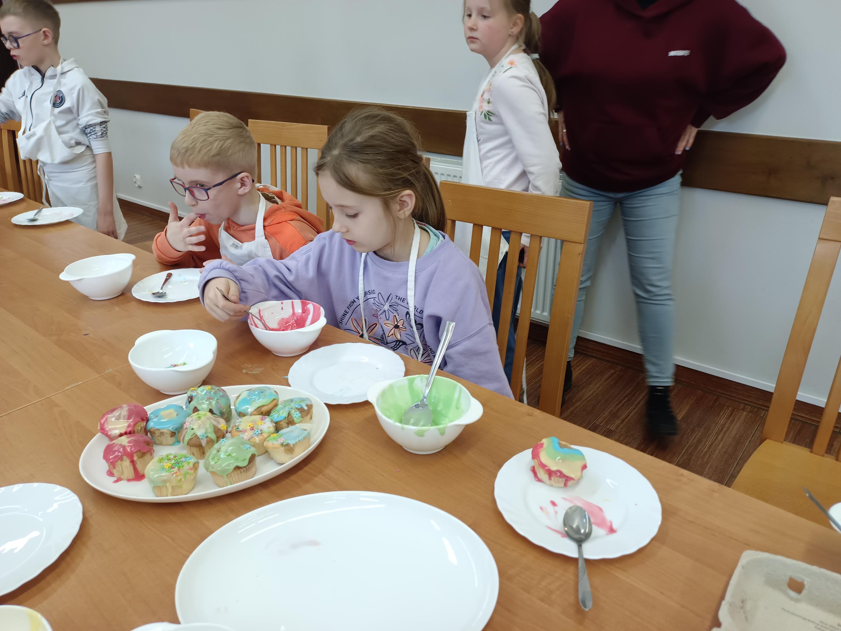 W czwartek, 26 marca, uczniowie klas I–III przenieśli się do wyjątkowej, pachnącej świętami pracowni małych cukierników. W ramach przygotowań do Wielkanocy piekli świąteczne babeczki. Z ogromnym zaangażowaniem odmierzali składniki, mieszali ciasto i z niecierpliwością zaglądali do piekarnika, czekając na swoje wypieki. Gdy babeczki nabrały złocistego koloru, rozpoczęła się najbardziej twórcza część zajęć – dekorowanie. Na stołach pojawiły się kolorowe lukry, posypki i wiosenne motywy. Każda babeczka stała się małym dziełem sztuki – pełnym barw, fantazji i dziecięcej radości. W powietrzu unosił się zapach słodkości, a pracownię wypełnił śmiech, rozmowy i prawdziwie świąteczna atmosfera.