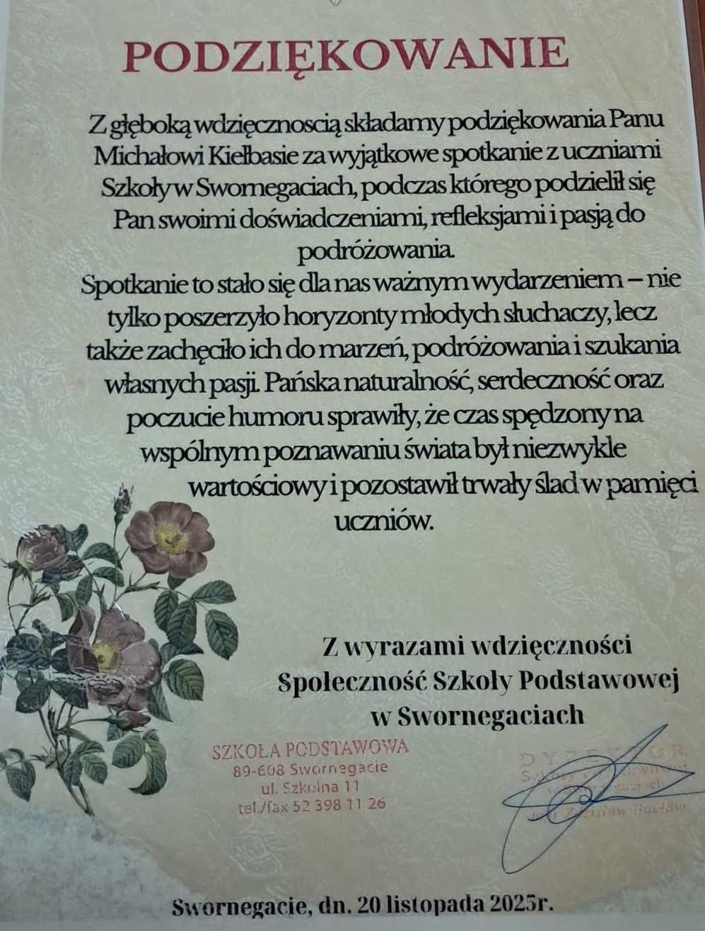 Wizyta pana Michała Kiełbasy była dla całej społeczności szkolnej wartościowym i inspirującym wydarzeniem. Uczniowie nie tylko poszerzyli swoją wiedzę o świecie, lecz także zostali zachęceni do odkrywania nowych miejsc, rozwijania pasji oraz odważnego realizowania marzeń.