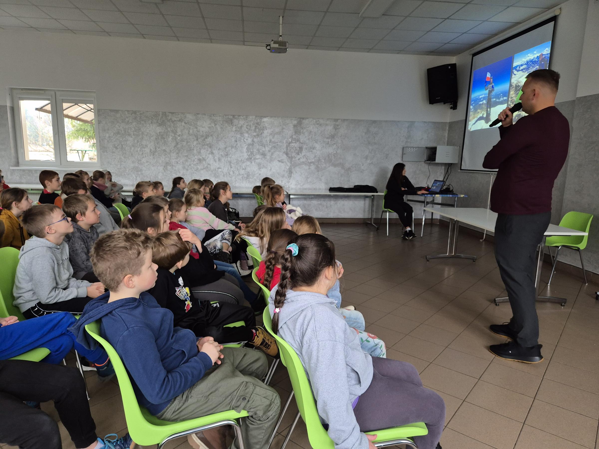 Jednym z punktów wizyty był wywiad przeprowadzony przez uczennice klasy V Kornelię Skonieczną i Ninę Świerko, które wcześniej starannie przygotowały zestaw pytań. Pan Michał z dużą życzliwością i cierpliwością odpowiadał na wszystkie z nich, dzieląc się przemyśleniami o swoich podróżach, planach na przyszłość oraz tym, co najbardziej motywuje go do odkrywania świata. Wywiad okazał się cennym doświadczeniem zarówno dla uczennic, jak i dla słuchaczy, którzy mogli lepiej poznać kulisy pracy podróżnika.
