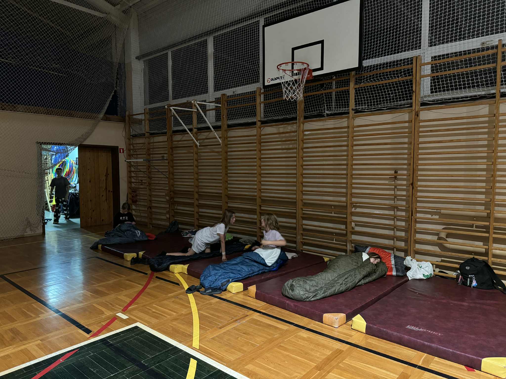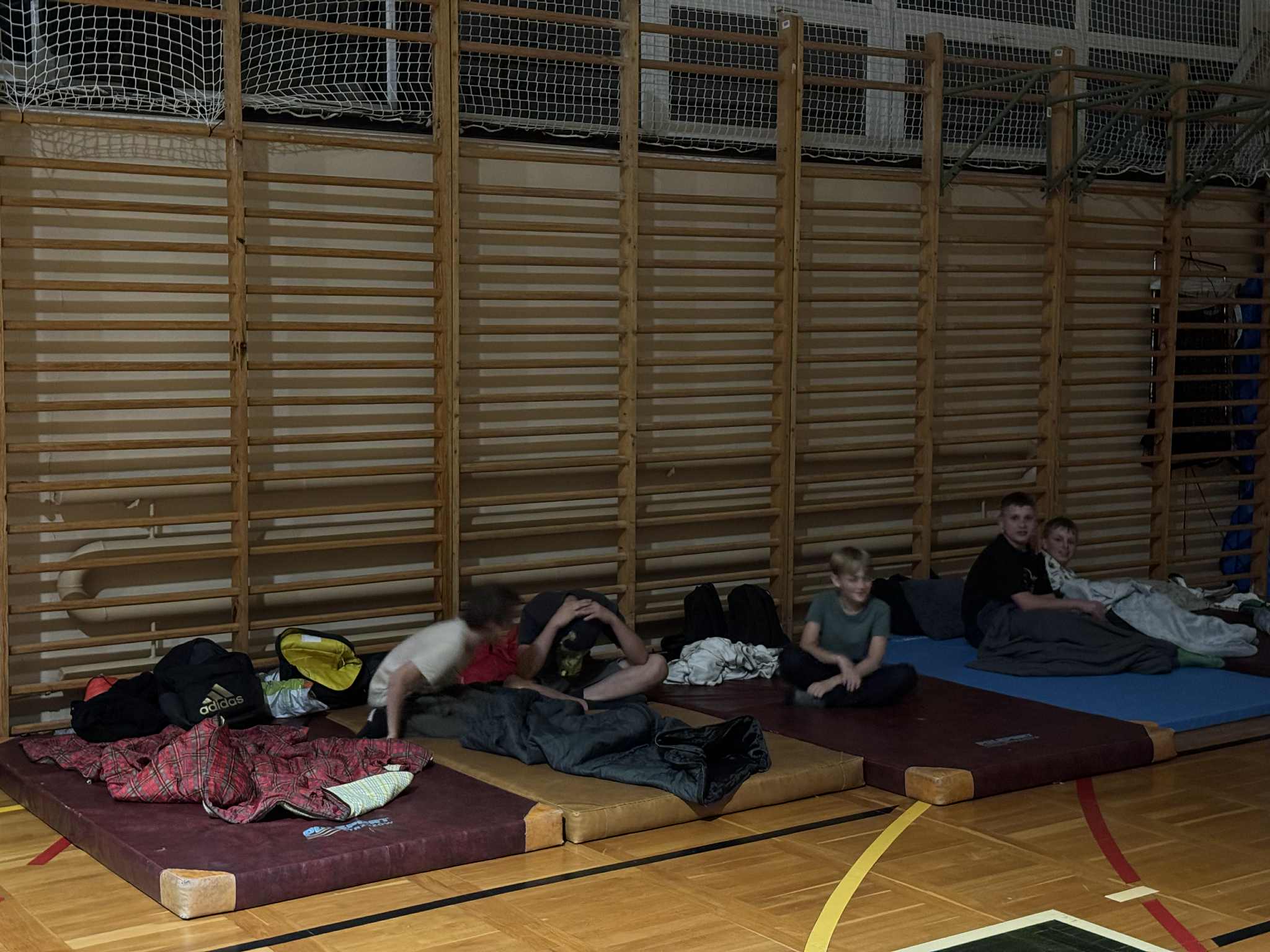 W dalszej części wieczoru odbył się seans filmowy, po którym przenieśliśmy się na salę gimnastyczną. Tam odbywały się gry, zabawy i różne formy aktywności, które rozruszały uczestników na nowo. Następnie sala zamieniła się w miejsce noclegu – uczniowie rozłożyli śpiwory i materace, przygotowując się do wspólnej nocy w szkole.