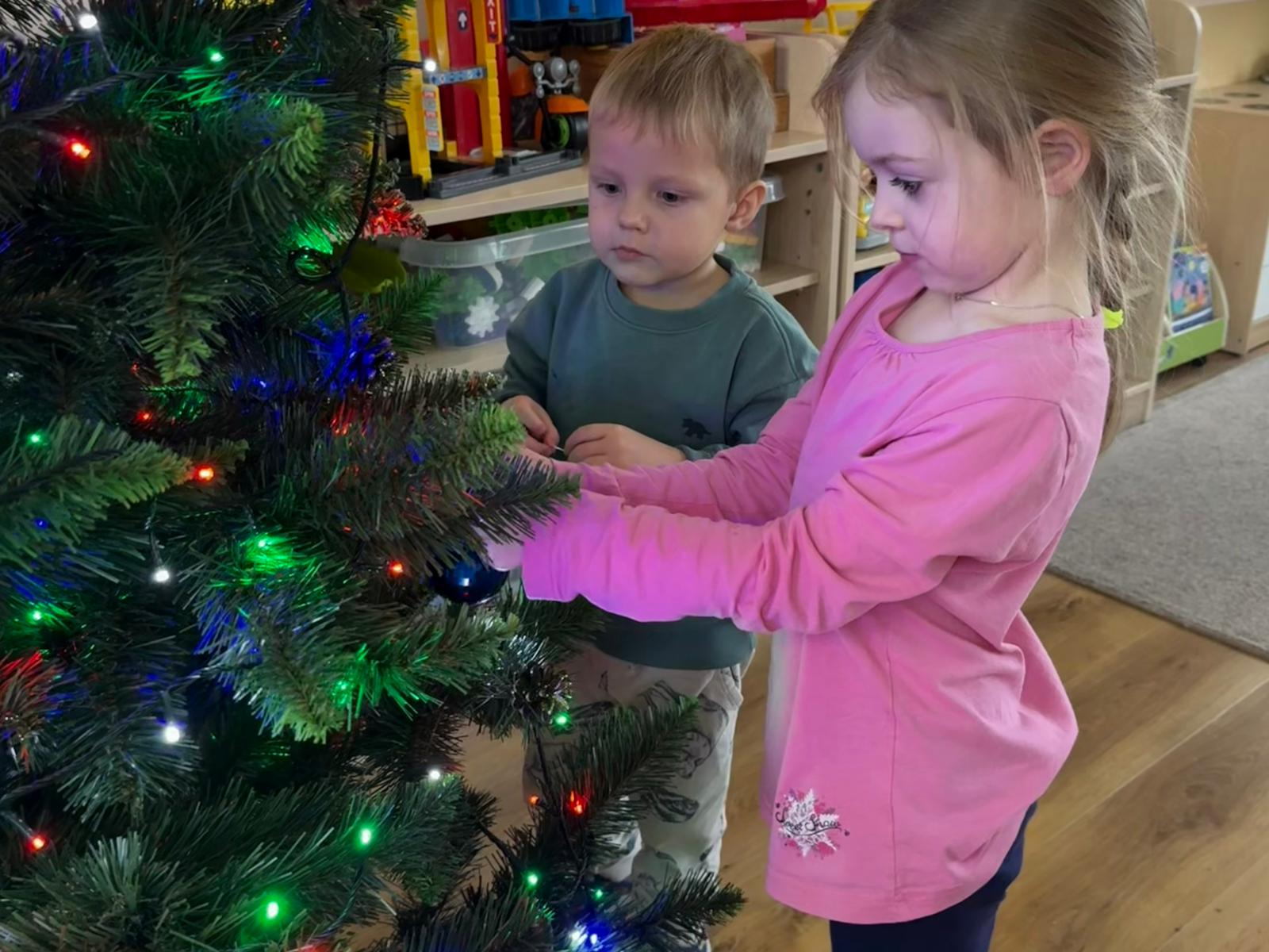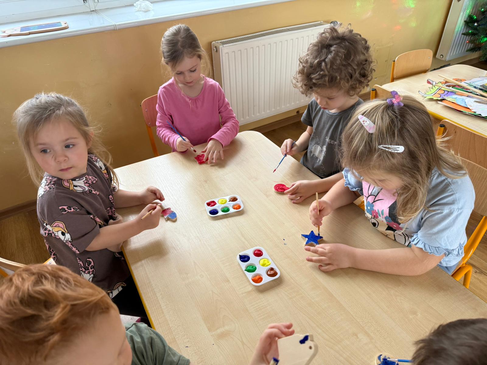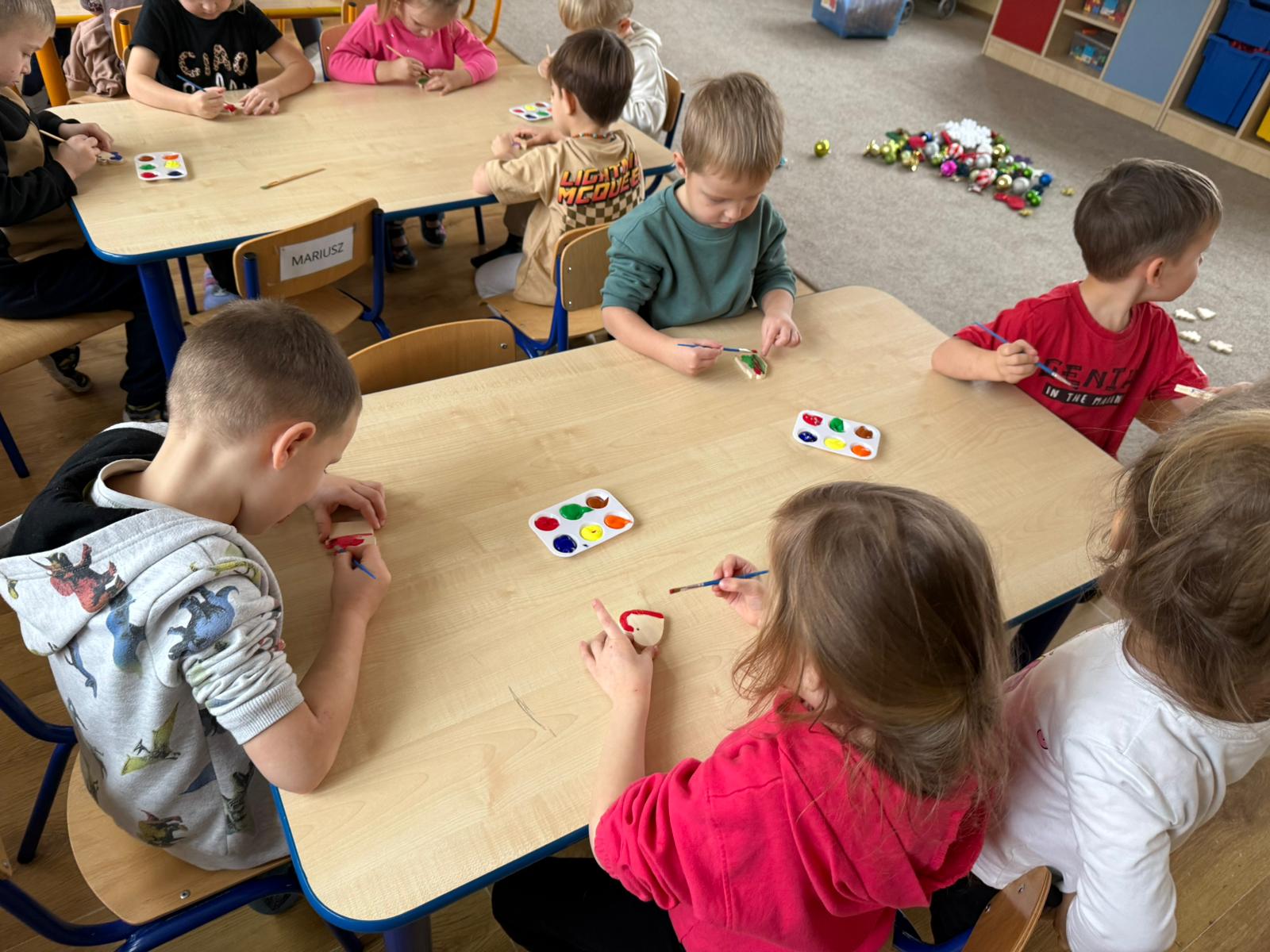 W okresie przedświątecznym w naszym przedszkolu nie mogło zabraknąć choinki. To wyjątkowy czas pełen radości, zapachu świąt i wspólnego tworzenia. Nasze maluchy z ogromnym zaangażowaniem samodzielnie przygotowały ozdoby, którymi udekorowały swoje drzewko. Dzieci wykonały kolorowe bombki, malując drewniane zawieszki, aby następnie z dumą zawiesić je na choince. Wspólne ubieranie choinki było wspaniałą okazją do rozwijania kreatywności, zdolności manualnych oraz budowania świątecznej atmosfery pełnej uśmiechów i ciepła.