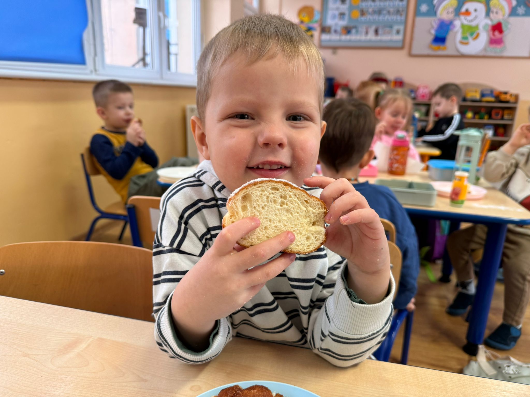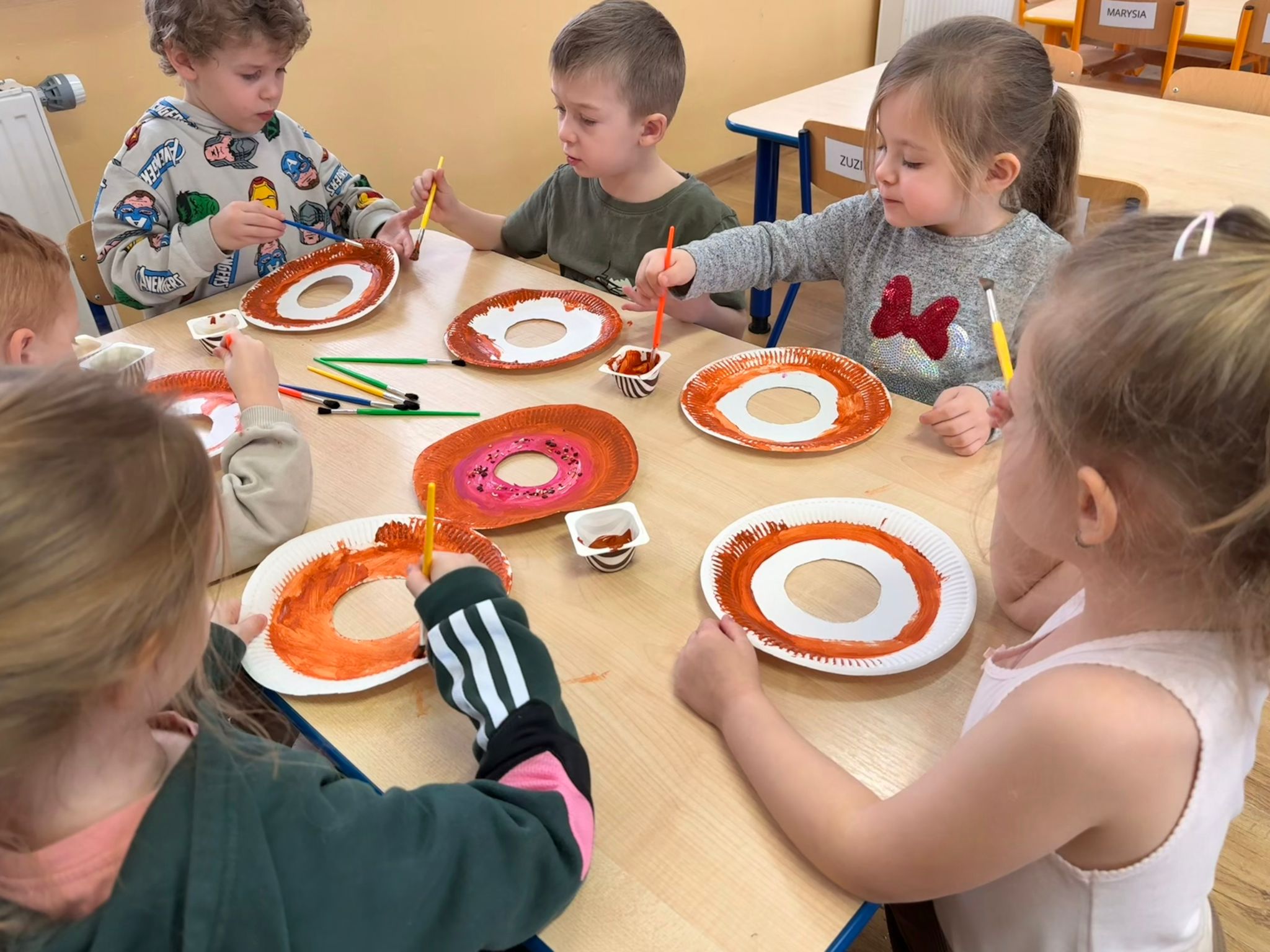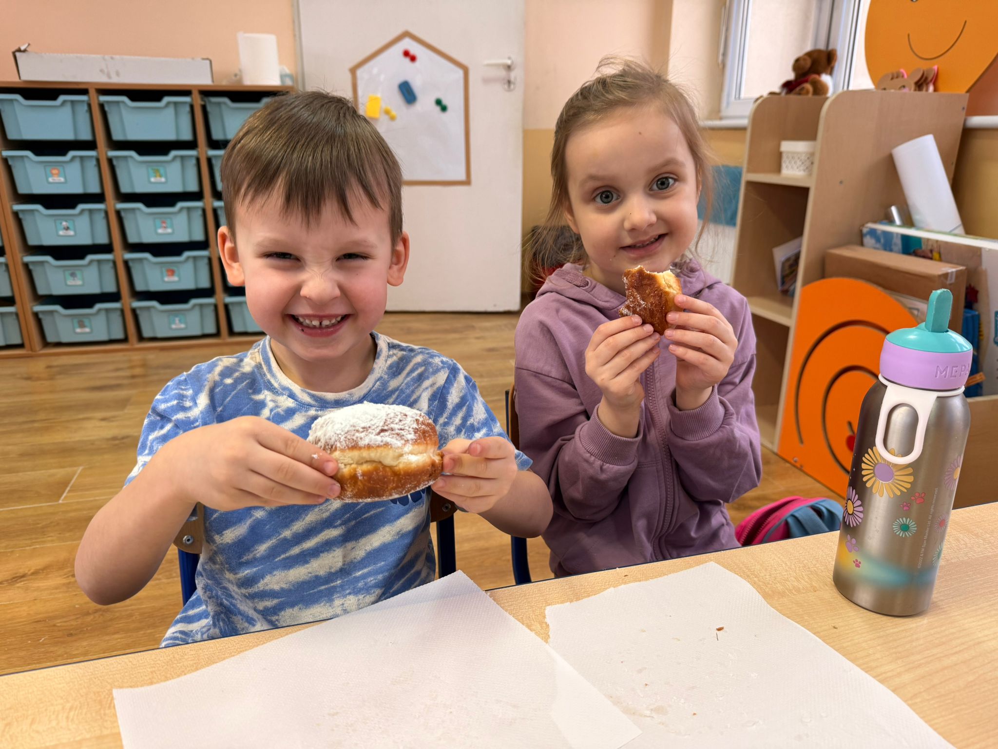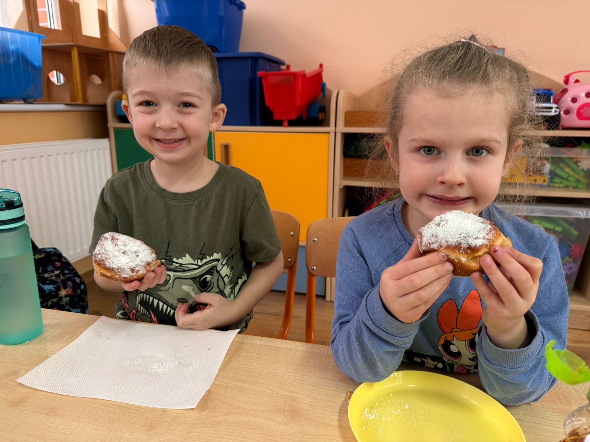 W naszym przedszkolu świętowaliśmy Tłusty Czwartek w radosnej i słodkiej atmosferze! Z okazji tego wyjątkowego dnia dzieci dowiedziały się dlaczego właśnie tego dnia zajadamy się pączkami i innymi słodkościami. Rozmawialiśmy o dawnych zwyczajach i o tym, jak święto to obchodzone jest w Polsce. Maluchy z ogromnym zaangażowaniem wykonały pracę plastyczną - kolorowe donuty z papierowych talerzyków, które ozdabiały „lukrem” i posypkami . Powstały prawdziwe dzieła sztuki, które wyglądały niemal jak prawdziwe słodkości! Na dzieci czekała także słodka niespodzianka -przepyszne pączusie, które sprawiły wszystkim wiele radości i wywołały szerokie uśmiechy. Serdecznie dziękujemy Tacie Igora za dostarczenie pączków dla dzieci i włączenie się w świętowanie tego wyjątkowego dnia.