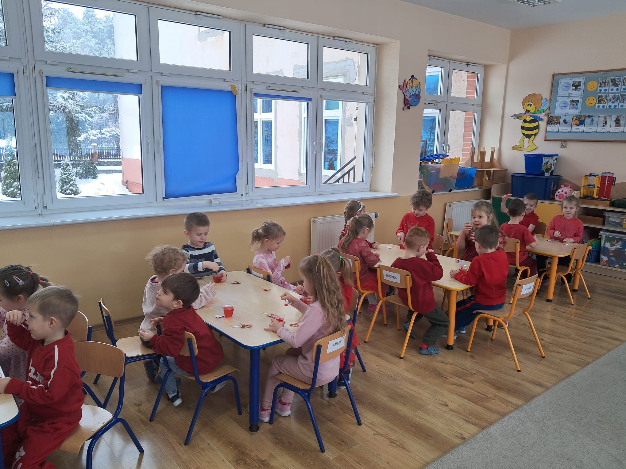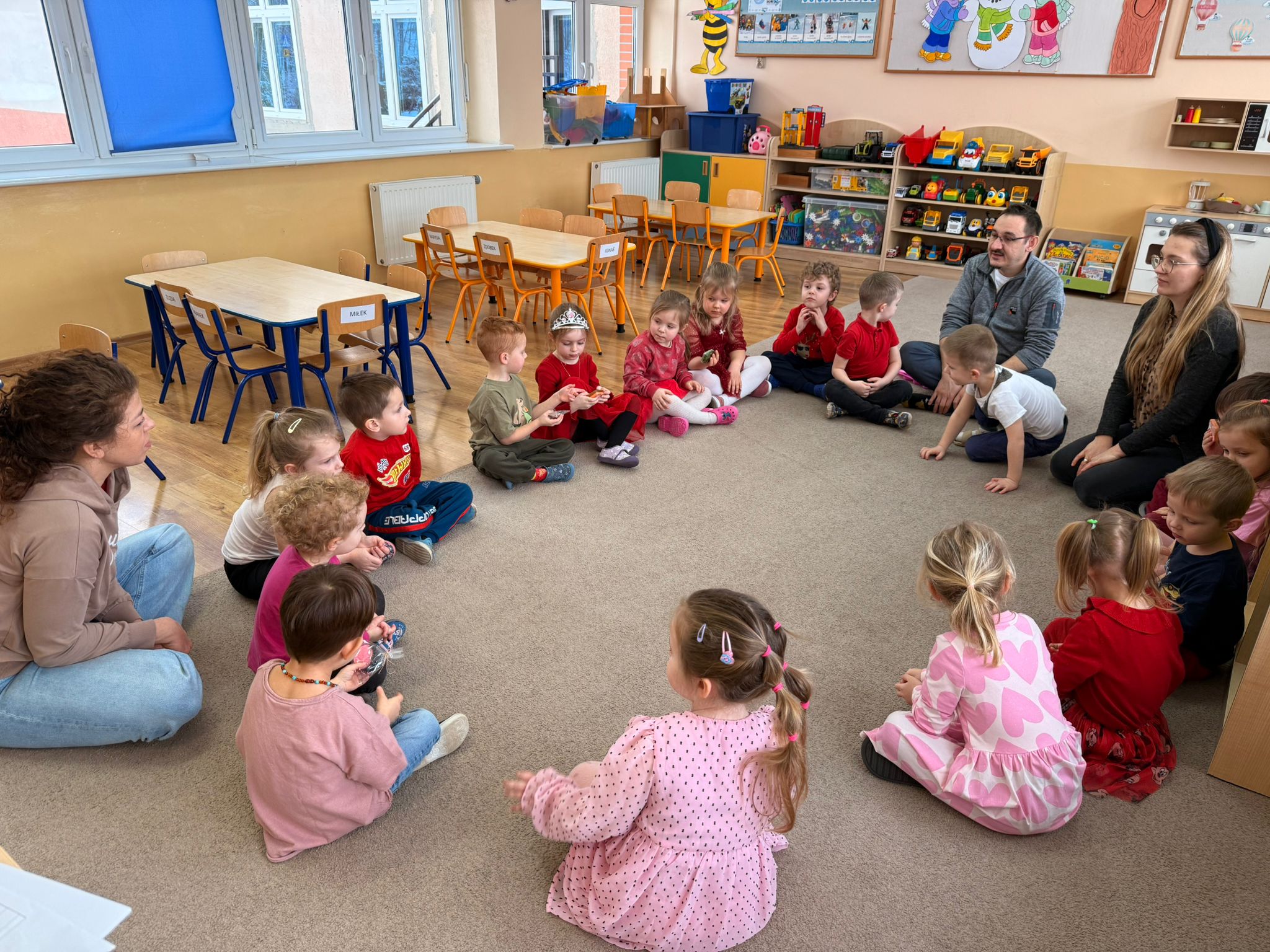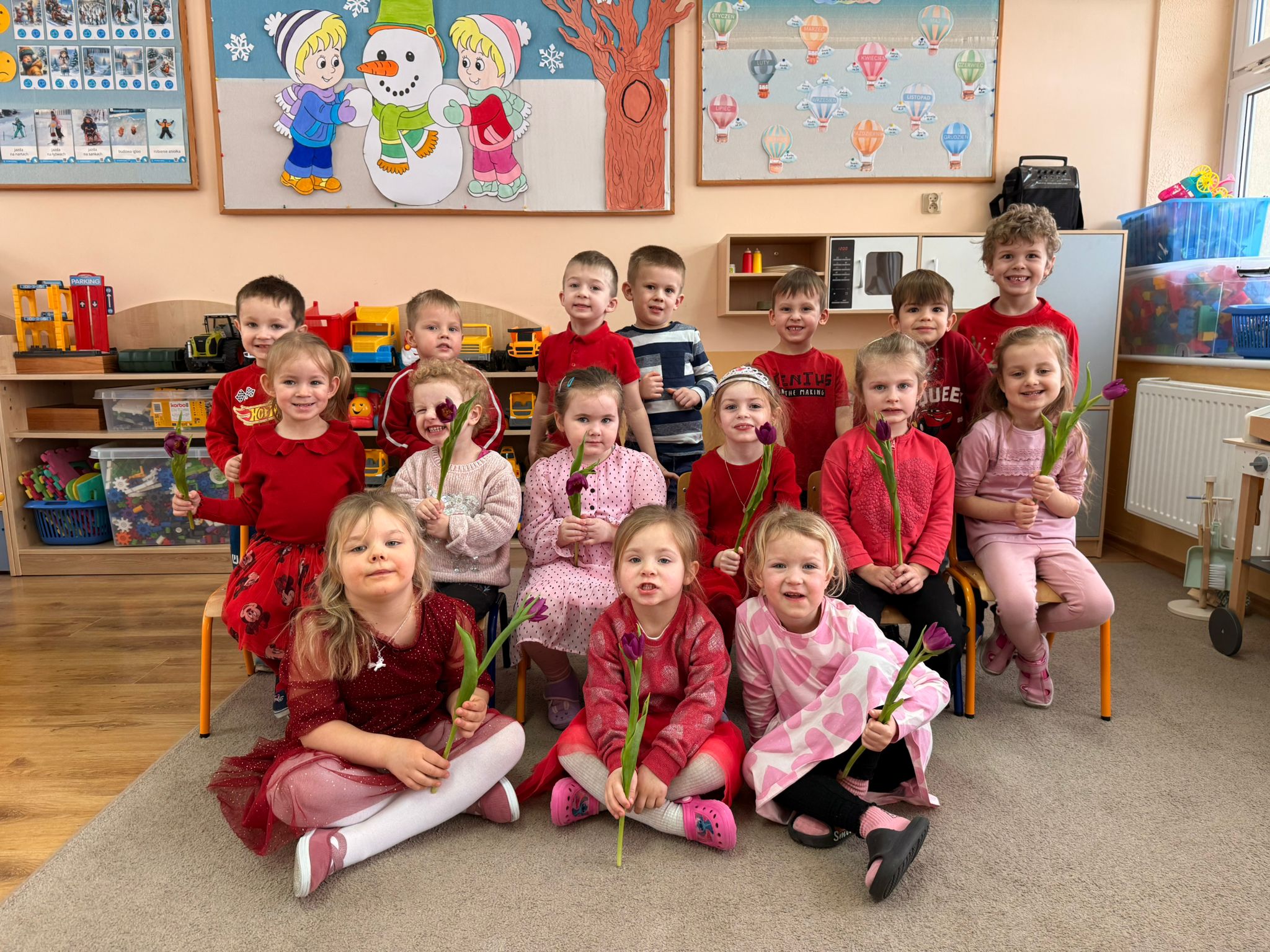 Dzisiejszy dzień w naszej szkole upłynął w wyjątkowo ciepłej, radosnej i pachnącej atmosferze. Świętowaliśmy Walentynki w prawdziwie kreatywnym stylu. Już od samego rana było kolorowo- maluchy przyszły do przedszkola ubrane w odcieniach czerwieni i różu, wprowadzając wszystkich w romantyczny, pełen uśmiechu nastrój. Nie zabrakło miłych niespodzianek- dziewczynki otrzymały kwiatki, a wszystkie dzieci otrzymały słodkie lizaczki w kształcie serca.