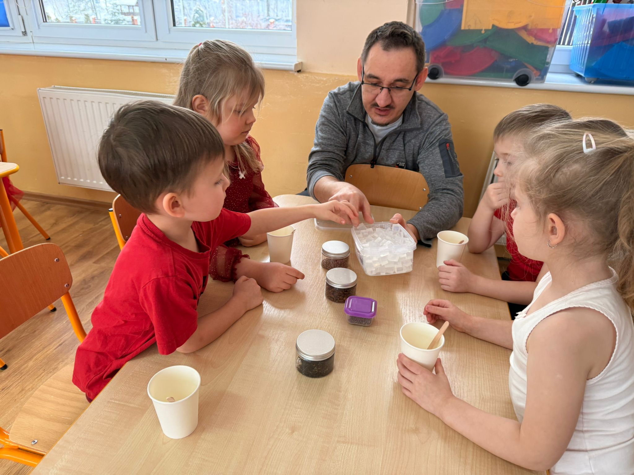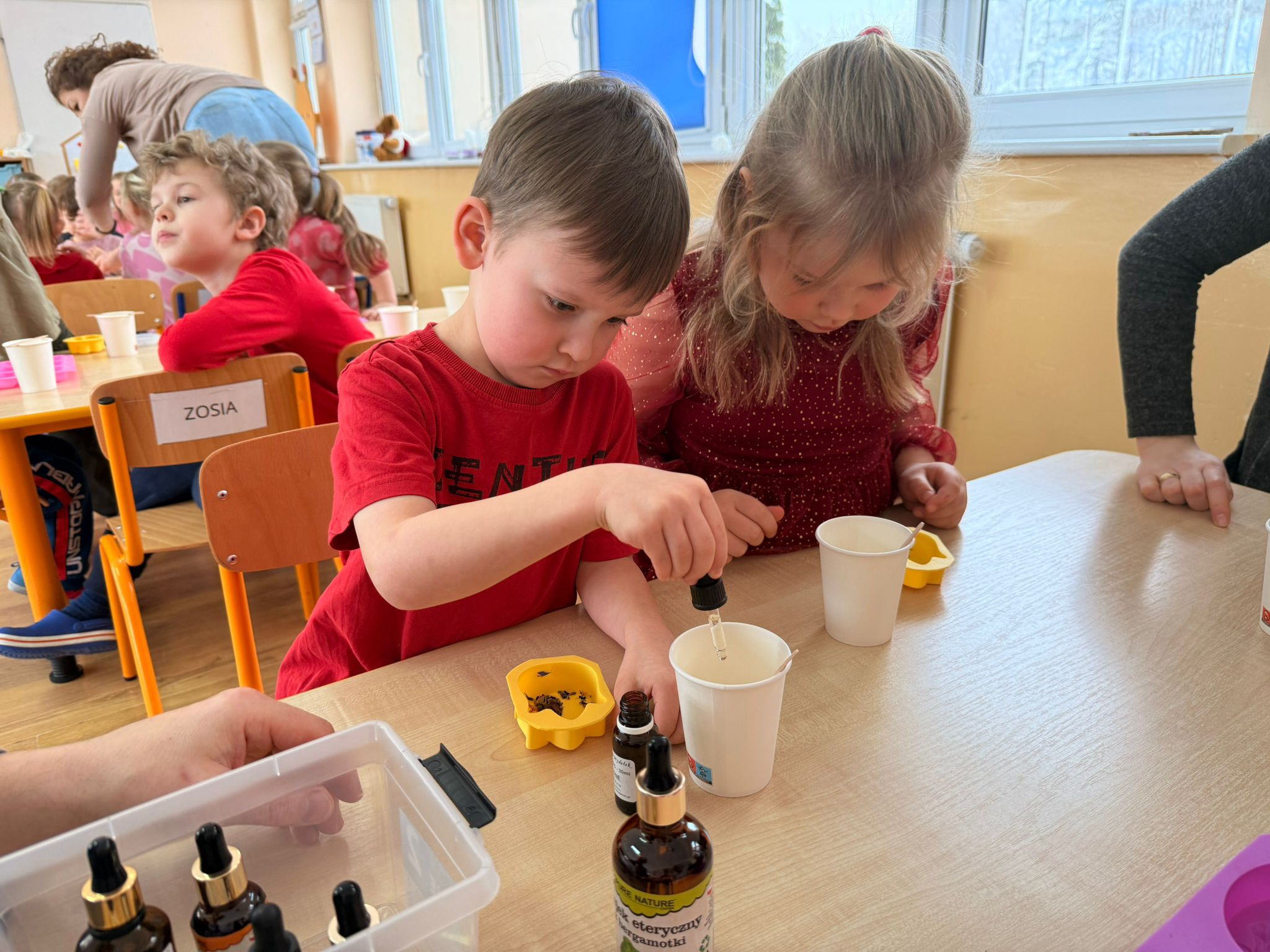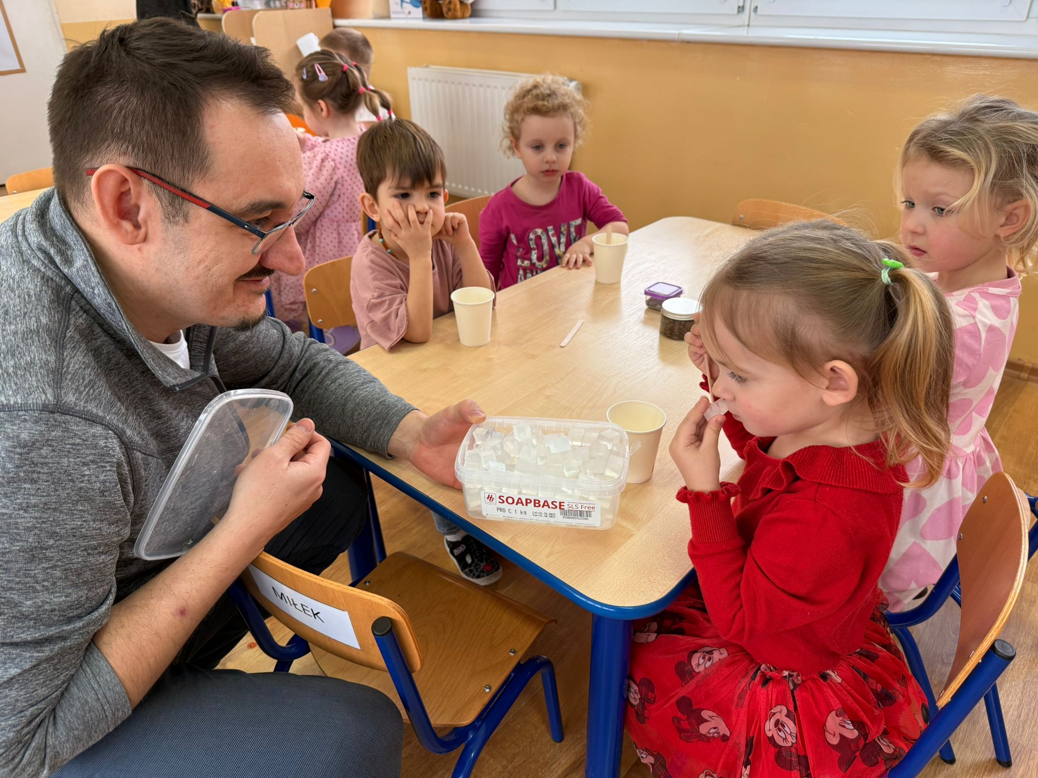 Największą atrakcją tego dnia były jednak warsztaty robienia mydełek, które poprowadzili rodzice Antka - pani Honorata i pan Tomek Jakusz. Dzięki nim dzieci mogły przenieść się w świat zapachów, kolorów i twórczej zabawy.