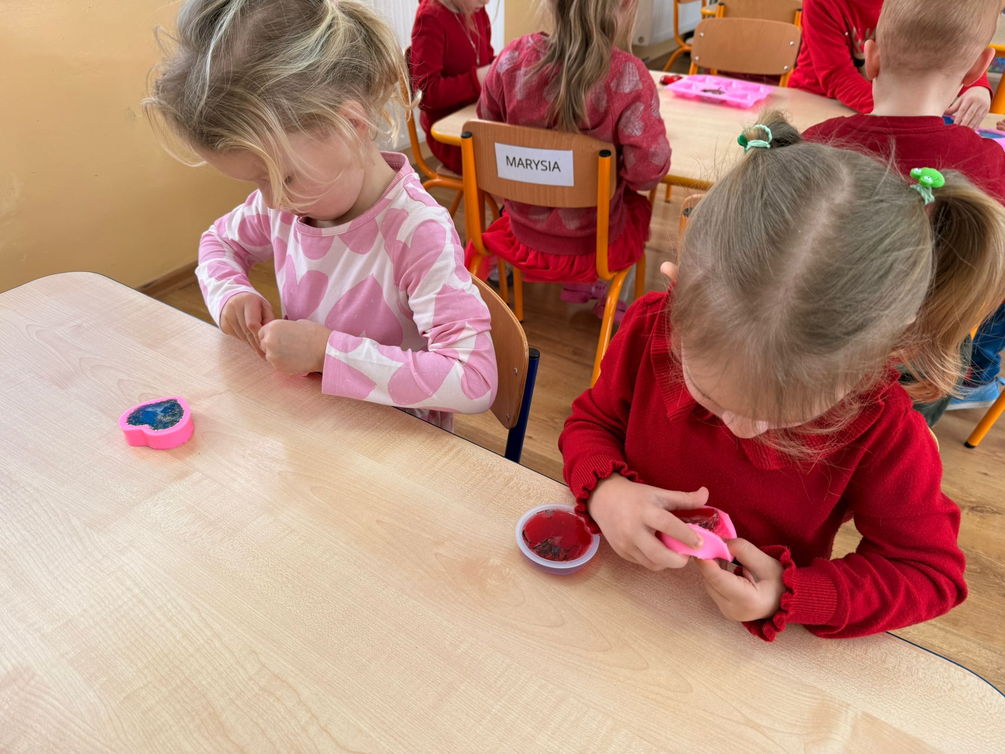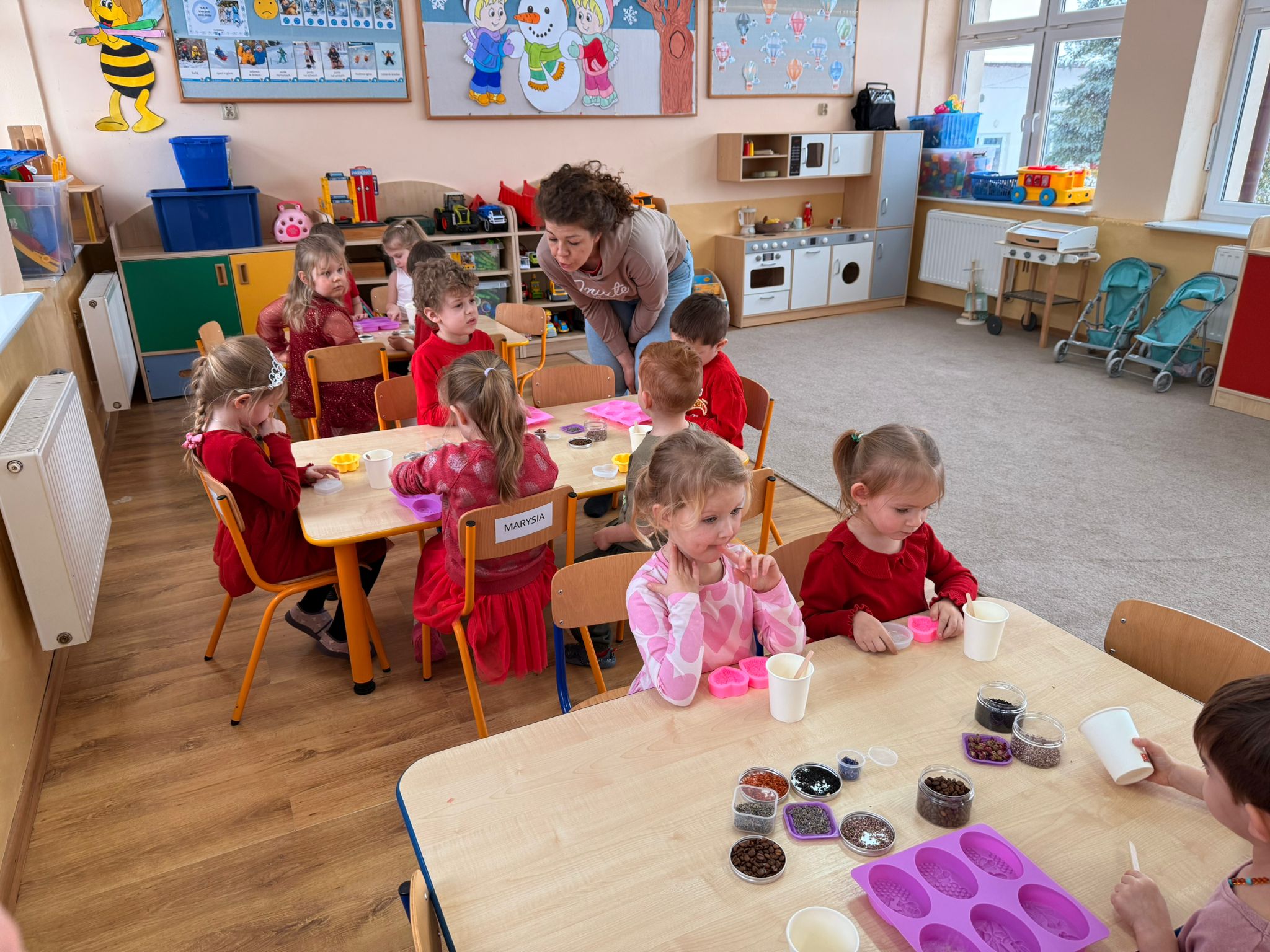 Podczas krótkiej części teoretycznej maluchy dowiedziały się, jak powstaje mydło oraz jakie składniki są potrzebne do jego wykonania. Następnie z ogromnym entuzjazmem przystąpiły do działania. Każde dziecko wybrało własną foremkę, ulubiony aromat oraz barwnik, tworząc niepowtarzalne kompozycje. Do foremek trafiły również naturalne dodatki, takie jak płatki róż, kawa, lawenda czy chaber. Po zalaniu przygotowaną masą i jej zastygnięciu, gotowe mydełka zostały zapakowane w ozdobne woreczki - idealne jako walentynkowy upominek dla bliskich. Na koniec dzieci wykonały sobie pamiątkowe zdjęcie w fotobudce.