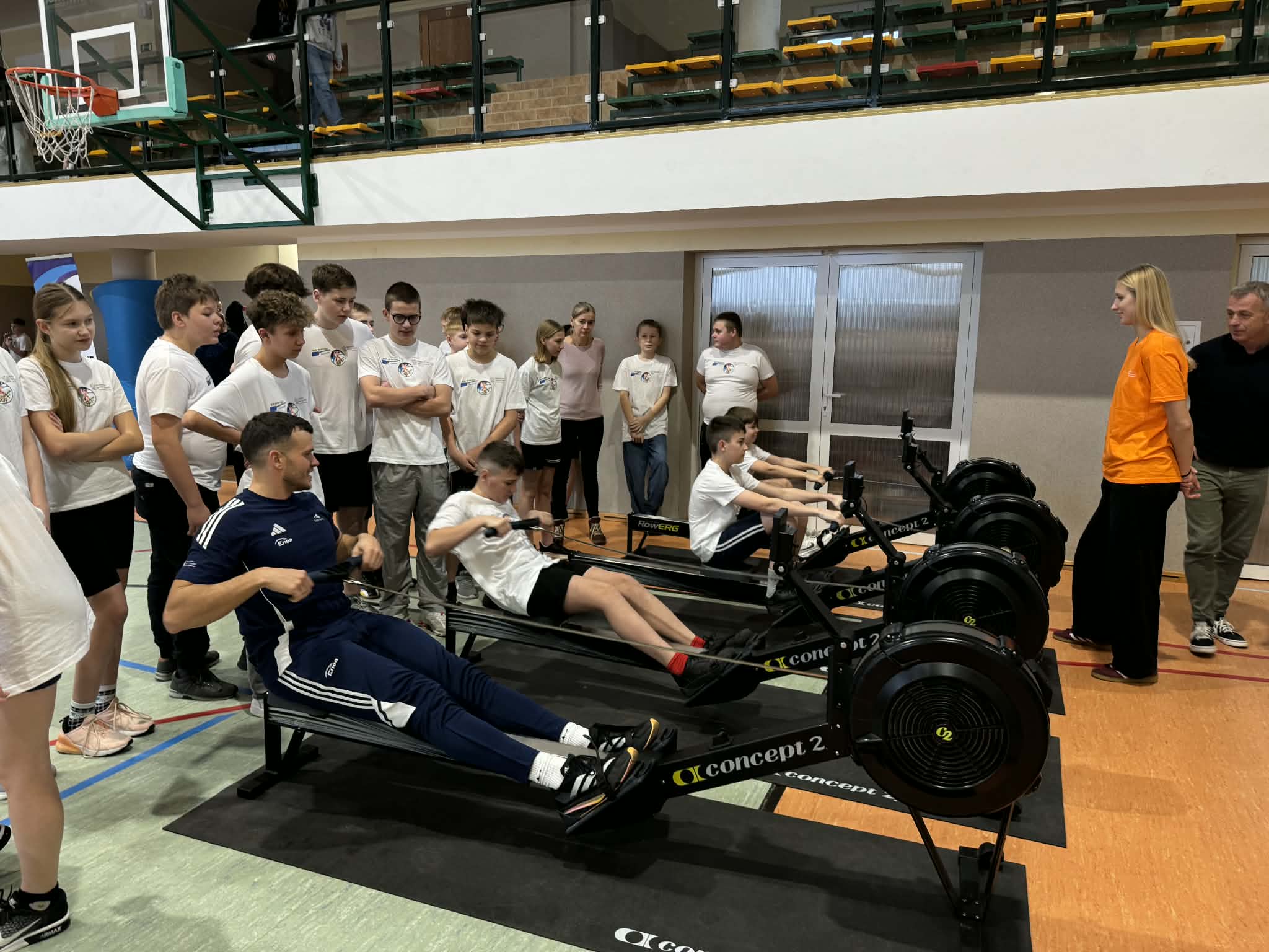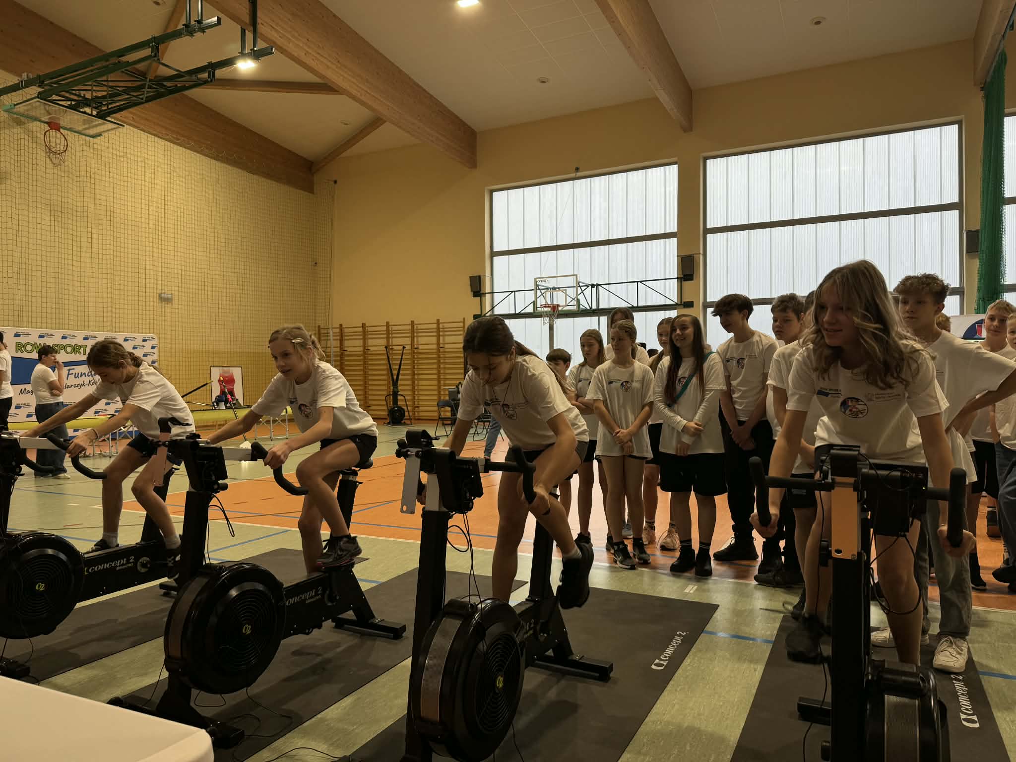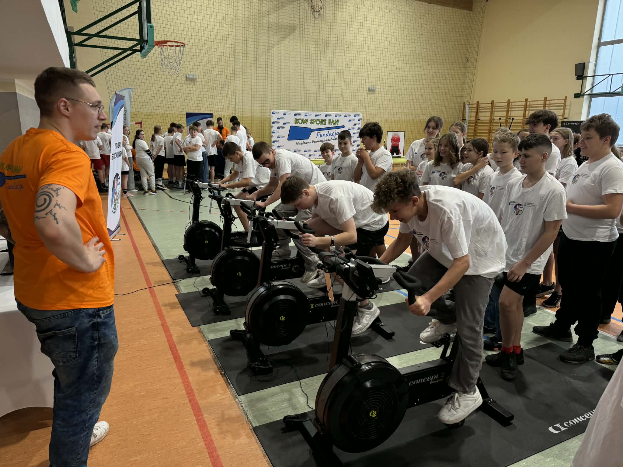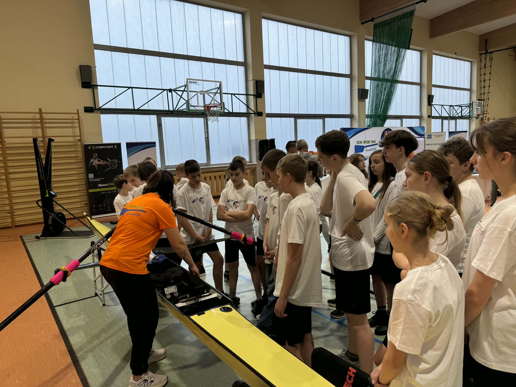 Zajęcia zorganizowano w formie pięciu stacji tematycznych, obejmujących m.in. ćwiczenia na rowerach stacjonarnych, stację ogólnorozwojową, prezentację łodzi wioślarskiej, naukę techniki wiosłowania oraz zagadnienia związane z edukacją żywieniową. Uczniowie chętnie i aktywnie uczestniczyli w zajęciach, wykazując się dużym zaangażowaniem.