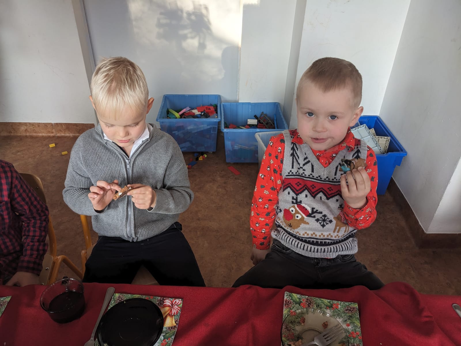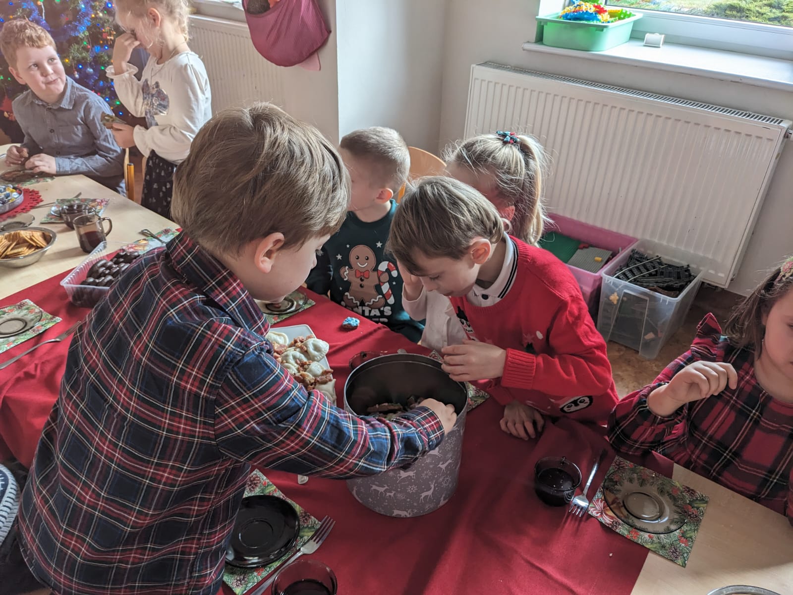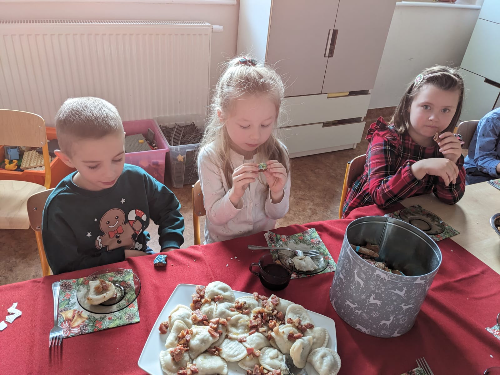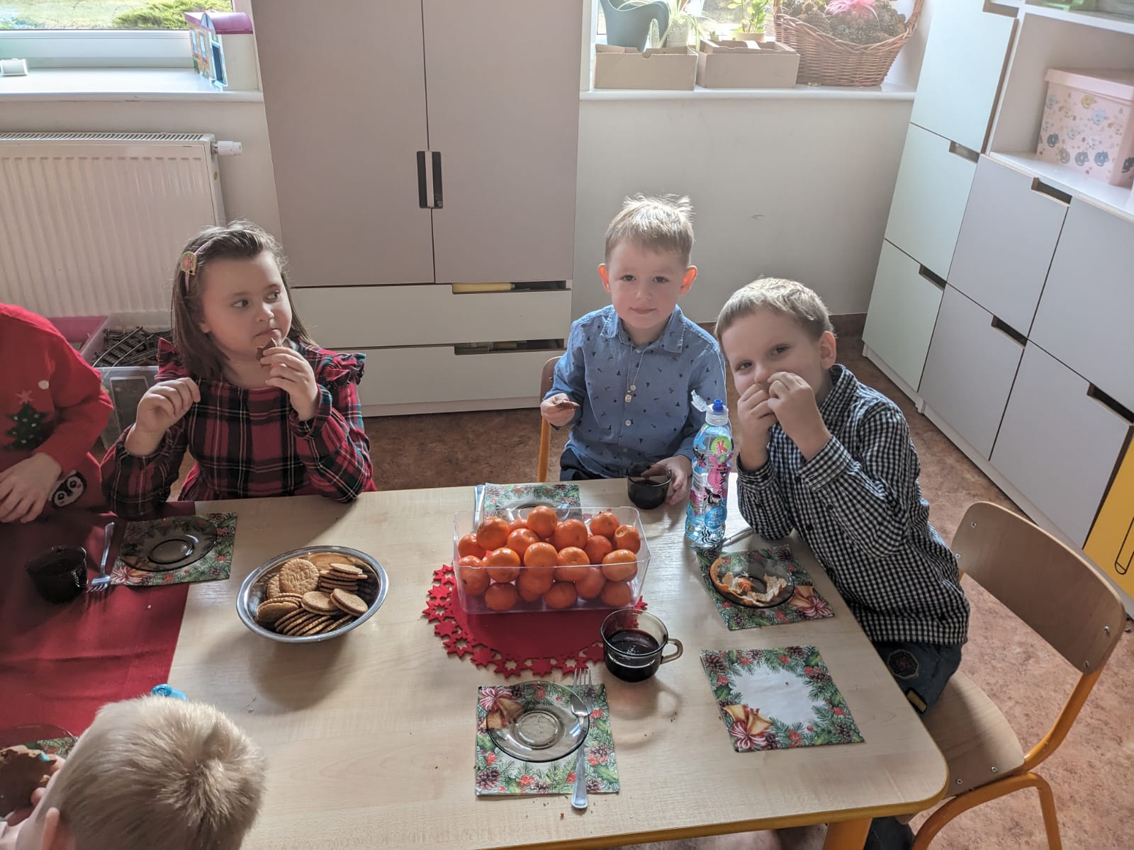 Teraz mogliśmy przygotować nasz wigilijny stół, na którym znalazły się tradycyjne potrawy: barszcz czerwony, pierogi z kapustą i grzybami oraz pierniczki upieczone i ozdobione przez nas samych oraz jeszcze inne smakołyki przygotowane przez rodziców. Naszą Wigilię rozpoczęliśmy tradycyjnie czytaniem fragmentu Pisma Świętego o Bożym Narodzeniu z Ewangelii Św. Łukasza. Potem przełamaliśmy się opłatkiem jednocześnie składając sobie życzenia. Na stole przykrytym czerwonym obrusem z garstką sianka pod spodem ustawiliśmy o jedno nakrycie więcej. Jeszcze przed konsumpcją zaśpiewaliśmy dwie znane dzieciom kolędy, czyli „Pójdźmy wszyscy do stajenki” i „Dzisiaj w Betlejem”.