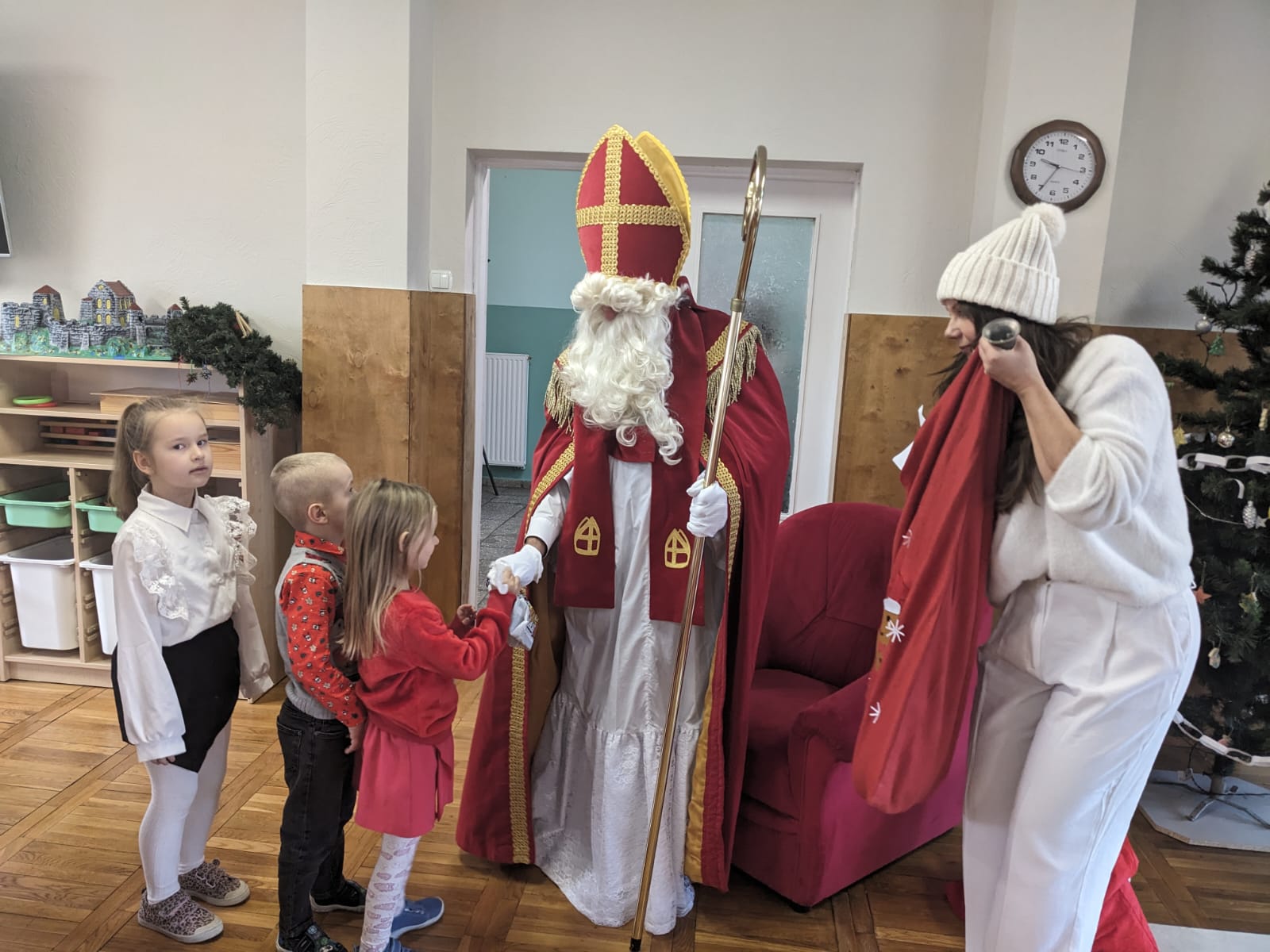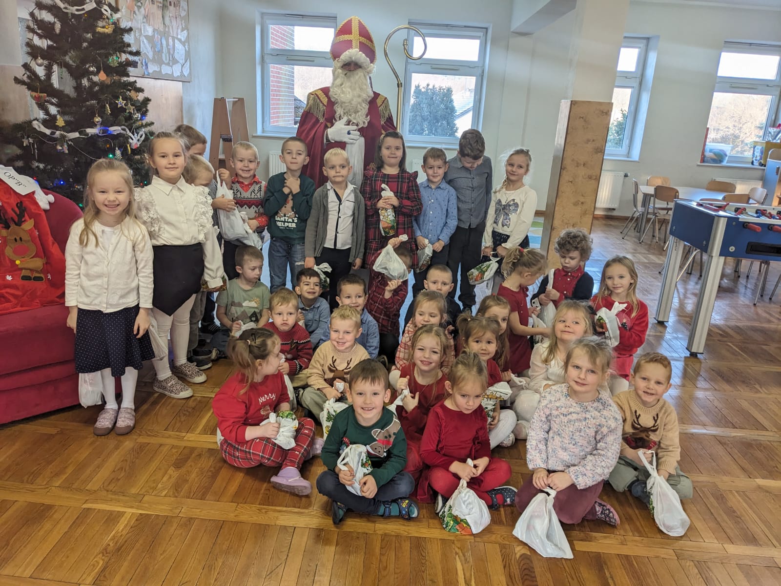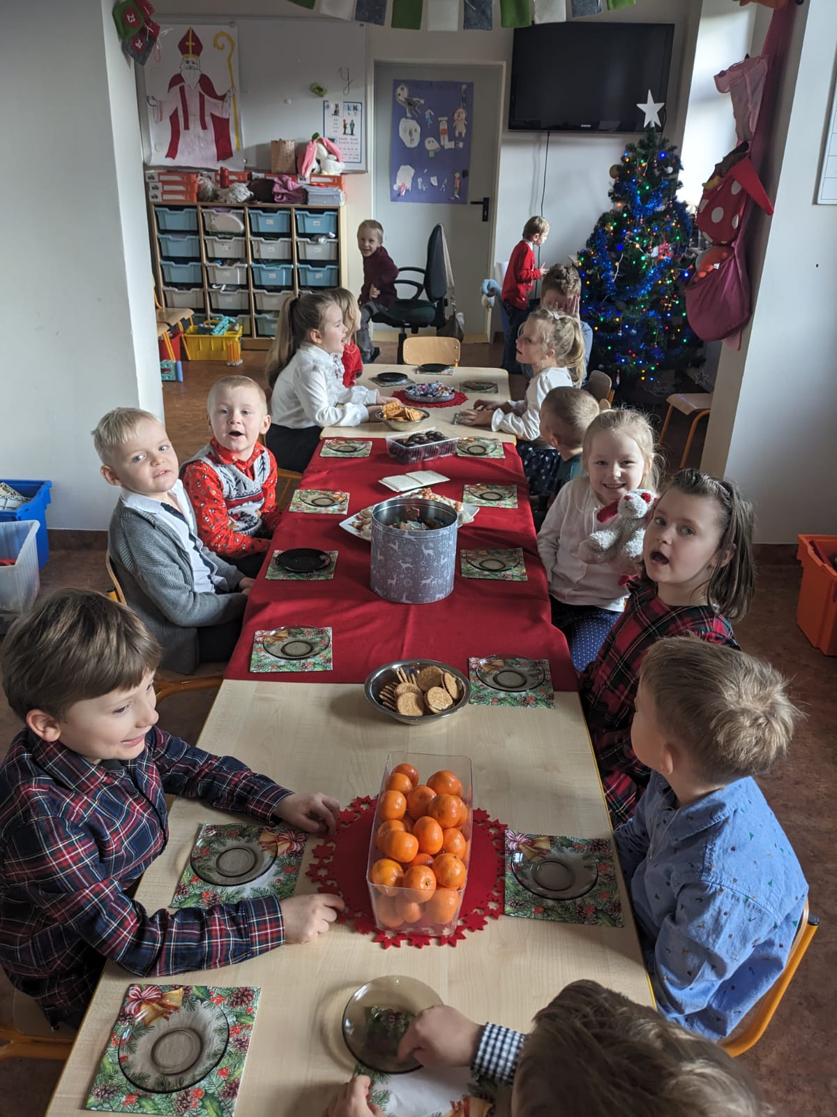 19 grudnia, tradycyjnie w szkole, w ostatni dzień przed przerwą świąteczną, organizowane są wigilie grupowe. Nasza Wigilia rozpoczęła się raczej nietypowo-my na początek mieliśmy odwiedziny niezwykłego gościa. Prosto z Laponii, z Rovaniemi, przyjechał do nas Św. Mikołaj. Powitaliśmy go świąteczną instrumentacją. On wręczył każdemu dziecku prezent, a w podziękowaniu „starszaki” zaśpiewały piosenkę pt. „Święta białe jak opłatek”, której tekst stanowią życzenia świąteczne.