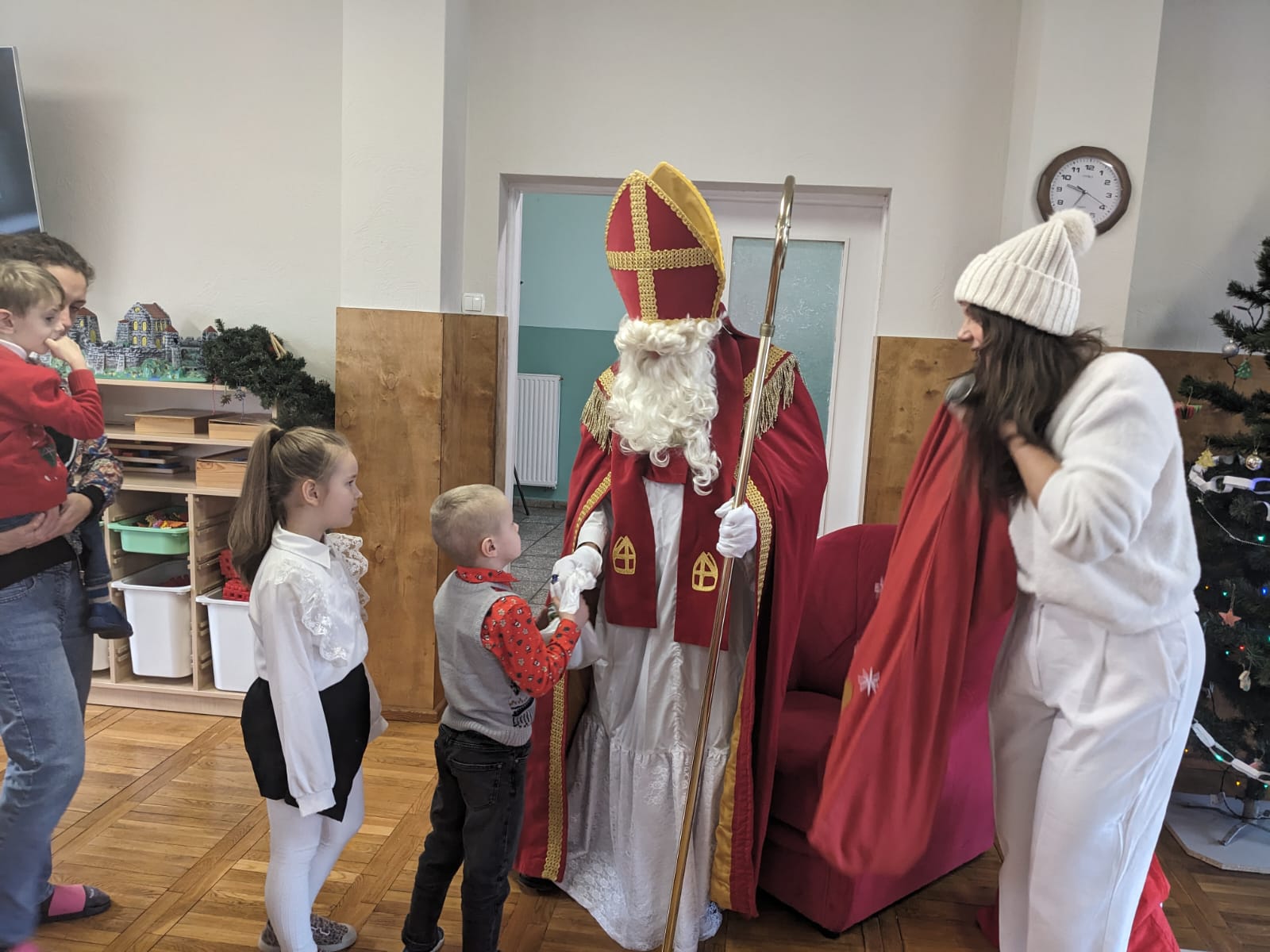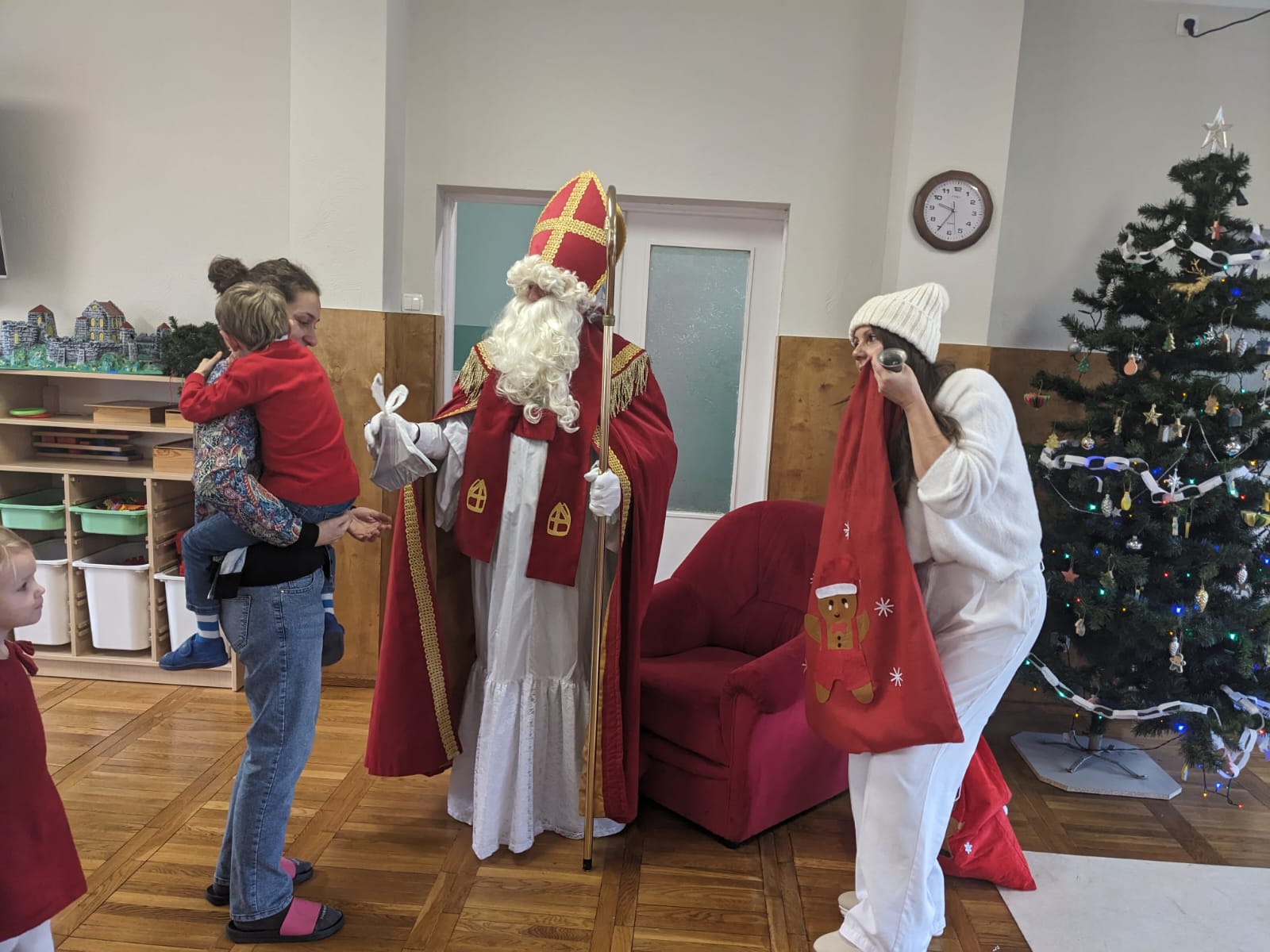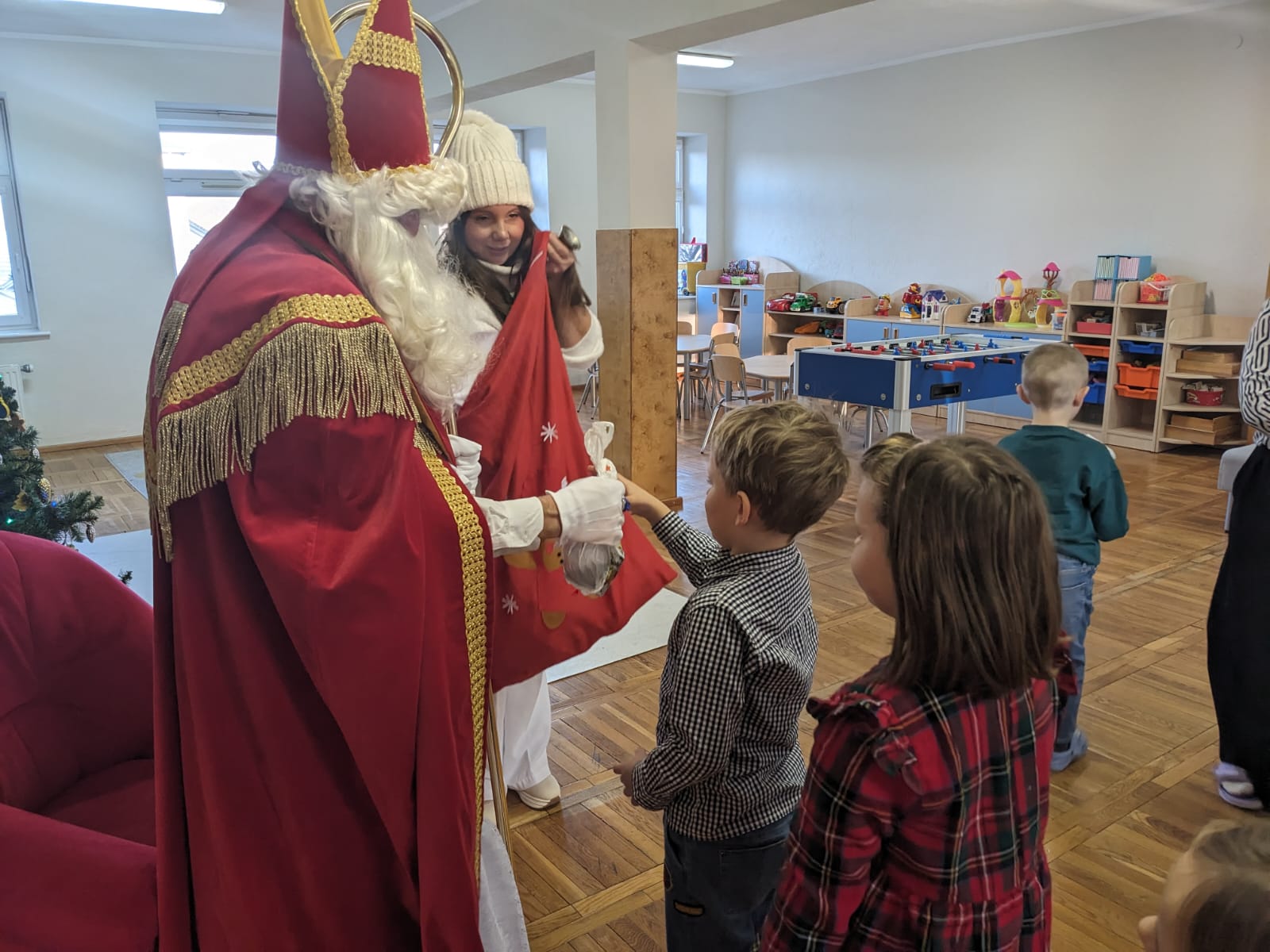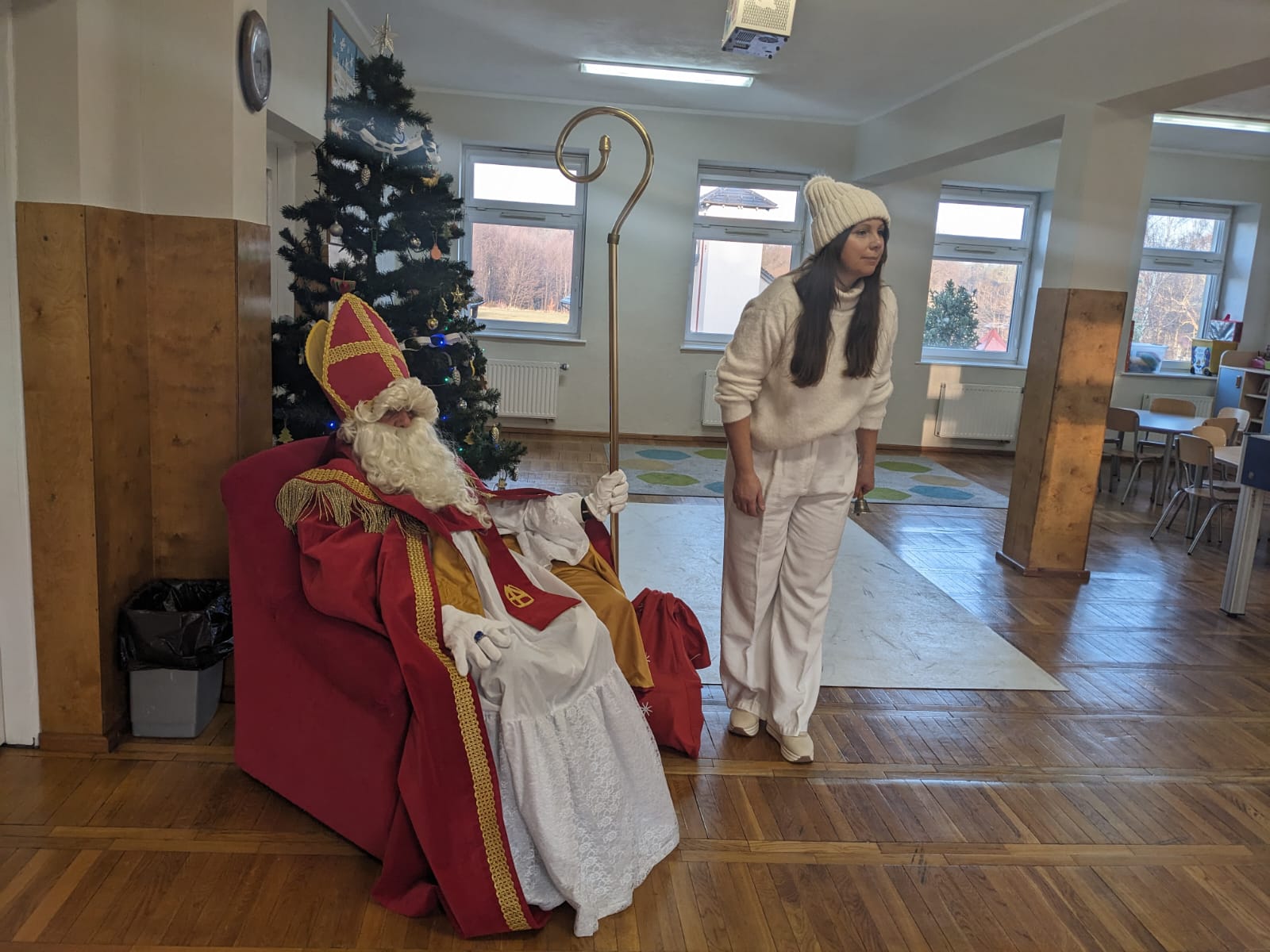 19 grudnia, tradycyjnie w szkole, w ostatni dzień przed przerwą świąteczną, organizowane są wigilie grupowe. Nasza Wigilia rozpoczęła się raczej nietypowo-my na początek mieliśmy odwiedziny niezwykłego gościa. Prosto z Laponii, z Rovaniemi, przyjechał do nas Św. Mikołaj. Powitaliśmy go świąteczną instrumentacją. On wręczył każdemu dziecku prezent, a w podziękowaniu „starszaki” zaśpiewały piosenkę pt. „Święta białe jak opłatek”, której tekst stanowią życzenia świąteczne.